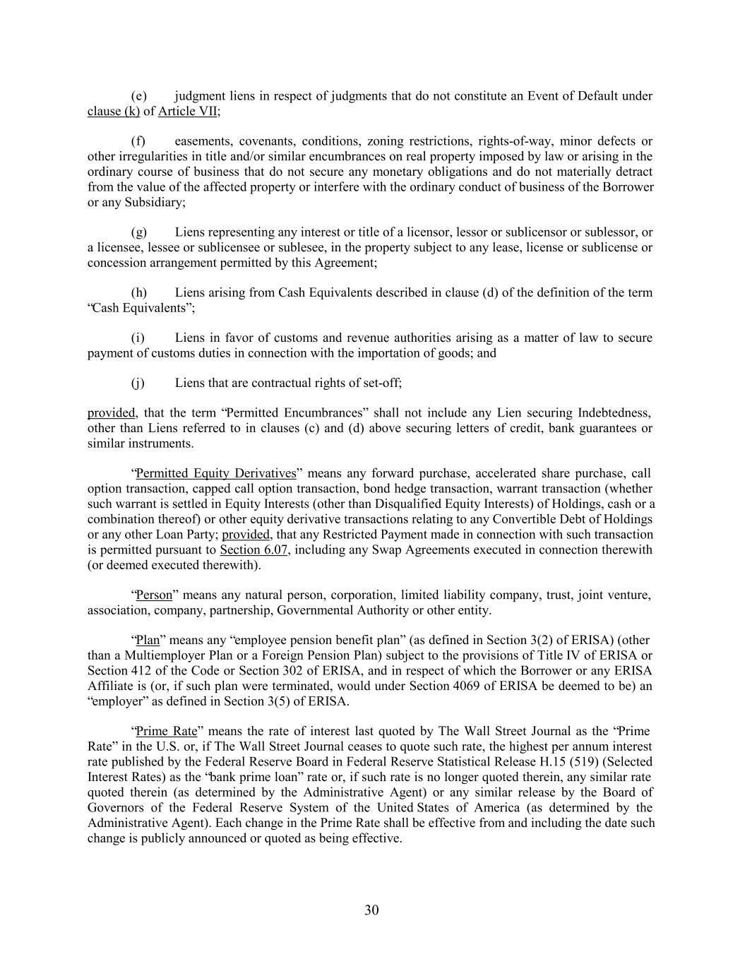 (e) judgment liens in respect of judgments that do not constitute an Event of Default under clause (k) of Article VII; (f) easements, covenants, conditions, zoning restrictions, rights-of-way, minor defects or other irregularities in title and/or similar encumbrances on real property imposed by law or arising in the ordinary course of business that do not secure any monetary obligations and do not materially detract from the value of the affected property or interfere with the ordinary conduct of business of the Borrower or any Subsidiary; (g) Liens representing any interest or title of a licensor, lessor or sublicensor or sublessor, or a licensee, lessee or sublicensee or sublesee, in the property subject to any lease, license or sublicense or concession arrangement permitted by this Agreement; (h) Liens arising from Cash Equivalents described in clause (d) of the definition of the term “Cash Equivalents”; (i) Liens in favor of customs and revenue authorities arising as a matter of law to secure payment of customs duties in connection with the importation of goods; and (j) Liens that are contractual rights of set-off; provided, that the term “Permitted Encumbrances” shall not include any Lien securing Indebtedness, other than Liens referred to in clauses (c) and (d) above securing letters of credit, bank guarantees or similar instruments. “Permitted Equity Derivatives” means any forward purchase, accelerated share purchase, call option transaction, capped call option transaction, bond hedge transaction, warrant transaction (whether such warrant is settled in Equity Interests (other than Disqualified Equity Interests) of Holdings, cash or a combination thereof) or other equity derivative transactions relating to any Convertible Debt of Holdings or any other Loan Party; provided, that any Restricted Payment made in connection with such transaction is permitted pursuant to Section 6.07, including any Swap Agreements executed in connection therewith (or deemed executed therewith). “Person” means any natural person, corporation, limited liability company, trust, joint venture, association, company, partnership, Governmental Authority or other entity. “Plan” means any “employee pension benefit plan” (as defined in Section 3(2) of ERISA) (other than a Multiemployer Plan or a Foreign Pension Plan) subject to the provisions of Title IV of ERISA or Section 412 of the Code or Section 302 of ERISA, and in respect of which the Borrower or any ERISA Affiliate is (or, if such plan were terminated, would under Section 4069 of ERISA be deemed to be) an “employer” as defined in Section 3(5) of ERISA. “Prime Rate” means the rate of interest last quoted by The Wall Street Journal as the “Prime Rate” in the U.S. or, if The Wall Street Journal ceases to quote such rate, the highest per annum interest rate published by the Federal Reserve Board in Federal Reserve Statistical Release H.15 (519) (Selected Interest Rates) as the “bank prime loan” rate or, if such rate is no longer quoted therein, any similar rate quoted therein (as determined by the Administrative Agent) or any similar release by the Board of Governors of the Federal Reserve System of the United States of America (as determined by the Administrative Agent). Each change in the Prime Rate shall be effective from and including the date such change is publicly announced or quoted as being effective. 30