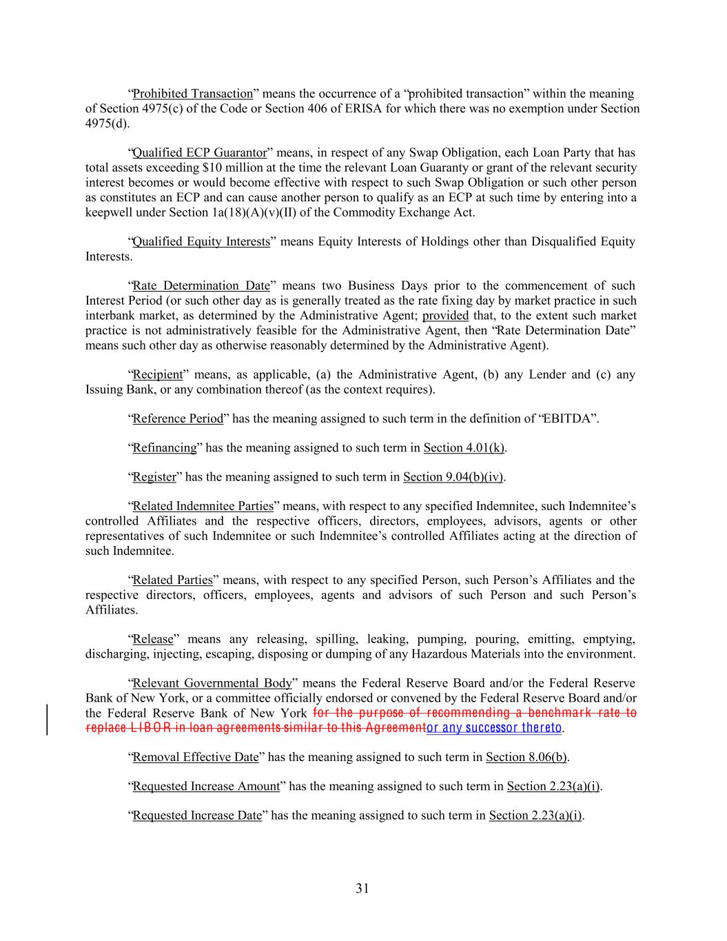“Prohibited Transaction” means the occurrence of a “prohibited transaction” within the meaning of Section 4975(c) of the Code or Section 406 of ERISA for which there was no exemption under Section 4975(d). “Qualified ECP Guarantor” means, in respect of any Swap Obligation, each Loan Party that has total assets exceeding $10 million at the time the relevant Loan Guaranty or grant of the relevant security interest becomes or would become effective with respect to such Swap Obligation or such other person as constitutes an ECP and can cause another person to qualify as an ECP at such time by entering into a keepwell under Section 1a(18)(A)(v)(II) of the Commodity Exchange Act. “Qualified Equity Interests” means Equity Interests of Holdings other than Disqualified Equity Interests. “Rate Determination Date” means two Business Days prior to the commencement of such Interest Period (or such other day as is generally treated as the rate fixing day by market practice in such interbank market, as determined by the Administrative Agent; provided that, to the extent such market practice is not administratively feasible for the Administrative Agent, then “Rate Determination Date” means such other day as otherwise reasonably determined by the Administrative Agent). “Recipient” means, as applicable, (a) the Administrative Agent, (b) any Lender and (c) any Issuing Bank, or any combination thereof (as the context requires). “Reference Period” has the meaning assigned to such term in the definition of “EBITDA”. “Refinancing” has the meaning assigned to such term in Section 4.01(k). “Register” has the meaning assigned to such term in Section 9.04(b)(iv). “Related Indemnitee Parties” means, with respect to any specified Indemnitee, such Indemnitee’s controlled Affiliates and the respective officers, directors, employees, advisors, agents or other representatives of such Indemnitee or such Indemnitee’s controlled Affiliates acting at the direction of such Indemnitee. “Related Parties” means, with respect to any specified Person, such Person’s Affiliates and the respective directors, officers, employees, agents and advisors of such Person and such Person’s Affiliates. “Release” means any releasing, spilling, leaking, pumping, pouring, emitting, emptying, discharging, injecting, escaping, disposing or dumping of any Hazardous Materials into the environment. “Relevant Governmental Body” means the Federal Reserve Board and/or the Federal Reserve Bank of New York, or a committee officially endorsed or convened by the Federal Reserve Board and/or the Federal Reserve Bank of New York for the purpose of recommending a benchmark rate to replace L IB O R in loan agreements similar to this Agreementor any successor thereto. “Removal Effective Date” has the meaning assigned to such term in Section 8.06(b). “Requested Increase Amount” has the meaning assigned to such term in Section 2.23(a)(i). “Requested Increase Date” has the meaning assigned to such term in Section 2.23(a)(i). 31