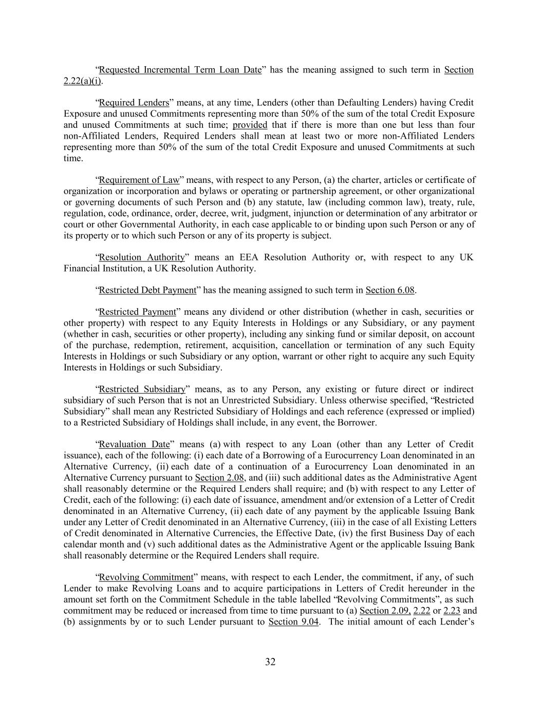 “Requested Incremental Term Loan Date” has the meaning assigned to such term in Section 2.22(a)(i). “Required Lenders” means, at any time, Lenders (other than Defaulting Lenders) having Credit Exposure and unused Commitments representing more than 50% of the sum of the total Credit Exposure and unused Commitments at such time; provided that if there is more than one but less than four non-Affiliated Lenders, Required Lenders shall mean at least two or more non-Affiliated Lenders representing more than 50% of the sum of the total Credit Exposure and unused Commitments at such time. “Requirement of Law” means, with respect to any Person, (a) the charter, articles or certificate of organization or incorporation and bylaws or operating or partnership agreement, or other organizational or governing documents of such Person and (b) any statute, law (including common law), treaty, rule, regulation, code, ordinance, order, decree, writ, judgment, injunction or determination of any arbitrator or court or other Governmental Authority, in each case applicable to or binding upon such Person or any of its property or to which such Person or any of its property is subject. “Resolution Authority” means an EEA Resolution Authority or, with respect to any UK Financial Institution, a UK Resolution Authority. “Restricted Debt Payment” has the meaning assigned to such term in Section 6.08. “Restricted Payment” means any dividend or other distribution (whether in cash, securities or other property) with respect to any Equity Interests in Holdings or any Subsidiary, or any payment (whether in cash, securities or other property), including any sinking fund or similar deposit, on account of the purchase, redemption, retirement, acquisition, cancellation or termination of any such Equity Interests in Holdings or such Subsidiary or any option, warrant or other right to acquire any such Equity Interests in Holdings or such Subsidiary. “Restricted Subsidiary” means, as to any Person, any existing or future direct or indirect subsidiary of such Person that is not an Unrestricted Subsidiary. Unless otherwise specified, “Restricted Subsidiary” shall mean any Restricted Subsidiary of Holdings and each reference (expressed or implied) to a Restricted Subsidiary of Holdings shall include, in any event, the Borrower. “Revaluation Date” means (a) with respect to any Loan (other than any Letter of Credit issuance), each of the following: (i) each date of a Borrowing of a Eurocurrency Loan denominated in an Alternative Currency, (ii) each date of a continuation of a Eurocurrency Loan denominated in an Alternative Currency pursuant to Section 2.08, and (iii) such additional dates as the Administrative Agent shall reasonably determine or the Required Lenders shall require; and (b) with respect to any Letter of Credit, each of the following: (i) each date of issuance, amendment and/or extension of a Letter of Credit denominated in an Alternative Currency, (ii) each date of any payment by the applicable Issuing Bank under any Letter of Credit denominated in an Alternative Currency, (iii) in the case of all Existing Letters of Credit denominated in Alternative Currencies, the Effective Date, (iv) the first Business Day of each calendar month and (v) such additional dates as the Administrative Agent or the applicable Issuing Bank shall reasonably determine or the Required Lenders shall require. “Revolving Commitment” means, with respect to each Lender, the commitment, if any, of such Lender to make Revolving Loans and to acquire participations in Letters of Credit hereunder in the amount set forth on the Commitment Schedule in the table labelled “Revolving Commitments”, as such commitment may be reduced or increased from time to time pursuant to (a) Section 2.09, 2.22 or 2.23 and (b) assignments by or to such Lender pursuant to Section 9.04. The initial amount of each Lender’s 32