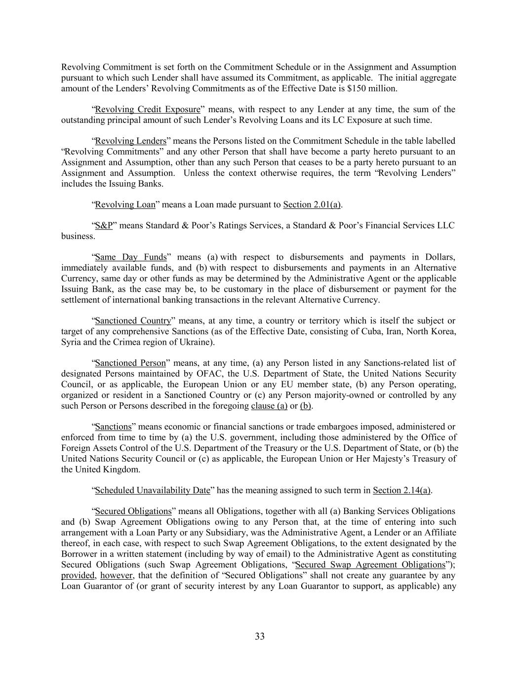 Revolving Commitment is set forth on the Commitment Schedule or in the Assignment and Assumption pursuant to which such Lender shall have assumed its Commitment, as applicable. The initial aggregate amount of the Lenders’ Revolving Commitments as of the Effective Date is $150 million. “Revolving Credit Exposure” means, with respect to any Lender at any time, the sum of the outstanding principal amount of such Lender’s Revolving Loans and its LC Exposure at such time. “Revolving Lenders” means the Persons listed on the Commitment Schedule in the table labelled “Revolving Commitments” and any other Person that shall have become a party hereto pursuant to an Assignment and Assumption, other than any such Person that ceases to be a party hereto pursuant to an Assignment and Assumption. Unless the context otherwise requires, the term “Revolving Lenders” includes the Issuing Banks. “Revolving Loan” means a Loan made pursuant to Section 2.01(a). “S&P” means Standard & Poor’s Ratings Services, a Standard & Poor’s Financial Services LLC business. “Same Day Funds” means (a) with respect to disbursements and payments in Dollars, immediately available funds, and (b) with respect to disbursements and payments in an Alternative Currency, same day or other funds as may be determined by the Administrative Agent or the applicable Issuing Bank, as the case may be, to be customary in the place of disbursement or payment for the settlement of international banking transactions in the relevant Alternative Currency. “Sanctioned Country” means, at any time, a country or territory which is itself the subject or target of any comprehensive Sanctions (as of the Effective Date, consisting of Cuba, Iran, North Korea, Syria and the Crimea region of Ukraine). “Sanctioned Person” means, at any time, (a) any Person listed in any Sanctions-related list of designated Persons maintained by OFAC, the U.S. Department of State, the United Nations Security Council, or as applicable, the European Union or any EU member state, (b) any Person operating, organized or resident in a Sanctioned Country or (c) any Person majority-owned or controlled by any such Person or Persons described in the foregoing clause (a) or (b). “Sanctions” means economic or financial sanctions or trade embargoes imposed, administered or enforced from time to time by (a) the U.S. government, including those administered by the Office of Foreign Assets Control of the U.S. Department of the Treasury or the U.S. Department of State, or (b) the United Nations Security Council or (c) as applicable, the European Union or Her Majesty’s Treasury of the United Kingdom. “Scheduled Unavailability Date” has the meaning assigned to such term in Section 2.14(a). “Secured Obligations” means all Obligations, together with all (a) Banking Services Obligations and (b) Swap Agreement Obligations owing to any Person that, at the time of entering into such arrangement with a Loan Party or any Subsidiary, was the Administrative Agent, a Lender or an Affiliate thereof, in each case, with respect to such Swap Agreement Obligations, to the extent designated by the Borrower in a written statement (including by way of email) to the Administrative Agent as constituting Secured Obligations (such Swap Agreement Obligations, “Secured Swap Agreement Obligations”); provided, however, that the definition of “Secured Obligations” shall not create any guarantee by any Loan Guarantor of (or grant of security interest by any Loan Guarantor to support, as applicable) any 33
