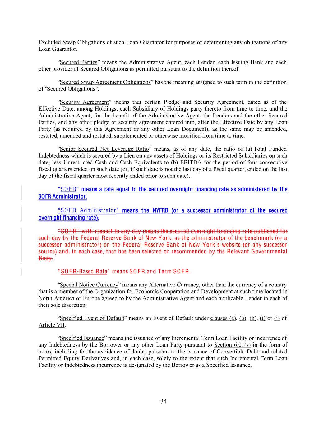 Excluded Swap Obligations of such Loan Guarantor for purposes of determining any obligations of any Loan Guarantor. “Secured Parties” means the Administrative Agent, each Lender, each Issuing Bank and each other provider of Secured Obligations as permitted pursuant to the definition thereof. “Secured Swap Agreement Obligations” has the meaning assigned to such term in the definition of “Secured Obligations”. “Security Agreement” means that certain Pledge and Security Agreement, dated as of the Effective Date, among Holdings, each Subsidiary of Holdings party thereto from time to time, and the Administrative Agent, for the benefit of the Administrative Agent, the Lenders and the other Secured Parties, and any other pledge or security agreement entered into, after the Effective Date by any Loan Party (as required by this Agreement or any other Loan Document), as the same may be amended, restated, amended and restated, supplemented or otherwise modified from time to time. “Senior Secured Net Leverage Ratio” means, as of any date, the ratio of (a) Total Funded Indebtedness which is secured by a Lien on any assets of Holdings or its Restricted Subsidiaries on such date, less Unrestricted Cash and Cash Equivalents to (b) EBITDA for the period of four consecutive fiscal quarters ended on such date (or, if such date is not the last day of a fiscal quarter, ended on the last day of the fiscal quarter most recently ended prior to such date). “SO F R” means a rate equal to the secured overnight financing rate as administered by the SOFR Administrator. “SO F R Administrator” means the NYFRB (or a successor administrator of the secured overnight financing rate). “SO F R” with respect to any day means the secured overnight financing rate published for such day by the F ederal Reserve Bank of New York , as the administrator of the benchmark (or a successor administrator) on the F ederal Reserve Bank of New York ’s website (or any successor source) and, in each case, that has been selected or recommended by the Relevant Governmental Body. “SO F R-Based Rate” means SO F R and Term SO F R . “Special Notice Currency” means any Alternative Currency, other than the currency of a country that is a member of the Organization for Economic Cooperation and Development at such time located in North America or Europe agreed to by the Administrative Agent and each applicable Lender in each of their sole discretion. “Specified Event of Default” means an Event of Default under clauses (a), (b), (h), (i) or (j) of Article VII. “Specified Issuance” means the issuance of any Incremental Term Loan Facility or incurrence of any Indebtedness by the Borrower or any other Loan Party pursuant to Section 6.01(s) in the form of notes, including for the avoidance of doubt, pursuant to the issuance of Convertible Debt and related Permitted Equity Derivatives and, in each case, solely to the extent that such Incremental Term Loan Facility or Indebtedness incurrence is designated by the Borrower as a Specified Issuance. 34