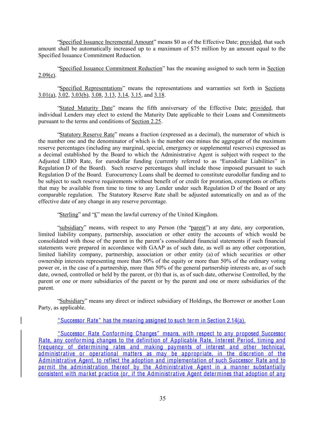 “Specified Issuance Incremental Amount” means $0 as of the Effective Date; provided, that such amount shall be automatically increased up to a maximum of $75 million by an amount equal to the Specified Issuance Commitment Reduction. “Specified Issuance Commitment Reduction” has the meaning assigned to such term in Section 2.09(e). “Specified Representations” means the representations and warranties set forth in Sections 3.01(a), 3.02, 3.03(b), 3.08, 3.13, 3.14, 3.15, and 3.18. “Stated Maturity Date” means the fifth anniversary of the Effective Date; provided, that individual Lenders may elect to extend the Maturity Date applicable to their Loans and Commitments pursuant to the terms and conditions of Section 2.25. “Statutory Reserve Rate” means a fraction (expressed as a decimal), the numerator of which is the number one and the denominator of which is the number one minus the aggregate of the maximum reserve percentages (including any marginal, special, emergency or supplemental reserves) expressed as a decimal established by the Board to which the Administrative Agent is subject with respect to the Adjusted LIBO Rate, for eurodollar funding (currently referred to as “Eurodollar Liabilities” in Regulation D of the Board). Such reserve percentages shall include those imposed pursuant to such Regulation D of the Board. Eurocurrency Loans shall be deemed to constitute eurodollar funding and to be subject to such reserve requirements without benefit of or credit for proration, exemptions or offsets that may be available from time to time to any Lender under such Regulation D of the Board or any comparable regulation. The Statutory Reserve Rate shall be adjusted automatically on and as of the effective date of any change in any reserve percentage. “Sterling” and “£” mean the lawful currency of the United Kingdom. “subsidiary” means, with respect to any Person (the “parent”) at any date, any corporation, limited liability company, partnership, association or other entity the accounts of which would be consolidated with those of the parent in the parent’s consolidated financial statements if such financial statements were prepared in accordance with GAAP as of such date, as well as any other corporation, limited liability company, partnership, association or other entity (a) of which securities or other ownership interests representing more than 50% of the equity or more than 50% of the ordinary voting power or, in the case of a partnership, more than 50% of the general partnership interests are, as of such date, owned, controlled or held by the parent, or (b) that is, as of such date, otherwise Controlled, by the parent or one or more subsidiaries of the parent or by the parent and one or more subsidiaries of the parent. “Subsidiary” means any direct or indirect subsidiary of Holdings, the Borrower or another Loan Party, as applicable. “Successor Rate” has the meaning assigned to such term in Section 2.14(a). “Successor Rate Conforming Changes” means, with respect to any proposed Successor Rate, any conforming changes to the definition of Applicable Rate, Interest Per iod, timing and frequency of determining rates and making payments of interest and other technical, administrative or operational matters as may be appropriate, in the discretion of the Administrative Agent, to reflect the adoption and implementation of such Successor Rate and to permit the administration thereof by the Administrative Agent in a manner substantially consistent with market practice (or , if the Administrative Agent determines that adoption of any 35