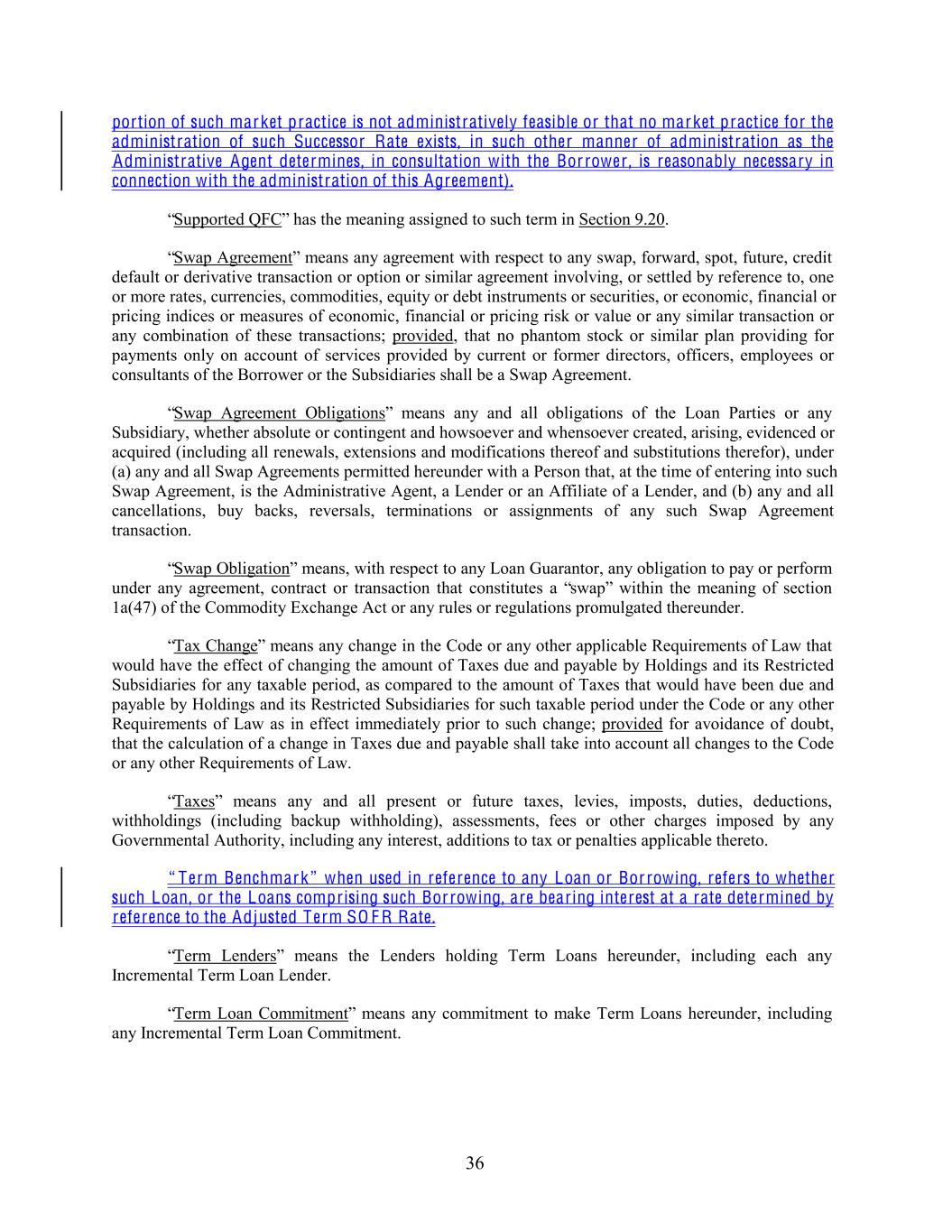 portion of such market practice is not administratively feasible or that no market practice for the administration of such Successor Rate exists, in such other manner of administration as the Administrative Agent determines, in consultation with the Bor rower , is reasonably necessary in connection with the administration of this Agreement). “Supported QFC” has the meaning assigned to such term in Section 9.20. “Swap Agreement” means any agreement with respect to any swap, forward, spot, future, credit default or derivative transaction or option or similar agreement involving, or settled by reference to, one or more rates, currencies, commodities, equity or debt instruments or securities, or economic, financial or pricing indices or measures of economic, financial or pricing risk or value or any similar transaction or any combination of these transactions; provided, that no phantom stock or similar plan providing for payments only on account of services provided by current or former directors, officers, employees or consultants of the Borrower or the Subsidiaries shall be a Swap Agreement. “Swap Agreement Obligations” means any and all obligations of the Loan Parties or any Subsidiary, whether absolute or contingent and howsoever and whensoever created, arising, evidenced or acquired (including all renewals, extensions and modifications thereof and substitutions therefor), under (a) any and all Swap Agreements permitted hereunder with a Person that, at the time of entering into such Swap Agreement, is the Administrative Agent, a Lender or an Affiliate of a Lender, and (b) any and all cancellations, buy backs, reversals, terminations or assignments of any such Swap Agreement transaction. “Swap Obligation” means, with respect to any Loan Guarantor, any obligation to pay or perform under any agreement, contract or transaction that constitutes a “swap” within the meaning of section 1a(47) of the Commodity Exchange Act or any rules or regulations promulgated thereunder. “Tax Change” means any change in the Code or any other applicable Requirements of Law that would have the effect of changing the amount of Taxes due and payable by Holdings and its Restricted Subsidiaries for any taxable period, as compared to the amount of Taxes that would have been due and payable by Holdings and its Restricted Subsidiaries for such taxable period under the Code or any other Requirements of Law as in effect immediately prior to such change; provided for avoidance of doubt, that the calculation of a change in Taxes due and payable shall take into account all changes to the Code or any other Requirements of Law. “Taxes” means any and all present or future taxes, levies, imposts, duties, deductions, withholdings (including backup withholding), assessments, fees or other charges imposed by any Governmental Authority, including any interest, additions to tax or penalties applicable thereto. “ Term Benchmark” when used in reference to any Loan or Bor rowing, refers to whether such Loan, or the Loans comprising such Bor rowing, are bearing interest at a rate determined by reference to the Adjusted Term SO F R Rate. “Term Lenders” means the Lenders holding Term Loans hereunder, including each any Incremental Term Loan Lender. “Term Loan Commitment” means any commitment to make Term Loans hereunder, including any Incremental Term Loan Commitment. 36