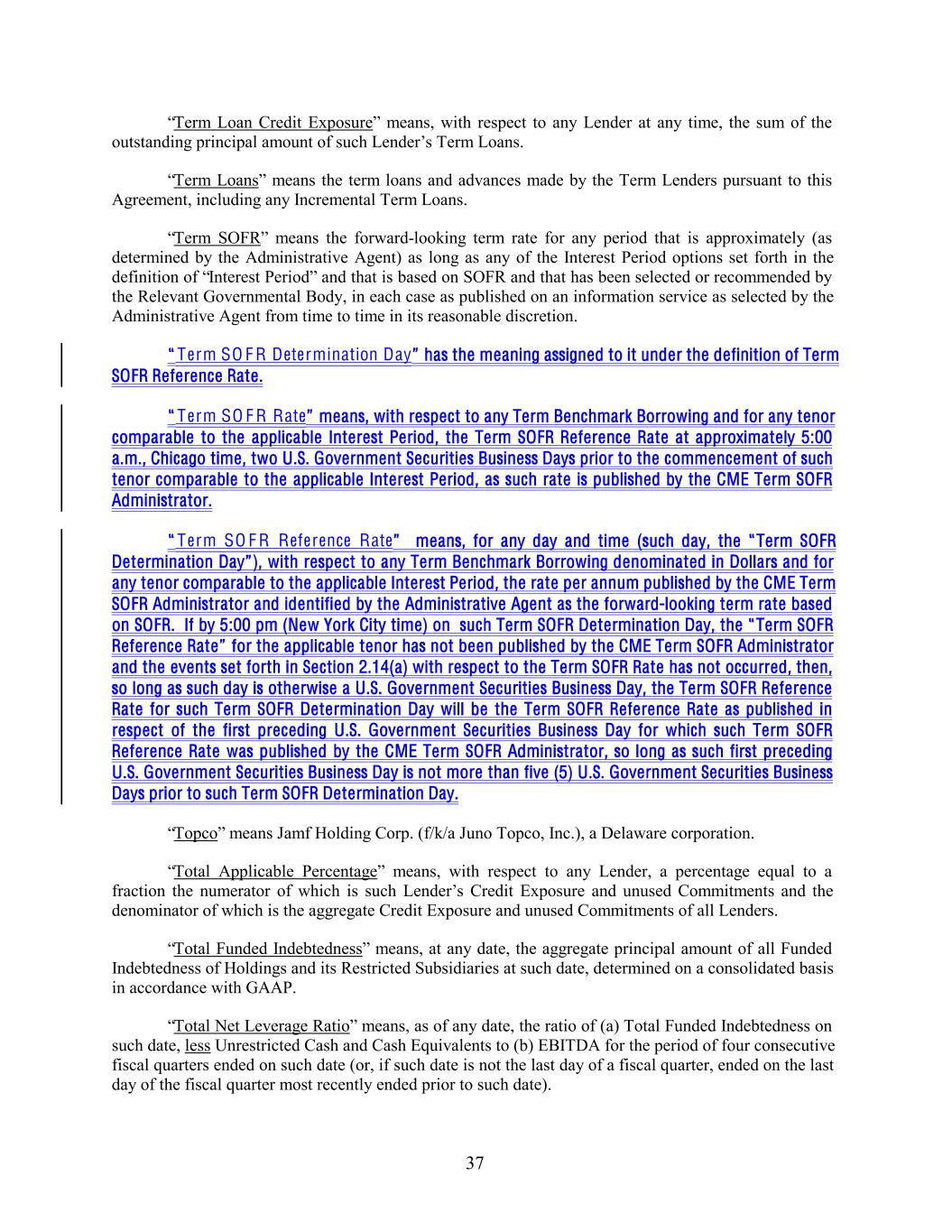 “Term Loan Credit Exposure” means, with respect to any Lender at any time, the sum of the outstanding principal amount of such Lender’s Term Loans. “Term Loans” means the term loans and advances made by the Term Lenders pursuant to this Agreement, including any Incremental Term Loans. “Term SOFR” means the forward-looking term rate for any period that is approximately (as determined by the Administrative Agent) as long as any of the Interest Period options set forth in the definition of “Interest Period” and that is based on SOFR and that has been selected or recommended by the Relevant Governmental Body, in each case as published on an information service as selected by the Administrative Agent from time to time in its reasonable discretion. “ Term SO F R Determination Day” has the meaning assigned to it under the definition of Term SOFR Reference Rate. “ Term SO F R Rate” means, with respect to any Term Benchmark Borrowing and for any tenor comparable to the applicable Interest Period, the Term SOFR Reference Rate at approximately 5:00 a.m., Chicago time, two U.S. Government Securities Business Days prior to the commencement of such tenor comparable to the applicable Interest Period, as such rate is published by the CME Term SOFR Administrator. “ Term SO F R Reference Rate” means, for any day and time (such day, the “ Term SOFR Determination Day” ), with respect to any Term Benchmark Borrowing denominated in Dollars and for any tenor comparable to the applicable Interest Period, the rate per annum published by the CME Term SOFR Administrator and identified by the Administrative Agent as the forward-looking term rate based on SOFR. If by 5:00 pm (New York City time) on such Term SOFR Determination Day, the “ Term SOFR Reference Rate” for the applicable tenor has not been published by the CME Term SOFR Administrator and the events set forth in Section 2.14(a) with respect to the Term SOFR Rate has not occurred, then, so long as such day is otherwise a U.S. Government Securities Business Day, the Term SOFR Reference Rate for such Term SOFR Determination Day will be the Term SOFR Reference Rate as published in respect of the first preceding U.S. Government Securities Business Day for which such Term SOFR Reference Rate was published by the CME Term SOFR Administrator, so long as such first preceding U.S. Government Securities Business Day is not more than five (5) U.S. Government Securities Business Days prior to such Term SOFR Determination Day. “Topco” means Jamf Holding Corp. (f/k/a Juno Topco, Inc.), a Delaware corporation. “Total Applicable Percentage” means, with respect to any Lender, a percentage equal to a fraction the numerator of which is such Lender’s Credit Exposure and unused Commitments and the denominator of which is the aggregate Credit Exposure and unused Commitments of all Lenders. “Total Funded Indebtedness” means, at any date, the aggregate principal amount of all Funded Indebtedness of Holdings and its Restricted Subsidiaries at such date, determined on a consolidated basis in accordance with GAAP. “Total Net Leverage Ratio” means, as of any date, the ratio of (a) Total Funded Indebtedness on such date, less Unrestricted Cash and Cash Equivalents to (b) EBITDA for the period of four consecutive fiscal quarters ended on such date (or, if such date is not the last day of a fiscal quarter, ended on the last day of the fiscal quarter most recently ended prior to such date). 37