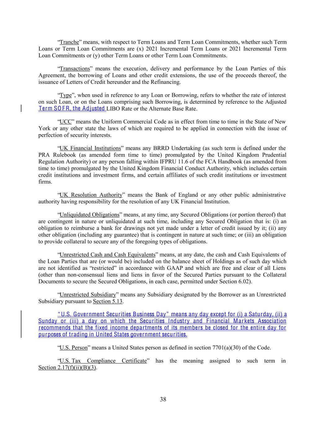 “Tranche” means, with respect to Term Loans and Term Loan Commitments, whether such Term Loans or Term Loan Commitments are (x) 2021 Incremental Term Loans or 2021 Incremental Term Loan Commitments or (y) other Term Loans or other Term Loan Commitments. “Transactions” means the execution, delivery and performance by the Loan Parties of this Agreement, the borrowing of Loans and other credit extensions, the use of the proceeds thereof, the issuance of Letters of Credit hereunder and the Refinancing. “Type”, when used in reference to any Loan or Borrowing, refers to whether the rate of interest on such Loan, or on the Loans comprising such Borrowing, is determined by reference to the Adjusted Term SO F R , the Adjusted LIBO Rate or the Alternate Base Rate. “UCC” means the Uniform Commercial Code as in effect from time to time in the State of New York or any other state the laws of which are required to be applied in connection with the issue of perfection of security interests. “UK Financial Institutions” means any BRRD Undertaking (as such term is defined under the PRA Rulebook (as amended form time to time) promulgated by the United Kingdom Prudential Regulation Authority) or any person falling within IFPRU 11.6 of the FCA Handbook (as amended from time to time) promulgated by the United Kingdom Financial Conduct Authority, which includes certain credit institutions and investment firms, and certain affiliates of such credit institutions or investment firms. “UK Resolution Authority” means the Bank of England or any other public administrative authority having responsibility for the resolution of any UK Financial Institution. “Unliquidated Obligations” means, at any time, any Secured Obligations (or portion thereof) that are contingent in nature or unliquidated at such time, including any Secured Obligation that is: (i) an obligation to reimburse a bank for drawings not yet made under a letter of credit issued by it; (ii) any other obligation (including any guarantee) that is contingent in nature at such time; or (iii) an obligation to provide collateral to secure any of the foregoing types of obligations. “Unrestricted Cash and Cash Equivalents” means, at any date, the cash and Cash Equivalents of the Loan Parties that are (or would be) included on the balance sheet of Holdings as of such day which are not identified as “restricted” in accordance with GAAP and which are free and clear of all Liens (other than non-consensual liens and liens in favor of the Secured Parties pursuant to the Collateral Documents to secure the Secured Obligations, in each case, permitted under Section 6.02). “Unrestricted Subsidiary” means any Subsidiary designated by the Borrower as an Unrestricted Subsidiary pursuant to Section 5.13. “ U .S. Government Securities Business Day” means any day except for (i) a Saturday, (ii) a Sunday or (iii) a day on which the Securities Industry and F inancial Markets Association recommends that the fixed income departments of its members be closed for the entire day for purposes of trading in United States government securities. “U.S. Person” means a United States person as defined in section 7701(a)(30) of the Code. “U.S. Tax Compliance Certificate” has the meaning assigned to such term in Section 2.17(f)(ii)(B)(3). 38