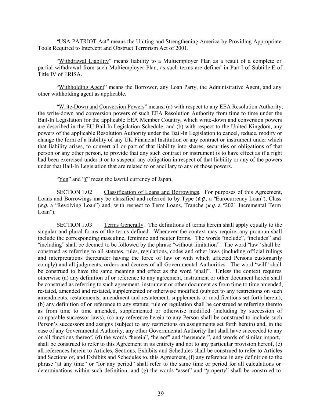 “USA PATRIOT Act” means the Uniting and Strengthening America by Providing Appropriate Tools Required to Intercept and Obstruct Terrorism Act of 2001. “Withdrawal Liability” means liability to a Multiemployer Plan as a result of a complete or partial withdrawal from such Multiemployer Plan, as such terms are defined in Part I of Subtitle E of Title IV of ERISA. “Withholding Agent” means the Borrower, any Loan Party, the Administrative Agent, and any other withholding agent as applicable. “Write-Down and Conversion Powers” means, (a) with respect to any EEA Resolution Authority, the write-down and conversion powers of such EEA Resolution Authority from time to time under the Bail-In Legislation for the applicable EEA Member Country, which write-down and conversion powers are described in the EU Bail-In Legislation Schedule, and (b) with respect to the United Kingdom, any powers of the applicable Resolution Authority under the Bail-In Legislation to cancel, reduce, modify or change the form of a liability of any UK Financial Institution or any contract or instrument under which that liability arises, to convert all or part of that liability into shares, securities or obligations of that person or any other person, to provide that any such contract or instrument is to have effect as if a right had been exercised under it or to suspend any obligation in respect of that liability or any of the powers under that Bail-In Legislation that are related to or ancillary to any of those powers. “Yen” and “¥” mean the lawful currency of Japan. SECTION 1.02 Classification of Loans and Borrowings. For purposes of this Agreement, Loans and Borrowings may be classified and referred to by Type (e.g., a “Eurocurrency Loan”), Class (e.g. a “Revolving Loan”) and, with respect to Term Loans, Tranche (e.g. a “2021 Incremental Term Loan”). SECTION 1.03 Terms Generally. The definitions of terms herein shall apply equally to the singular and plural forms of the terms defined. Whenever the context may require, any pronoun shall include the corresponding masculine, feminine and neuter forms. The words “include”, “includes” and “including” shall be deemed to be followed by the phrase “without limitation”. The word “law” shall be construed as referring to all statutes, rules, regulations, codes and other laws (including official rulings and interpretations thereunder having the force of law or with which affected Persons customarily comply) and all judgments, orders and decrees of all Governmental Authorities. The word “will” shall be construed to have the same meaning and effect as the word “shall”. Unless the context requires otherwise (a) any definition of or reference to any agreement, instrument or other document herein shall be construed as referring to such agreement, instrument or other document as from time to time amended, restated, amended and restated, supplemented or otherwise modified (subject to any restrictions on such amendments, restatements, amendment and restatement, supplements or modifications set forth herein), (b) any definition of or reference to any statute, rule or regulation shall be construed as referring thereto as from time to time amended, supplemented or otherwise modified (including by succession of comparable successor laws), (c) any reference herein to any Person shall be construed to include such Person’s successors and assigns (subject to any restrictions on assignments set forth herein) and, in the case of any Governmental Authority, any other Governmental Authority that shall have succeeded to any or all functions thereof, (d) the words “herein”, “hereof” and “hereunder”, and words of similar import, shall be construed to refer to this Agreement in its entirety and not to any particular provision hereof, (e) all references herein to Articles, Sections, Exhibits and Schedules shall be construed to refer to Articles and Sections of, and Exhibits and Schedules to, this Agreement, (f) any reference in any definition to the phrase “at any time” or “for any period” shall refer to the same time or period for all calculations or determinations within such definition, and (g) the words “asset” and “property” shall be construed to 39