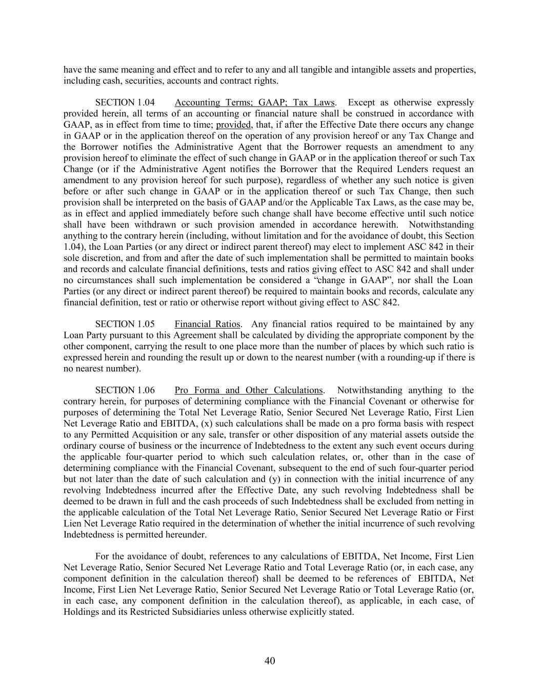 have the same meaning and effect and to refer to any and all tangible and intangible assets and properties, including cash, securities, accounts and contract rights. SECTION 1.04 Accounting Terms; GAAP; Tax Laws. Except as otherwise expressly provided herein, all terms of an accounting or financial nature shall be construed in accordance with GAAP, as in effect from time to time; provided, that, if after the Effective Date there occurs any change in GAAP or in the application thereof on the operation of any provision hereof or any Tax Change and the Borrower notifies the Administrative Agent that the Borrower requests an amendment to any provision hereof to eliminate the effect of such change in GAAP or in the application thereof or such Tax Change (or if the Administrative Agent notifies the Borrower that the Required Lenders request an amendment to any provision hereof for such purpose), regardless of whether any such notice is given before or after such change in GAAP or in the application thereof or such Tax Change, then such provision shall be interpreted on the basis of GAAP and/or the Applicable Tax Laws, as the case may be, as in effect and applied immediately before such change shall have become effective until such notice shall have been withdrawn or such provision amended in accordance herewith. Notwithstanding anything to the contrary herein (including, without limitation and for the avoidance of doubt, this Section 1.04), the Loan Parties (or any direct or indirect parent thereof) may elect to implement ASC 842 in their sole discretion, and from and after the date of such implementation shall be permitted to maintain books and records and calculate financial definitions, tests and ratios giving effect to ASC 842 and shall under no circumstances shall such implementation be considered a “change in GAAP”, nor shall the Loan Parties (or any direct or indirect parent thereof) be required to maintain books and records, calculate any financial definition, test or ratio or otherwise report without giving effect to ASC 842. SECTION 1.05 Financial Ratios. Any financial ratios required to be maintained by any Loan Party pursuant to this Agreement shall be calculated by dividing the appropriate component by the other component, carrying the result to one place more than the number of places by which such ratio is expressed herein and rounding the result up or down to the nearest number (with a rounding-up if there is no nearest number). SECTION 1.06 Pro Forma and Other Calculations. Notwithstanding anything to the contrary herein, for purposes of determining compliance with the Financial Covenant or otherwise for purposes of determining the Total Net Leverage Ratio, Senior Secured Net Leverage Ratio, First Lien Net Leverage Ratio and EBITDA, (x) such calculations shall be made on a pro forma basis with respect to any Permitted Acquisition or any sale, transfer or other disposition of any material assets outside the ordinary course of business or the incurrence of Indebtedness to the extent any such event occurs during the applicable four-quarter period to which such calculation relates, or, other than in the case of determining compliance with the Financial Covenant, subsequent to the end of such four-quarter period but not later than the date of such calculation and (y) in connection with the initial incurrence of any revolving Indebtedness incurred after the Effective Date, any such revolving Indebtedness shall be deemed to be drawn in full and the cash proceeds of such Indebtedness shall be excluded from netting in the applicable calculation of the Total Net Leverage Ratio, Senior Secured Net Leverage Ratio or First Lien Net Leverage Ratio required in the determination of whether the initial incurrence of such revolving Indebtedness is permitted hereunder. For the avoidance of doubt, references to any calculations of EBITDA, Net Income, First Lien Net Leverage Ratio, Senior Secured Net Leverage Ratio and Total Leverage Ratio (or, in each case, any component definition in the calculation thereof) shall be deemed to be references of EBITDA, Net Income, First Lien Net Leverage Ratio, Senior Secured Net Leverage Ratio or Total Leverage Ratio (or, in each case, any component definition in the calculation thereof), as applicable, in each case, of Holdings and its Restricted Subsidiaries unless otherwise explicitly stated. 40