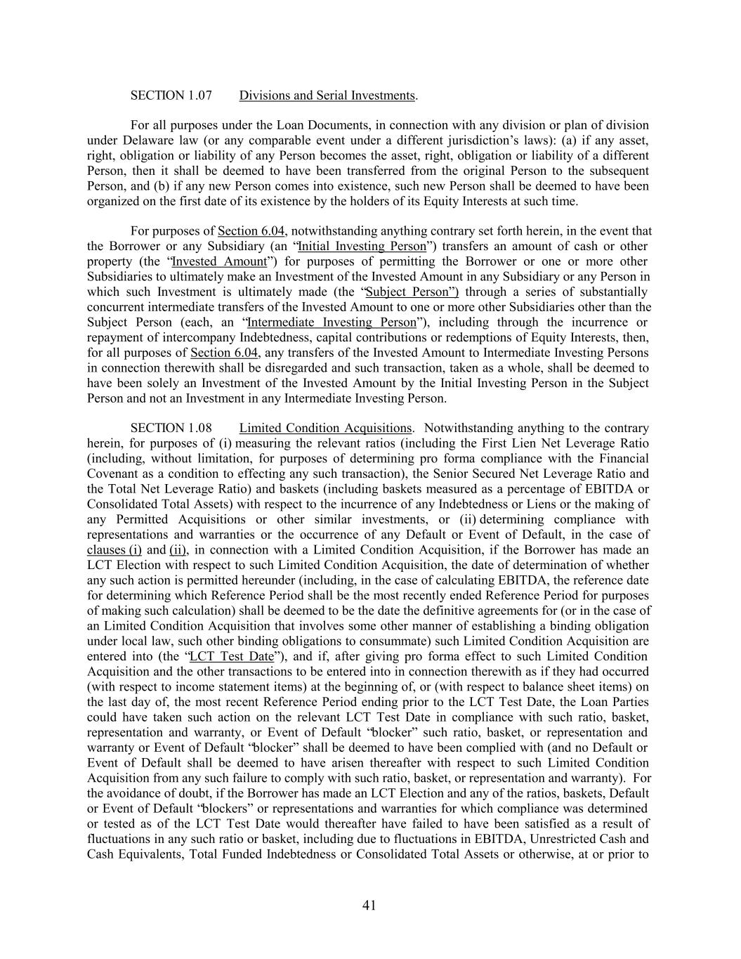 SECTION 1.07 Divisions and Serial Investments. For all purposes under the Loan Documents, in connection with any division or plan of division under Delaware law (or any comparable event under a different jurisdiction’s laws): (a) if any asset, right, obligation or liability of any Person becomes the asset, right, obligation or liability of a different Person, then it shall be deemed to have been transferred from the original Person to the subsequent Person, and (b) if any new Person comes into existence, such new Person shall be deemed to have been organized on the first date of its existence by the holders of its Equity Interests at such time. For purposes of Section 6.04, notwithstanding anything contrary set forth herein, in the event that the Borrower or any Subsidiary (an “Initial Investing Person”) transfers an amount of cash or other property (the “Invested Amount”) for purposes of permitting the Borrower or one or more other Subsidiaries to ultimately make an Investment of the Invested Amount in any Subsidiary or any Person in which such Investment is ultimately made (the “Subject Person”) through a series of substantially concurrent intermediate transfers of the Invested Amount to one or more other Subsidiaries other than the Subject Person (each, an “Intermediate Investing Person”), including through the incurrence or repayment of intercompany Indebtedness, capital contributions or redemptions of Equity Interests, then, for all purposes of Section 6.04, any transfers of the Invested Amount to Intermediate Investing Persons in connection therewith shall be disregarded and such transaction, taken as a whole, shall be deemed to have been solely an Investment of the Invested Amount by the Initial Investing Person in the Subject Person and not an Investment in any Intermediate Investing Person. SECTION 1.08 Limited Condition Acquisitions. Notwithstanding anything to the contrary herein, for purposes of (i) measuring the relevant ratios (including the First Lien Net Leverage Ratio (including, without limitation, for purposes of determining pro forma compliance with the Financial Covenant as a condition to effecting any such transaction), the Senior Secured Net Leverage Ratio and the Total Net Leverage Ratio) and baskets (including baskets measured as a percentage of EBITDA or Consolidated Total Assets) with respect to the incurrence of any Indebtedness or Liens or the making of any Permitted Acquisitions or other similar investments, or (ii) determining compliance with representations and warranties or the occurrence of any Default or Event of Default, in the case of clauses (i) and (ii), in connection with a Limited Condition Acquisition, if the Borrower has made an LCT Election with respect to such Limited Condition Acquisition, the date of determination of whether any such action is permitted hereunder (including, in the case of calculating EBITDA, the reference date for determining which Reference Period shall be the most recently ended Reference Period for purposes of making such calculation) shall be deemed to be the date the definitive agreements for (or in the case of an Limited Condition Acquisition that involves some other manner of establishing a binding obligation under local law, such other binding obligations to consummate) such Limited Condition Acquisition are entered into (the “LCT Test Date”), and if, after giving pro forma effect to such Limited Condition Acquisition and the other transactions to be entered into in connection therewith as if they had occurred (with respect to income statement items) at the beginning of, or (with respect to balance sheet items) on the last day of, the most recent Reference Period ending prior to the LCT Test Date, the Loan Parties could have taken such action on the relevant LCT Test Date in compliance with such ratio, basket, representation and warranty, or Event of Default “blocker” such ratio, basket, or representation and warranty or Event of Default “blocker” shall be deemed to have been complied with (and no Default or Event of Default shall be deemed to have arisen thereafter with respect to such Limited Condition Acquisition from any such failure to comply with such ratio, basket, or representation and warranty). For the avoidance of doubt, if the Borrower has made an LCT Election and any of the ratios, baskets, Default or Event of Default “blockers” or representations and warranties for which compliance was determined or tested as of the LCT Test Date would thereafter have failed to have been satisfied as a result of fluctuations in any such ratio or basket, including due to fluctuations in EBITDA, Unrestricted Cash and Cash Equivalents, Total Funded Indebtedness or Consolidated Total Assets or otherwise, at or prior to 41