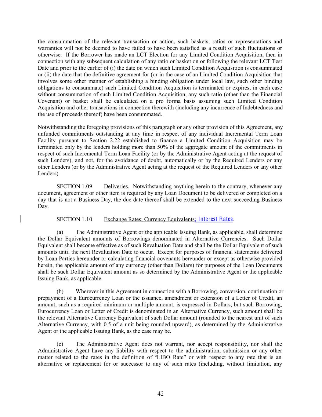 the consummation of the relevant transaction or action, such baskets, ratios or representations and warranties will not be deemed to have failed to have been satisfied as a result of such fluctuations or otherwise. If the Borrower has made an LCT Election for any Limited Condition Acquisition, then in connection with any subsequent calculation of any ratio or basket on or following the relevant LCT Test Date and prior to the earlier of (i) the date on which such Limited Condition Acquisition is consummated or (ii) the date that the definitive agreement for (or in the case of an Limited Condition Acquisition that involves some other manner of establishing a binding obligation under local law, such other binding obligations to consummate) such Limited Condition Acquisition is terminated or expires, in each case without consummation of such Limited Condition Acquisition, any such ratio (other than the Financial Covenant) or basket shall be calculated on a pro forma basis assuming such Limited Condition Acquisition and other transactions in connection therewith (including any incurrence of Indebtedness and the use of proceeds thereof) have been consummated. Notwithstanding the foregoing provisions of this paragraph or any other provision of this Agreement, any unfunded commitments outstanding at any time in respect of any individual Incremental Term Loan Facility pursuant to Section 2.22 established to finance a Limited Condition Acquisition may be terminated only by the lenders holding more than 50% of the aggregate amount of the commitments in respect of such Incremental Term Loan Facility (or by the Administrative Agent acting at the request of such Lenders), and not, for the avoidance of doubt, automatically or by the Required Lenders or any other Lenders (or by the Administrative Agent acting at the request of the Required Lenders or any other Lenders). SECTION 1.09 Deliveries. Notwithstanding anything herein to the contrary, whenever any document, agreement or other item is required by any Loan Document to be delivered or completed on a day that is not a Business Day, the due date thereof shall be extended to the next succeeding Business Day. SECTION 1.10 Exchange Rates; Currency Equivalents; Interest Rates. (a) The Administrative Agent or the applicable Issuing Bank, as applicable, shall determine the Dollar Equivalent amounts of Borrowings denominated in Alternative Currencies. Such Dollar Equivalent shall become effective as of such Revaluation Date and shall be the Dollar Equivalent of such amounts until the next Revaluation Date to occur. Except for purposes of financial statements delivered by Loan Parties hereunder or calculating financial covenants hereunder or except as otherwise provided herein, the applicable amount of any currency (other than Dollars) for purposes of the Loan Documents shall be such Dollar Equivalent amount as so determined by the Administrative Agent or the applicable Issuing Bank, as applicable. (b) Wherever in this Agreement in connection with a Borrowing, conversion, continuation or prepayment of a Eurocurrency Loan or the issuance, amendment or extension of a Letter of Credit, an amount, such as a required minimum or multiple amount, is expressed in Dollars, but such Borrowing, Eurocurrency Loan or Letter of Credit is denominated in an Alternative Currency, such amount shall be the relevant Alternative Currency Equivalent of such Dollar amount (rounded to the nearest unit of such Alternative Currency, with 0.5 of a unit being rounded upward), as determined by the Administrative Agent or the applicable Issuing Bank, as the case may be. (c) The Administrative Agent does not warrant, nor accept responsibility, nor shall the Administrative Agent have any liability with respect to the administration, submission or any other matter related to the rates in the definition of “LIBO Rate” or with respect to any rate that is an alternative or replacement for or successor to any of such rates (including, without limitation, any 42