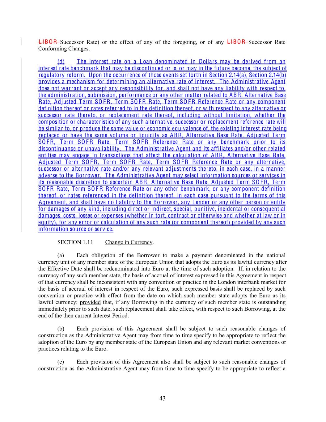 L IB O R Successor Rate) or the effect of any of the foregoing, or of any L IB O R Successor Rate Conforming Changes. (d) The interest rate on a Loan denominated in Dollars may be der ived from an interest rate benchmark that may be discontinued or is, or may in the future become, the subject of regulatory reform. Upon the occur rence of those events set forth in Section 2.14(a), Section 2.14(b) provides a mechanism for determining an alternative rate of interest. The Administrative Agent does not war rant or accept any responsibility for , and shall not have any liability with respect to, the administration, submission, performance or any other matter related to A BR , A lternative Base Rate, Adjusted Term SO F R , Term SO F R Rate, Term SO F R Reference Rate or any component definition thereof or rates refer red to in the definition thereof, or with respect to any alternative or successor rate thereto, or replacement rate thereof, including without limitation, whether the composition or character istics of any such alternative, successor or replacement reference rate will be similar to, or produce the same value or economic equivalence of, the existing interest rate being replaced or have the same volume or liquidity as A BR , A lternative Base Rate, Adjusted Term SO F R , Term SO F R Rate, Term SO F R Reference Rate or any benchmark prior to its discontinuance or unavailability. The Administrative Agent and its affiliates and/or other related entities may engage in transactions that affect the calculation of A BR , A lternative Base Rate, Adjusted Term SO F R , Term SO F R Rate, Term SO F R Reference Rate or any alternative, successor or alternative rate and/or any relevant adjustments thereto, in each case, in a manner adverse to the Bor rower . The Administrative Agent may select information sources or services in its reasonable discretion to ascertain A BR , A lternative Base Rate, Adjusted Term SO F R , Term SO F R Rate, Term SO F R Reference Rate or any other benchmark , or any component definition thereof, or rates referenced in the definition thereof, in each case pursuant to the terms of this Agreement, and shall have no liability to the Bor rower , any Lender or any other person or entity for damages of any kind, including direct or indirect, special, punitive, incidental or consequential damages, costs, losses or expenses (whether in tort, contract or otherwise and whether at law or in equity), for any er ror or calculation of any such rate (or component thereof) provided by any such information source or service. SECTION 1.11 Change in Currency. (a) Each obligation of the Borrower to make a payment denominated in the national currency unit of any member state of the European Union that adopts the Euro as its lawful currency after the Effective Date shall be redenominated into Euro at the time of such adoption. If, in relation to the currency of any such member state, the basis of accrual of interest expressed in this Agreement in respect of that currency shall be inconsistent with any convention or practice in the London interbank market for the basis of accrual of interest in respect of the Euro, such expressed basis shall be replaced by such convention or practice with effect from the date on which such member state adopts the Euro as its lawful currency; provided that, if any Borrowing in the currency of such member state is outstanding immediately prior to such date, such replacement shall take effect, with respect to such Borrowing, at the end of the then current Interest Period. (b) Each provision of this Agreement shall be subject to such reasonable changes of construction as the Administrative Agent may from time to time specify to be appropriate to reflect the adoption of the Euro by any member state of the European Union and any relevant market conventions or practices relating to the Euro. (c) Each provision of this Agreement also shall be subject to such reasonable changes of construction as the Administrative Agent may from time to time specify to be appropriate to reflect a 43