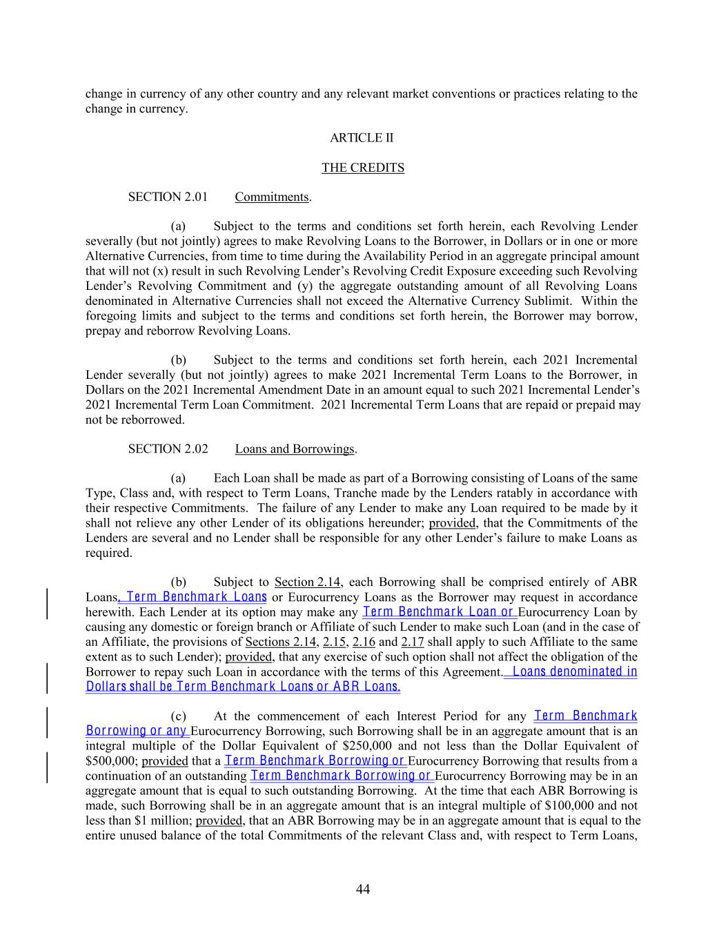change in currency of any other country and any relevant market conventions or practices relating to the change in currency. ARTICLE II THE CREDITS SECTION 2.01 Commitments. (a) Subject to the terms and conditions set forth herein, each Revolving Lender severally (but not jointly) agrees to make Revolving Loans to the Borrower, in Dollars or in one or more Alternative Currencies, from time to time during the Availability Period in an aggregate principal amount that will not (x) result in such Revolving Lender’s Revolving Credit Exposure exceeding such Revolving Lender’s Revolving Commitment and (y) the aggregate outstanding amount of all Revolving Loans denominated in Alternative Currencies shall not exceed the Alternative Currency Sublimit. Within the foregoing limits and subject to the terms and conditions set forth herein, the Borrower may borrow, prepay and reborrow Revolving Loans. (b) Subject to the terms and conditions set forth herein, each 2021 Incremental Lender severally (but not jointly) agrees to make 2021 Incremental Term Loans to the Borrower, in Dollars on the 2021 Incremental Amendment Date in an amount equal to such 2021 Incremental Lender’s 2021 Incremental Term Loan Commitment. 2021 Incremental Term Loans that are repaid or prepaid may not be reborrowed. SECTION 2.02 Loans and Borrowings. (a) Each Loan shall be made as part of a Borrowing consisting of Loans of the same Type, Class and, with respect to Term Loans, Tranche made by the Lenders ratably in accordance with their respective Commitments. The failure of any Lender to make any Loan required to be made by it shall not relieve any other Lender of its obligations hereunder; provided, that the Commitments of the Lenders are several and no Lender shall be responsible for any other Lender’s failure to make Loans as required. (b) Subject to Section 2.14, each Borrowing shall be comprised entirely of ABR Loans, Term Benchmark Loans or Eurocurrency Loans as the Borrower may request in accordance herewith. Each Lender at its option may make any Term Benchmark Loan or Eurocurrency Loan by causing any domestic or foreign branch or Affiliate of such Lender to make such Loan (and in the case of an Affiliate, the provisions of Sections 2.14, 2.15, 2.16 and 2.17 shall apply to such Affiliate to the same extent as to such Lender); provided, that any exercise of such option shall not affect the obligation of the Borrower to repay such Loan in accordance with the terms of this Agreement. Loans denominated in Dollars shall be Term Benchmark Loans or A BR Loans. (c) At the commencement of each Interest Period for any Term Benchmark Bor rowing or any Eurocurrency Borrowing, such Borrowing shall be in an aggregate amount that is an integral multiple of the Dollar Equivalent of $250,000 and not less than the Dollar Equivalent of $500,000; provided that a Term Benchmark Bor rowing or Eurocurrency Borrowing that results from a continuation of an outstanding Term Benchmark Bor rowing or Eurocurrency Borrowing may be in an aggregate amount that is equal to such outstanding Borrowing. At the time that each ABR Borrowing is made, such Borrowing shall be in an aggregate amount that is an integral multiple of $100,000 and not less than $1 million; provided, that an ABR Borrowing may be in an aggregate amount that is equal to the entire unused balance of the total Commitments of the relevant Class and, with respect to Term Loans, 44