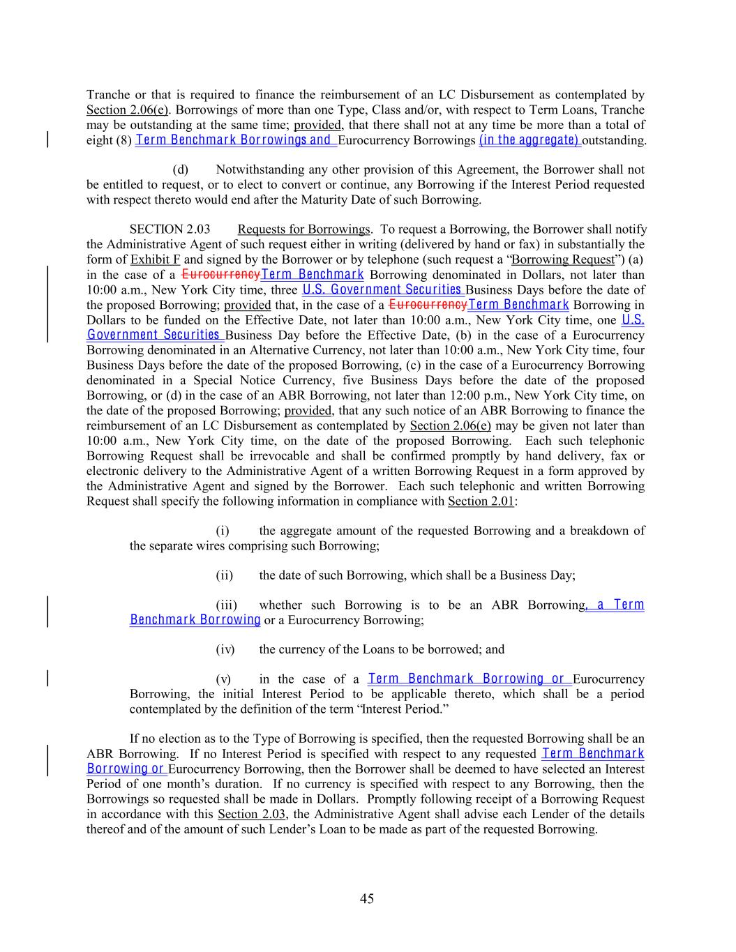 Tranche or that is required to finance the reimbursement of an LC Disbursement as contemplated by Section 2.06(e). Borrowings of more than one Type, Class and/or, with respect to Term Loans, Tranche may be outstanding at the same time; provided, that there shall not at any time be more than a total of eight (8) Term Benchmark Bor rowings and Eurocurrency Borrowings (in the aggregate) outstanding. (d) Notwithstanding any other provision of this Agreement, the Borrower shall not be entitled to request, or to elect to convert or continue, any Borrowing if the Interest Period requested with respect thereto would end after the Maturity Date of such Borrowing. SECTION 2.03 Requests for Borrowings. To request a Borrowing, the Borrower shall notify the Administrative Agent of such request either in writing (delivered by hand or fax) in substantially the form of Exhibit F and signed by the Borrower or by telephone (such request a “Borrowing Request”) (a) in the case of a Eurocur rencyTerm Benchmark Borrowing denominated in Dollars, not later than 10:00 a.m., New York City time, three U .S. Government Securities Business Days before the date of the proposed Borrowing; provided that, in the case of a Eurocur rencyTerm Benchmark Borrowing in Dollars to be funded on the Effective Date, not later than 10:00 a.m., New York City time, one U .S. Government Securities Business Day before the Effective Date, (b) in the case of a Eurocurrency Borrowing denominated in an Alternative Currency, not later than 10:00 a.m., New York City time, four Business Days before the date of the proposed Borrowing, (c) in the case of a Eurocurrency Borrowing denominated in a Special Notice Currency, five Business Days before the date of the proposed Borrowing, or (d) in the case of an ABR Borrowing, not later than 12:00 p.m., New York City time, on the date of the proposed Borrowing; provided, that any such notice of an ABR Borrowing to finance the reimbursement of an LC Disbursement as contemplated by Section 2.06(e) may be given not later than 10:00 a.m., New York City time, on the date of the proposed Borrowing. Each such telephonic Borrowing Request shall be irrevocable and shall be confirmed promptly by hand delivery, fax or electronic delivery to the Administrative Agent of a written Borrowing Request in a form approved by the Administrative Agent and signed by the Borrower. Each such telephonic and written Borrowing Request shall specify the following information in compliance with Section 2.01: (i) the aggregate amount of the requested Borrowing and a breakdown of the separate wires comprising such Borrowing; (ii) the date of such Borrowing, which shall be a Business Day; (iii) whether such Borrowing is to be an ABR Borrowing, a Term Benchmark Bor rowing or a Eurocurrency Borrowing; (iv) the currency of the Loans to be borrowed; and (v) in the case of a Term Benchmark Bor rowing or Eurocurrency Borrowing, the initial Interest Period to be applicable thereto, which shall be a period contemplated by the definition of the term “Interest Period.” If no election as to the Type of Borrowing is specified, then the requested Borrowing shall be an ABR Borrowing. If no Interest Period is specified with respect to any requested Term Benchmark Bor rowing or Eurocurrency Borrowing, then the Borrower shall be deemed to have selected an Interest Period of one month’s duration. If no currency is specified with respect to any Borrowing, then the Borrowings so requested shall be made in Dollars. Promptly following receipt of a Borrowing Request in accordance with this Section 2.03, the Administrative Agent shall advise each Lender of the details thereof and of the amount of such Lender’s Loan to be made as part of the requested Borrowing. 45