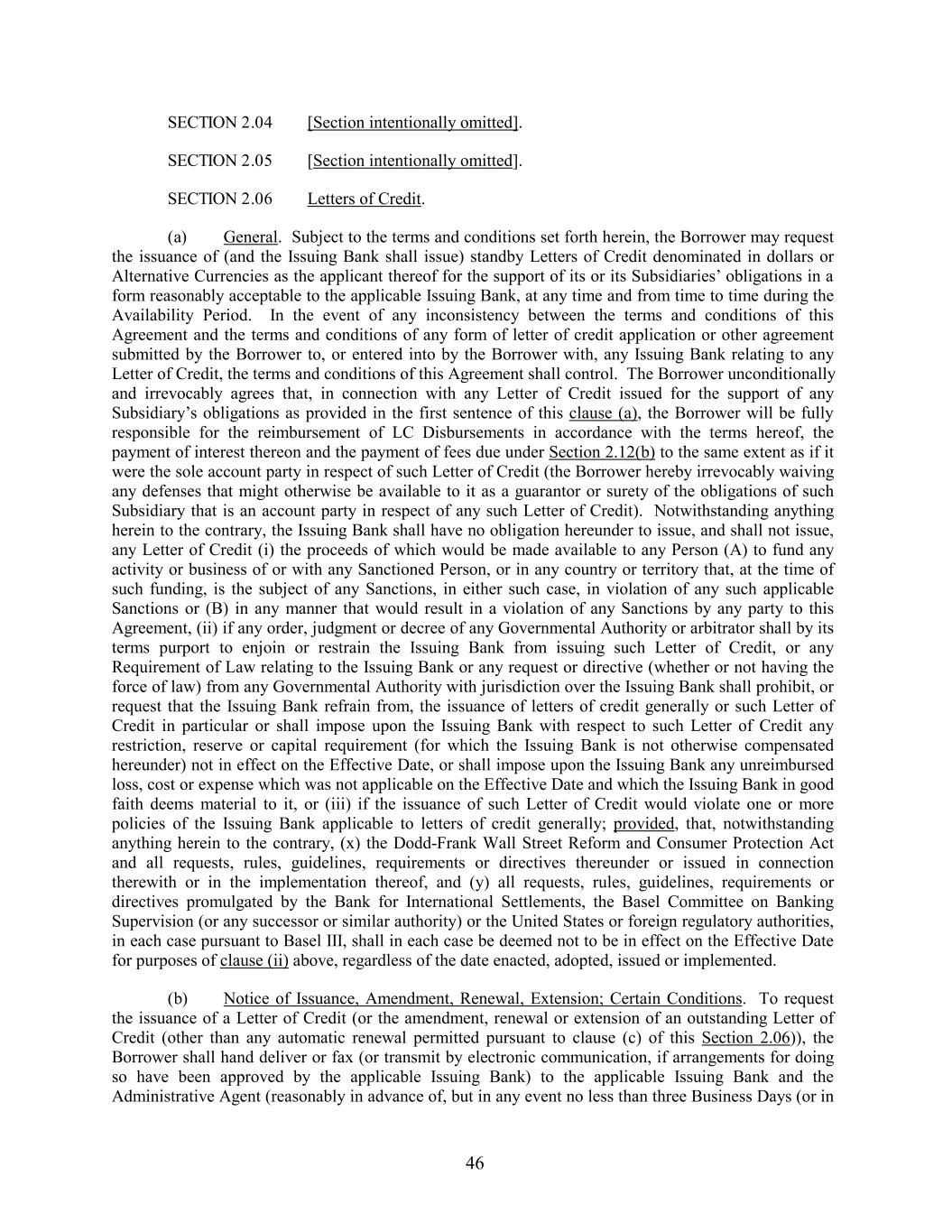 SECTION 2.04 [Section intentionally omitted]. SECTION 2.05 [Section intentionally omitted]. SECTION 2.06 Letters of Credit. (a) General. Subject to the terms and conditions set forth herein, the Borrower may request the issuance of (and the Issuing Bank shall issue) standby Letters of Credit denominated in dollars or Alternative Currencies as the applicant thereof for the support of its or its Subsidiaries’ obligations in a form reasonably acceptable to the applicable Issuing Bank, at any time and from time to time during the Availability Period. In the event of any inconsistency between the terms and conditions of this Agreement and the terms and conditions of any form of letter of credit application or other agreement submitted by the Borrower to, or entered into by the Borrower with, any Issuing Bank relating to any Letter of Credit, the terms and conditions of this Agreement shall control. The Borrower unconditionally and irrevocably agrees that, in connection with any Letter of Credit issued for the support of any Subsidiary’s obligations as provided in the first sentence of this clause (a), the Borrower will be fully responsible for the reimbursement of LC Disbursements in accordance with the terms hereof, the payment of interest thereon and the payment of fees due under Section 2.12(b) to the same extent as if it were the sole account party in respect of such Letter of Credit (the Borrower hereby irrevocably waiving any defenses that might otherwise be available to it as a guarantor or surety of the obligations of such Subsidiary that is an account party in respect of any such Letter of Credit). Notwithstanding anything herein to the contrary, the Issuing Bank shall have no obligation hereunder to issue, and shall not issue, any Letter of Credit (i) the proceeds of which would be made available to any Person (A) to fund any activity or business of or with any Sanctioned Person, or in any country or territory that, at the time of such funding, is the subject of any Sanctions, in either such case, in violation of any such applicable Sanctions or (B) in any manner that would result in a violation of any Sanctions by any party to this Agreement, (ii) if any order, judgment or decree of any Governmental Authority or arbitrator shall by its terms purport to enjoin or restrain the Issuing Bank from issuing such Letter of Credit, or any Requirement of Law relating to the Issuing Bank or any request or directive (whether or not having the force of law) from any Governmental Authority with jurisdiction over the Issuing Bank shall prohibit, or request that the Issuing Bank refrain from, the issuance of letters of credit generally or such Letter of Credit in particular or shall impose upon the Issuing Bank with respect to such Letter of Credit any restriction, reserve or capital requirement (for which the Issuing Bank is not otherwise compensated hereunder) not in effect on the Effective Date, or shall impose upon the Issuing Bank any unreimbursed loss, cost or expense which was not applicable on the Effective Date and which the Issuing Bank in good faith deems material to it, or (iii) if the issuance of such Letter of Credit would violate one or more policies of the Issuing Bank applicable to letters of credit generally; provided, that, notwithstanding anything herein to the contrary, (x) the Dodd-Frank Wall Street Reform and Consumer Protection Act and all requests, rules, guidelines, requirements or directives thereunder or issued in connection therewith or in the implementation thereof, and (y) all requests, rules, guidelines, requirements or directives promulgated by the Bank for International Settlements, the Basel Committee on Banking Supervision (or any successor or similar authority) or the United States or foreign regulatory authorities, in each case pursuant to Basel III, shall in each case be deemed not to be in effect on the Effective Date for purposes of clause (ii) above, regardless of the date enacted, adopted, issued or implemented. (b) Notice of Issuance, Amendment, Renewal, Extension; Certain Conditions. To request the issuance of a Letter of Credit (or the amendment, renewal or extension of an outstanding Letter of Credit (other than any automatic renewal permitted pursuant to clause (c) of this Section 2.06)), the Borrower shall hand deliver or fax (or transmit by electronic communication, if arrangements for doing so have been approved by the applicable Issuing Bank) to the applicable Issuing Bank and the Administrative Agent (reasonably in advance of, but in any event no less than three Business Days (or in 46