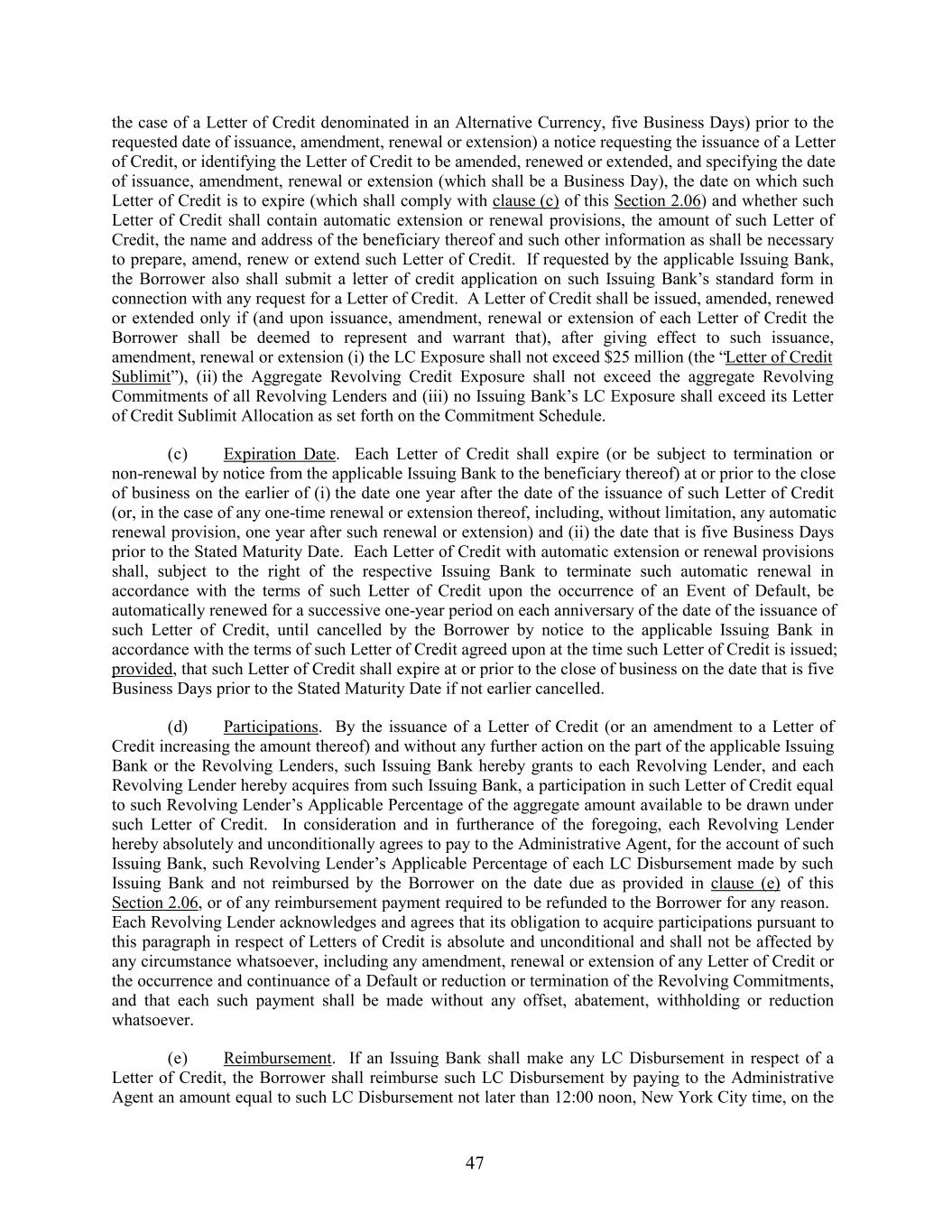 the case of a Letter of Credit denominated in an Alternative Currency, five Business Days) prior to the requested date of issuance, amendment, renewal or extension) a notice requesting the issuance of a Letter of Credit, or identifying the Letter of Credit to be amended, renewed or extended, and specifying the date of issuance, amendment, renewal or extension (which shall be a Business Day), the date on which such Letter of Credit is to expire (which shall comply with clause (c) of this Section 2.06) and whether such Letter of Credit shall contain automatic extension or renewal provisions, the amount of such Letter of Credit, the name and address of the beneficiary thereof and such other information as shall be necessary to prepare, amend, renew or extend such Letter of Credit. If requested by the applicable Issuing Bank, the Borrower also shall submit a letter of credit application on such Issuing Bank’s standard form in connection with any request for a Letter of Credit. A Letter of Credit shall be issued, amended, renewed or extended only if (and upon issuance, amendment, renewal or extension of each Letter of Credit the Borrower shall be deemed to represent and warrant that), after giving effect to such issuance, amendment, renewal or extension (i) the LC Exposure shall not exceed $25 million (the “Letter of Credit Sublimit”), (ii) the Aggregate Revolving Credit Exposure shall not exceed the aggregate Revolving Commitments of all Revolving Lenders and (iii) no Issuing Bank’s LC Exposure shall exceed its Letter of Credit Sublimit Allocation as set forth on the Commitment Schedule. (c) Expiration Date. Each Letter of Credit shall expire (or be subject to termination or non-renewal by notice from the applicable Issuing Bank to the beneficiary thereof) at or prior to the close of business on the earlier of (i) the date one year after the date of the issuance of such Letter of Credit (or, in the case of any one-time renewal or extension thereof, including, without limitation, any automatic renewal provision, one year after such renewal or extension) and (ii) the date that is five Business Days prior to the Stated Maturity Date. Each Letter of Credit with automatic extension or renewal provisions shall, subject to the right of the respective Issuing Bank to terminate such automatic renewal in accordance with the terms of such Letter of Credit upon the occurrence of an Event of Default, be automatically renewed for a successive one-year period on each anniversary of the date of the issuance of such Letter of Credit, until cancelled by the Borrower by notice to the applicable Issuing Bank in accordance with the terms of such Letter of Credit agreed upon at the time such Letter of Credit is issued; provided, that such Letter of Credit shall expire at or prior to the close of business on the date that is five Business Days prior to the Stated Maturity Date if not earlier cancelled. (d) Participations. By the issuance of a Letter of Credit (or an amendment to a Letter of Credit increasing the amount thereof) and without any further action on the part of the applicable Issuing Bank or the Revolving Lenders, such Issuing Bank hereby grants to each Revolving Lender, and each Revolving Lender hereby acquires from such Issuing Bank, a participation in such Letter of Credit equal to such Revolving Lender’s Applicable Percentage of the aggregate amount available to be drawn under such Letter of Credit. In consideration and in furtherance of the foregoing, each Revolving Lender hereby absolutely and unconditionally agrees to pay to the Administrative Agent, for the account of such Issuing Bank, such Revolving Lender’s Applicable Percentage of each LC Disbursement made by such Issuing Bank and not reimbursed by the Borrower on the date due as provided in clause (e) of this Section 2.06, or of any reimbursement payment required to be refunded to the Borrower for any reason. Each Revolving Lender acknowledges and agrees that its obligation to acquire participations pursuant to this paragraph in respect of Letters of Credit is absolute and unconditional and shall not be affected by any circumstance whatsoever, including any amendment, renewal or extension of any Letter of Credit or the occurrence and continuance of a Default or reduction or termination of the Revolving Commitments, and that each such payment shall be made without any offset, abatement, withholding or reduction whatsoever. (e) Reimbursement. If an Issuing Bank shall make any LC Disbursement in respect of a Letter of Credit, the Borrower shall reimburse such LC Disbursement by paying to the Administrative Agent an amount equal to such LC Disbursement not later than 12:00 noon, New York City time, on the 47