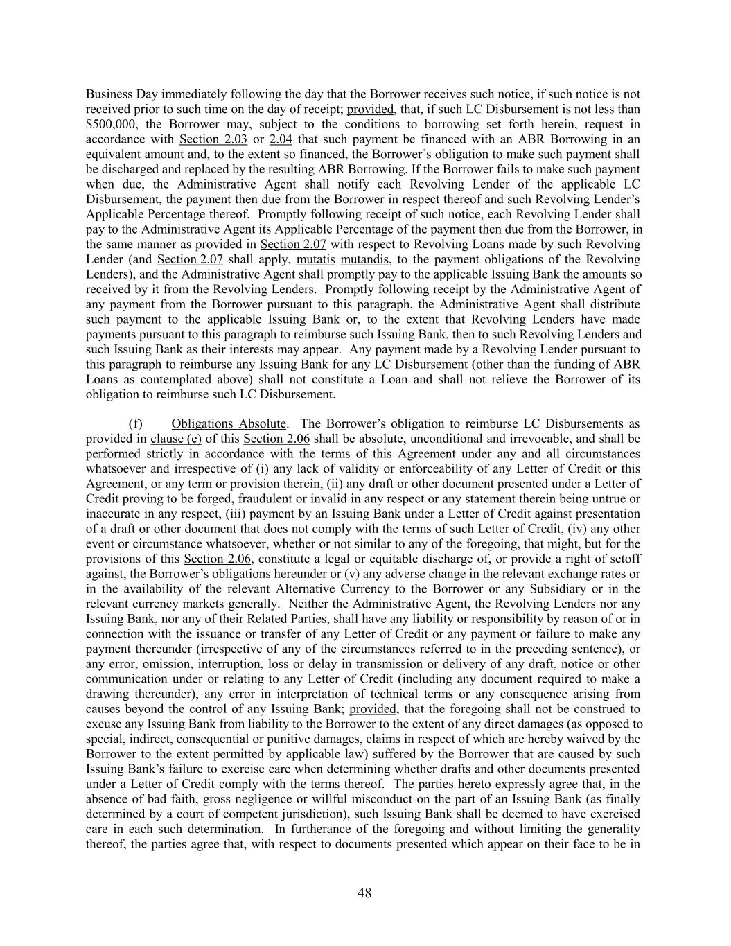 Business Day immediately following the day that the Borrower receives such notice, if such notice is not received prior to such time on the day of receipt; provided, that, if such LC Disbursement is not less than $500,000, the Borrower may, subject to the conditions to borrowing set forth herein, request in accordance with Section 2.03 or 2.04 that such payment be financed with an ABR Borrowing in an equivalent amount and, to the extent so financed, the Borrower’s obligation to make such payment shall be discharged and replaced by the resulting ABR Borrowing. If the Borrower fails to make such payment when due, the Administrative Agent shall notify each Revolving Lender of the applicable LC Disbursement, the payment then due from the Borrower in respect thereof and such Revolving Lender’s Applicable Percentage thereof. Promptly following receipt of such notice, each Revolving Lender shall pay to the Administrative Agent its Applicable Percentage of the payment then due from the Borrower, in the same manner as provided in Section 2.07 with respect to Revolving Loans made by such Revolving Lender (and Section 2.07 shall apply, mutatis mutandis, to the payment obligations of the Revolving Lenders), and the Administrative Agent shall promptly pay to the applicable Issuing Bank the amounts so received by it from the Revolving Lenders. Promptly following receipt by the Administrative Agent of any payment from the Borrower pursuant to this paragraph, the Administrative Agent shall distribute such payment to the applicable Issuing Bank or, to the extent that Revolving Lenders have made payments pursuant to this paragraph to reimburse such Issuing Bank, then to such Revolving Lenders and such Issuing Bank as their interests may appear. Any payment made by a Revolving Lender pursuant to this paragraph to reimburse any Issuing Bank for any LC Disbursement (other than the funding of ABR Loans as contemplated above) shall not constitute a Loan and shall not relieve the Borrower of its obligation to reimburse such LC Disbursement. (f) Obligations Absolute. The Borrower’s obligation to reimburse LC Disbursements as provided in clause (e) of this Section 2.06 shall be absolute, unconditional and irrevocable, and shall be performed strictly in accordance with the terms of this Agreement under any and all circumstances whatsoever and irrespective of (i) any lack of validity or enforceability of any Letter of Credit or this Agreement, or any term or provision therein, (ii) any draft or other document presented under a Letter of Credit proving to be forged, fraudulent or invalid in any respect or any statement therein being untrue or inaccurate in any respect, (iii) payment by an Issuing Bank under a Letter of Credit against presentation of a draft or other document that does not comply with the terms of such Letter of Credit, (iv) any other event or circumstance whatsoever, whether or not similar to any of the foregoing, that might, but for the provisions of this Section 2.06, constitute a legal or equitable discharge of, or provide a right of setoff against, the Borrower’s obligations hereunder or (v) any adverse change in the relevant exchange rates or in the availability of the relevant Alternative Currency to the Borrower or any Subsidiary or in the relevant currency markets generally. Neither the Administrative Agent, the Revolving Lenders nor any Issuing Bank, nor any of their Related Parties, shall have any liability or responsibility by reason of or in connection with the issuance or transfer of any Letter of Credit or any payment or failure to make any payment thereunder (irrespective of any of the circumstances referred to in the preceding sentence), or any error, omission, interruption, loss or delay in transmission or delivery of any draft, notice or other communication under or relating to any Letter of Credit (including any document required to make a drawing thereunder), any error in interpretation of technical terms or any consequence arising from causes beyond the control of any Issuing Bank; provided, that the foregoing shall not be construed to excuse any Issuing Bank from liability to the Borrower to the extent of any direct damages (as opposed to special, indirect, consequential or punitive damages, claims in respect of which are hereby waived by the Borrower to the extent permitted by applicable law) suffered by the Borrower that are caused by such Issuing Bank’s failure to exercise care when determining whether drafts and other documents presented under a Letter of Credit comply with the terms thereof. The parties hereto expressly agree that, in the absence of bad faith, gross negligence or willful misconduct on the part of an Issuing Bank (as finally determined by a court of competent jurisdiction), such Issuing Bank shall be deemed to have exercised care in each such determination. In furtherance of the foregoing and without limiting the generality thereof, the parties agree that, with respect to documents presented which appear on their face to be in 48