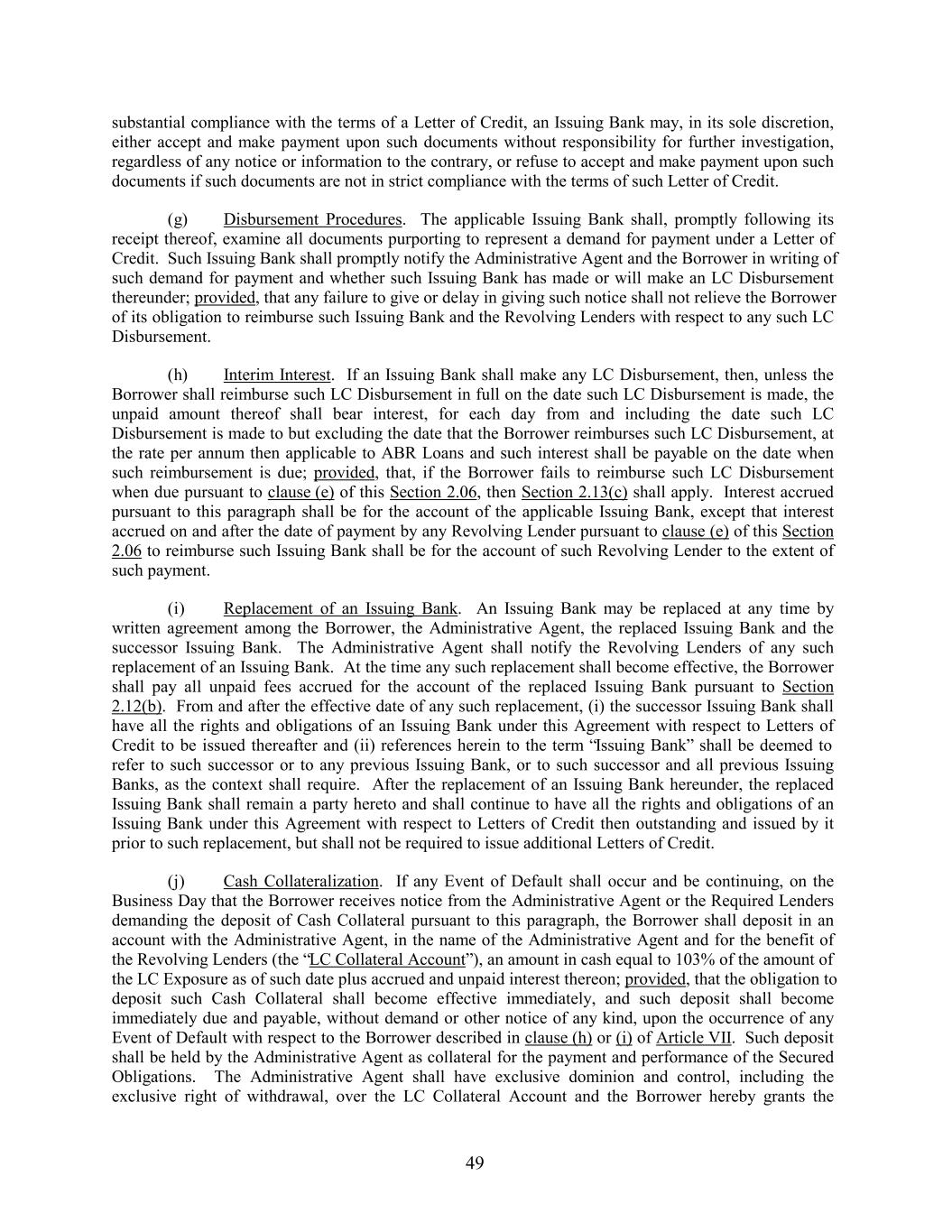 substantial compliance with the terms of a Letter of Credit, an Issuing Bank may, in its sole discretion, either accept and make payment upon such documents without responsibility for further investigation, regardless of any notice or information to the contrary, or refuse to accept and make payment upon such documents if such documents are not in strict compliance with the terms of such Letter of Credit. (g) Disbursement Procedures. The applicable Issuing Bank shall, promptly following its receipt thereof, examine all documents purporting to represent a demand for payment under a Letter of Credit. Such Issuing Bank shall promptly notify the Administrative Agent and the Borrower in writing of such demand for payment and whether such Issuing Bank has made or will make an LC Disbursement thereunder; provided, that any failure to give or delay in giving such notice shall not relieve the Borrower of its obligation to reimburse such Issuing Bank and the Revolving Lenders with respect to any such LC Disbursement. (h) Interim Interest. If an Issuing Bank shall make any LC Disbursement, then, unless the Borrower shall reimburse such LC Disbursement in full on the date such LC Disbursement is made, the unpaid amount thereof shall bear interest, for each day from and including the date such LC Disbursement is made to but excluding the date that the Borrower reimburses such LC Disbursement, at the rate per annum then applicable to ABR Loans and such interest shall be payable on the date when such reimbursement is due; provided, that, if the Borrower fails to reimburse such LC Disbursement when due pursuant to clause (e) of this Section 2.06, then Section 2.13(c) shall apply. Interest accrued pursuant to this paragraph shall be for the account of the applicable Issuing Bank, except that interest accrued on and after the date of payment by any Revolving Lender pursuant to clause (e) of this Section 2.06 to reimburse such Issuing Bank shall be for the account of such Revolving Lender to the extent of such payment. (i) Replacement of an Issuing Bank. An Issuing Bank may be replaced at any time by written agreement among the Borrower, the Administrative Agent, the replaced Issuing Bank and the successor Issuing Bank. The Administrative Agent shall notify the Revolving Lenders of any such replacement of an Issuing Bank. At the time any such replacement shall become effective, the Borrower shall pay all unpaid fees accrued for the account of the replaced Issuing Bank pursuant to Section 2.12(b). From and after the effective date of any such replacement, (i) the successor Issuing Bank shall have all the rights and obligations of an Issuing Bank under this Agreement with respect to Letters of Credit to be issued thereafter and (ii) references herein to the term “Issuing Bank” shall be deemed to refer to such successor or to any previous Issuing Bank, or to such successor and all previous Issuing Banks, as the context shall require. After the replacement of an Issuing Bank hereunder, the replaced Issuing Bank shall remain a party hereto and shall continue to have all the rights and obligations of an Issuing Bank under this Agreement with respect to Letters of Credit then outstanding and issued by it prior to such replacement, but shall not be required to issue additional Letters of Credit. (j) Cash Collateralization. If any Event of Default shall occur and be continuing, on the Business Day that the Borrower receives notice from the Administrative Agent or the Required Lenders demanding the deposit of Cash Collateral pursuant to this paragraph, the Borrower shall deposit in an account with the Administrative Agent, in the name of the Administrative Agent and for the benefit of the Revolving Lenders (the “LC Collateral Account”), an amount in cash equal to 103% of the amount of the LC Exposure as of such date plus accrued and unpaid interest thereon; provided, that the obligation to deposit such Cash Collateral shall become effective immediately, and such deposit shall become immediately due and payable, without demand or other notice of any kind, upon the occurrence of any Event of Default with respect to the Borrower described in clause (h) or (i) of Article VII. Such deposit shall be held by the Administrative Agent as collateral for the payment and performance of the Secured Obligations. The Administrative Agent shall have exclusive dominion and control, including the exclusive right of withdrawal, over the LC Collateral Account and the Borrower hereby grants the 49