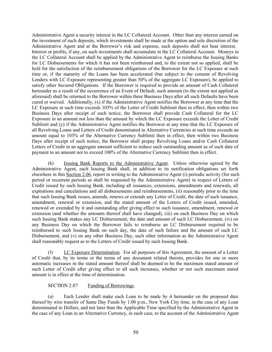 Administrative Agent a security interest in the LC Collateral Account. Other than any interest earned on the investment of such deposits, which investments shall be made at the option and sole discretion of the Administrative Agent and at the Borrower’s risk and expense, such deposits shall not bear interest. Interest or profits, if any, on such investments shall accumulate in the LC Collateral Account. Moneys in the LC Collateral Account shall be applied by the Administrative Agent to reimburse the Issuing Banks for LC Disbursements for which it has not been reimbursed and, to the extent not so applied, shall be held for the satisfaction of the reimbursement obligations of the Borrower for the LC Exposure at such time or, if the maturity of the Loans has been accelerated (but subject to the consent of Revolving Lenders with LC Exposure representing greater than 50% of the aggregate LC Exposure), be applied to satisfy other Secured Obligations. If the Borrower is required to provide an amount of Cash Collateral hereunder as a result of the occurrence of an Event of Default, such amount (to the extent not applied as aforesaid) shall be returned to the Borrower within three Business Days after all such Defaults have been cured or waived. Additionally, (x) if the Administrative Agent notifies the Borrower at any time that the LC Exposure at such time exceeds 103% of the Letter of Credit Sublimit then in effect, then within two Business Days after receipt of such notice, the Borrower shall provide Cash Collateral for the LC Exposure in an amount not less than the amount by which the LC Exposure exceeds the Letter of Credit Sublimit and (y) if the Administrative Agent notifies the Borrower at any time that the LC Exposure of all Revolving Loans and Letters of Credit denominated in Alternative Currencies at such time exceeds an amount equal to 103% of the Alternative Currency Sublimit then in effect, then within two Business Days after receipt of such notice, the Borrower shall prepay Revolving Loans and/or Cash Collateral Letters of Credit in an aggregate amount sufficient to reduce such outstanding amount as of such date of payment to an amount not to exceed 100% of the Alternative Currency Sublimit then in effect. (k) Issuing Bank Reports to the Administrative Agent. Unless otherwise agreed by the Administrative Agent, each Issuing Bank shall, in addition to its notification obligations set forth elsewhere in this Section 2.06, report in writing to the Administrative Agent (i) periodic activity (for such period or recurrent periods as shall be requested by the Administrative Agent) in respect of Letters of Credit issued by such Issuing Bank, including all issuances, extensions, amendments and renewals, all expirations and cancelations and all disbursements and reimbursements, (ii) reasonably prior to the time that such Issuing Bank issues, amends, renews or extends any Letter of Credit, the date of such issuance, amendment, renewal or extension, and the stated amount of the Letters of Credit issued, amended, renewed or extended by it and outstanding after giving effect to such issuance, amendment, renewal or extension (and whether the amounts thereof shall have changed), (iii) on each Business Day on which such Issuing Bank makes any LC Disbursement, the date and amount of such LC Disbursement, (iv) on any Business Day on which the Borrower fails to reimburse an LC Disbursement required to be reimbursed to such Issuing Bank on such day, the date of such failure and the amount of such LC Disbursement, and (v) on any other Business Day, such other information as the Administrative Agent shall reasonably request as to the Letters of Credit issued by such Issuing Bank. (l) LC Exposure Determination. For all purposes of this Agreement, the amount of a Letter of Credit that, by its terms or the terms of any document related thereto, provides for one or more automatic increases in the stated amount thereof shall be deemed to be the maximum stated amount of such Letter of Credit after giving effect to all such increases, whether or not such maximum stated amount is in effect at the time of determination. SECTION 2.07 Funding of Borrowings. (a) Each Lender shall make each Loan to be made by it hereunder on the proposed date thereof by wire transfer of Same Day Funds by 1:00 p.m., New York City time, in the case of any Loan denominated in Dollars, and not later than the Applicable Time specified by the Administrative Agent in the case of any Loan in an Alternative Currency, in each case, to the account of the Administrative Agent 50