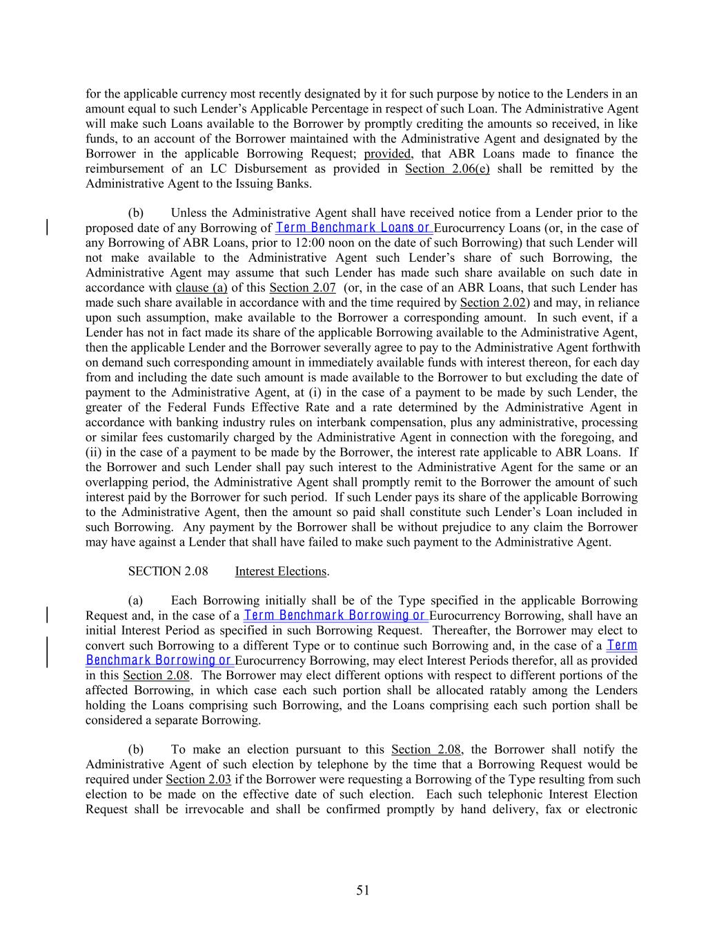 for the applicable currency most recently designated by it for such purpose by notice to the Lenders in an amount equal to such Lender’s Applicable Percentage in respect of such Loan. The Administrative Agent will make such Loans available to the Borrower by promptly crediting the amounts so received, in like funds, to an account of the Borrower maintained with the Administrative Agent and designated by the Borrower in the applicable Borrowing Request; provided, that ABR Loans made to finance the reimbursement of an LC Disbursement as provided in Section 2.06(e) shall be remitted by the Administrative Agent to the Issuing Banks. (b) Unless the Administrative Agent shall have received notice from a Lender prior to the proposed date of any Borrowing of Term Benchmark Loans or Eurocurrency Loans (or, in the case of any Borrowing of ABR Loans, prior to 12:00 noon on the date of such Borrowing) that such Lender will not make available to the Administrative Agent such Lender’s share of such Borrowing, the Administrative Agent may assume that such Lender has made such share available on such date in accordance with clause (a) of this Section 2.07 (or, in the case of an ABR Loans, that such Lender has made such share available in accordance with and the time required by Section 2.02) and may, in reliance upon such assumption, make available to the Borrower a corresponding amount. In such event, if a Lender has not in fact made its share of the applicable Borrowing available to the Administrative Agent, then the applicable Lender and the Borrower severally agree to pay to the Administrative Agent forthwith on demand such corresponding amount in immediately available funds with interest thereon, for each day from and including the date such amount is made available to the Borrower to but excluding the date of payment to the Administrative Agent, at (i) in the case of a payment to be made by such Lender, the greater of the Federal Funds Effective Rate and a rate determined by the Administrative Agent in accordance with banking industry rules on interbank compensation, plus any administrative, processing or similar fees customarily charged by the Administrative Agent in connection with the foregoing, and (ii) in the case of a payment to be made by the Borrower, the interest rate applicable to ABR Loans. If the Borrower and such Lender shall pay such interest to the Administrative Agent for the same or an overlapping period, the Administrative Agent shall promptly remit to the Borrower the amount of such interest paid by the Borrower for such period. If such Lender pays its share of the applicable Borrowing to the Administrative Agent, then the amount so paid shall constitute such Lender’s Loan included in such Borrowing. Any payment by the Borrower shall be without prejudice to any claim the Borrower may have against a Lender that shall have failed to make such payment to the Administrative Agent. SECTION 2.08 Interest Elections. (a) Each Borrowing initially shall be of the Type specified in the applicable Borrowing Request and, in the case of a Term Benchmark Bor rowing or Eurocurrency Borrowing, shall have an initial Interest Period as specified in such Borrowing Request. Thereafter, the Borrower may elect to convert such Borrowing to a different Type or to continue such Borrowing and, in the case of a Term Benchmark Bor rowing or Eurocurrency Borrowing, may elect Interest Periods therefor, all as provided in this Section 2.08. The Borrower may elect different options with respect to different portions of the affected Borrowing, in which case each such portion shall be allocated ratably among the Lenders holding the Loans comprising such Borrowing, and the Loans comprising each such portion shall be considered a separate Borrowing. (b) To make an election pursuant to this Section 2.08, the Borrower shall notify the Administrative Agent of such election by telephone by the time that a Borrowing Request would be required under Section 2.03 if the Borrower were requesting a Borrowing of the Type resulting from such election to be made on the effective date of such election. Each such telephonic Interest Election Request shall be irrevocable and shall be confirmed promptly by hand delivery, fax or electronic 51