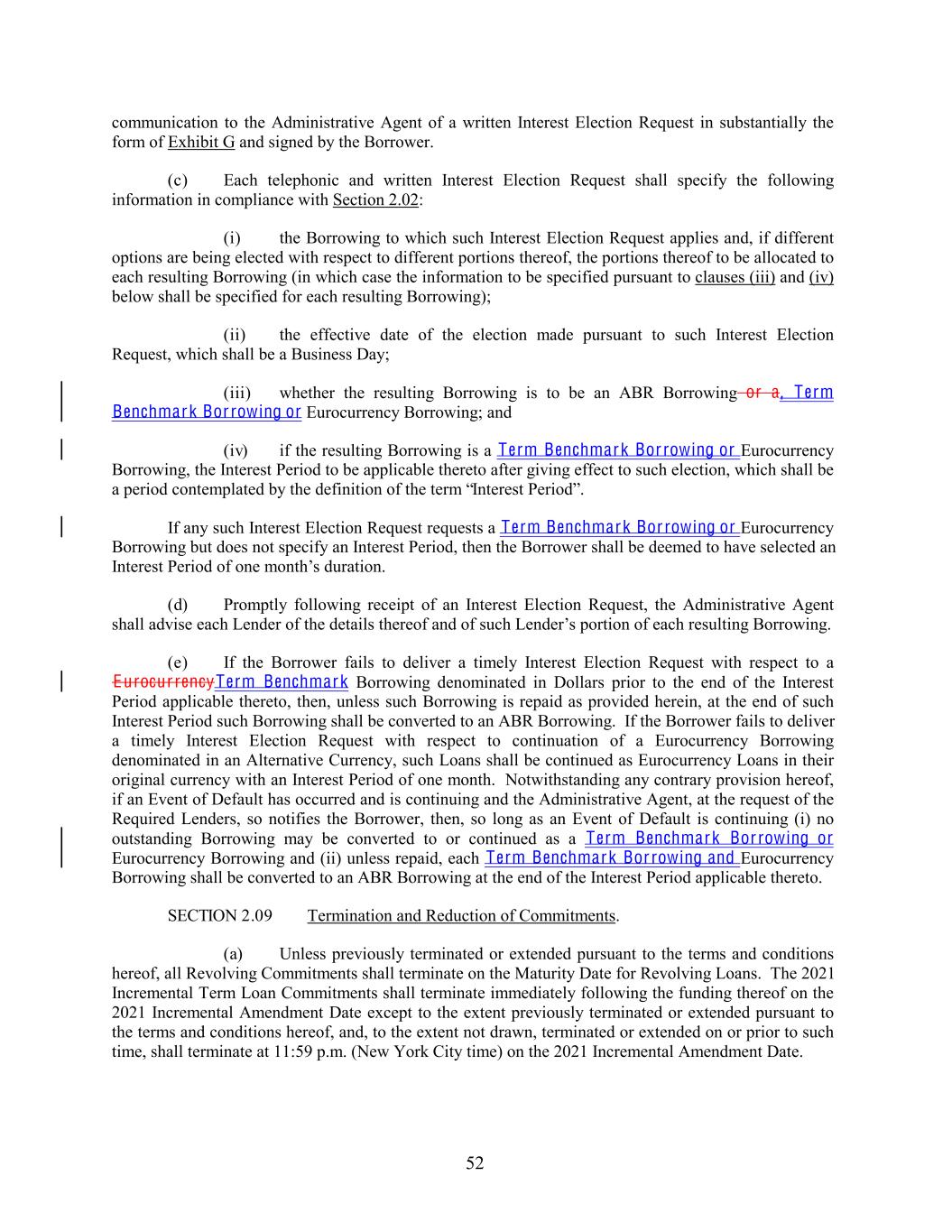 communication to the Administrative Agent of a written Interest Election Request in substantially the form of Exhibit G and signed by the Borrower. (c) Each telephonic and written Interest Election Request shall specify the following information in compliance with Section 2.02: (i) the Borrowing to which such Interest Election Request applies and, if different options are being elected with respect to different portions thereof, the portions thereof to be allocated to each resulting Borrowing (in which case the information to be specified pursuant to clauses (iii) and (iv) below shall be specified for each resulting Borrowing); (ii) the effective date of the election made pursuant to such Interest Election Request, which shall be a Business Day; (iii) whether the resulting Borrowing is to be an ABR Borrowing or a, Term Benchmark Bor rowing or Eurocurrency Borrowing; and (iv) if the resulting Borrowing is a Term Benchmark Bor rowing or Eurocurrency Borrowing, the Interest Period to be applicable thereto after giving effect to such election, which shall be a period contemplated by the definition of the term “Interest Period”. If any such Interest Election Request requests a Term Benchmark Bor rowing or Eurocurrency Borrowing but does not specify an Interest Period, then the Borrower shall be deemed to have selected an Interest Period of one month’s duration. (d) Promptly following receipt of an Interest Election Request, the Administrative Agent shall advise each Lender of the details thereof and of such Lender’s portion of each resulting Borrowing. (e) If the Borrower fails to deliver a timely Interest Election Request with respect to a Eurocur rencyTerm Benchmark Borrowing denominated in Dollars prior to the end of the Interest Period applicable thereto, then, unless such Borrowing is repaid as provided herein, at the end of such Interest Period such Borrowing shall be converted to an ABR Borrowing. If the Borrower fails to deliver a timely Interest Election Request with respect to continuation of a Eurocurrency Borrowing denominated in an Alternative Currency, such Loans shall be continued as Eurocurrency Loans in their original currency with an Interest Period of one month. Notwithstanding any contrary provision hereof, if an Event of Default has occurred and is continuing and the Administrative Agent, at the request of the Required Lenders, so notifies the Borrower, then, so long as an Event of Default is continuing (i) no outstanding Borrowing may be converted to or continued as a Term Benchmark Bor rowing or Eurocurrency Borrowing and (ii) unless repaid, each Term Benchmark Bor rowing and Eurocurrency Borrowing shall be converted to an ABR Borrowing at the end of the Interest Period applicable thereto. SECTION 2.09 Termination and Reduction of Commitments. (a) Unless previously terminated or extended pursuant to the terms and conditions hereof, all Revolving Commitments shall terminate on the Maturity Date for Revolving Loans. The 2021 Incremental Term Loan Commitments shall terminate immediately following the funding thereof on the 2021 Incremental Amendment Date except to the extent previously terminated or extended pursuant to the terms and conditions hereof, and, to the extent not drawn, terminated or extended on or prior to such time, shall terminate at 11:59 p.m. (New York City time) on the 2021 Incremental Amendment Date. 52