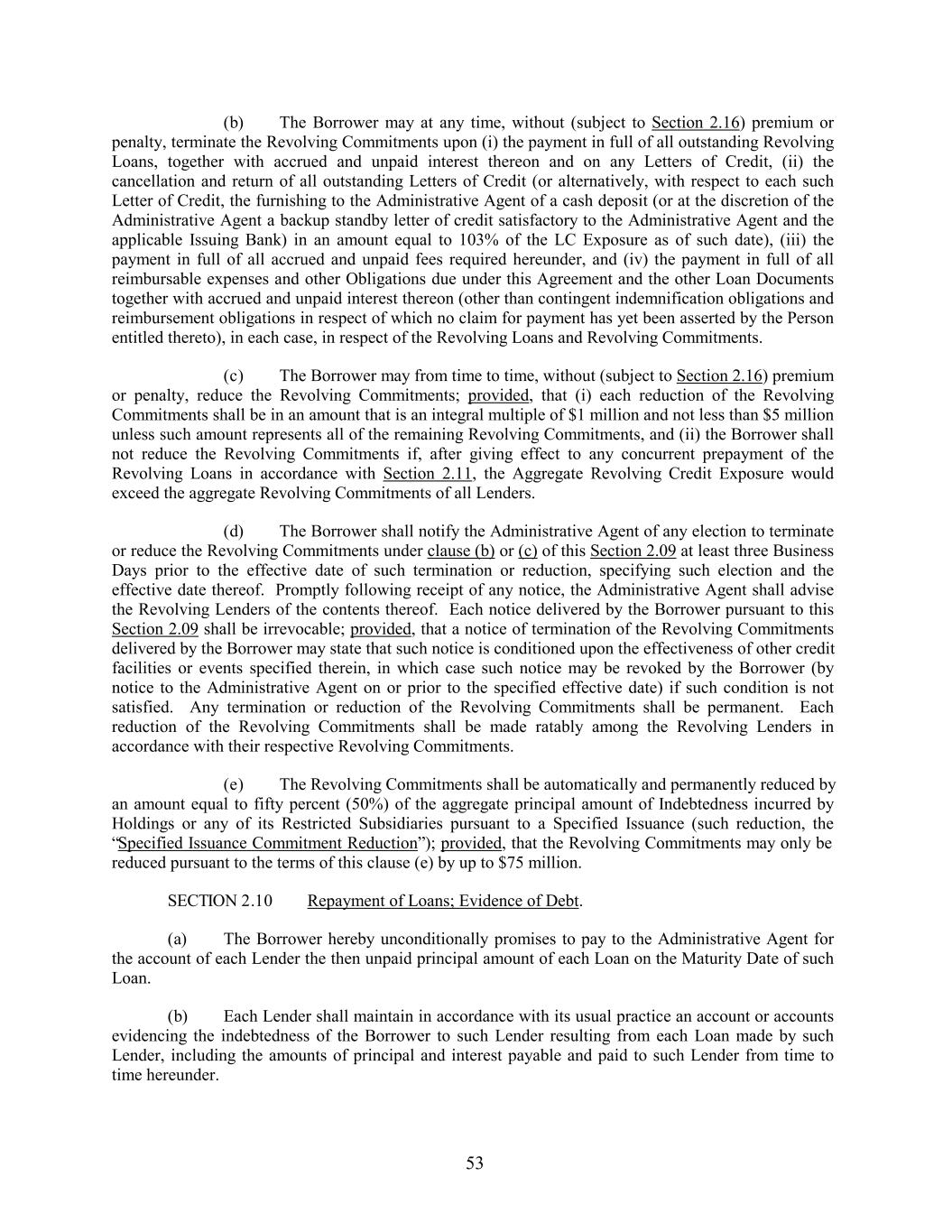 (b) The Borrower may at any time, without (subject to Section 2.16) premium or penalty, terminate the Revolving Commitments upon (i) the payment in full of all outstanding Revolving Loans, together with accrued and unpaid interest thereon and on any Letters of Credit, (ii) the cancellation and return of all outstanding Letters of Credit (or alternatively, with respect to each such Letter of Credit, the furnishing to the Administrative Agent of a cash deposit (or at the discretion of the Administrative Agent a backup standby letter of credit satisfactory to the Administrative Agent and the applicable Issuing Bank) in an amount equal to 103% of the LC Exposure as of such date), (iii) the payment in full of all accrued and unpaid fees required hereunder, and (iv) the payment in full of all reimbursable expenses and other Obligations due under this Agreement and the other Loan Documents together with accrued and unpaid interest thereon (other than contingent indemnification obligations and reimbursement obligations in respect of which no claim for payment has yet been asserted by the Person entitled thereto), in each case, in respect of the Revolving Loans and Revolving Commitments. (c) The Borrower may from time to time, without (subject to Section 2.16) premium or penalty, reduce the Revolving Commitments; provided, that (i) each reduction of the Revolving Commitments shall be in an amount that is an integral multiple of $1 million and not less than $5 million unless such amount represents all of the remaining Revolving Commitments, and (ii) the Borrower shall not reduce the Revolving Commitments if, after giving effect to any concurrent prepayment of the Revolving Loans in accordance with Section 2.11, the Aggregate Revolving Credit Exposure would exceed the aggregate Revolving Commitments of all Lenders. (d) The Borrower shall notify the Administrative Agent of any election to terminate or reduce the Revolving Commitments under clause (b) or (c) of this Section 2.09 at least three Business Days prior to the effective date of such termination or reduction, specifying such election and the effective date thereof. Promptly following receipt of any notice, the Administrative Agent shall advise the Revolving Lenders of the contents thereof. Each notice delivered by the Borrower pursuant to this Section 2.09 shall be irrevocable; provided, that a notice of termination of the Revolving Commitments delivered by the Borrower may state that such notice is conditioned upon the effectiveness of other credit facilities or events specified therein, in which case such notice may be revoked by the Borrower (by notice to the Administrative Agent on or prior to the specified effective date) if such condition is not satisfied. Any termination or reduction of the Revolving Commitments shall be permanent. Each reduction of the Revolving Commitments shall be made ratably among the Revolving Lenders in accordance with their respective Revolving Commitments. (e) The Revolving Commitments shall be automatically and permanently reduced by an amount equal to fifty percent (50%) of the aggregate principal amount of Indebtedness incurred by Holdings or any of its Restricted Subsidiaries pursuant to a Specified Issuance (such reduction, the “Specified Issuance Commitment Reduction”); provided, that the Revolving Commitments may only be reduced pursuant to the terms of this clause (e) by up to $75 million. SECTION 2.10 Repayment of Loans; Evidence of Debt. (a) The Borrower hereby unconditionally promises to pay to the Administrative Agent for the account of each Lender the then unpaid principal amount of each Loan on the Maturity Date of such Loan. (b) Each Lender shall maintain in accordance with its usual practice an account or accounts evidencing the indebtedness of the Borrower to such Lender resulting from each Loan made by such Lender, including the amounts of principal and interest payable and paid to such Lender from time to time hereunder. 53