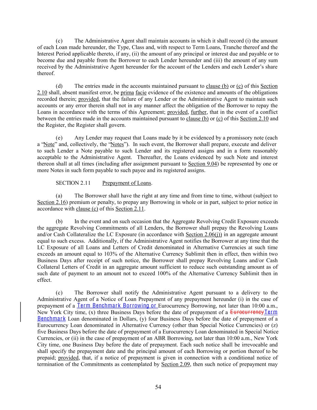 (c) The Administrative Agent shall maintain accounts in which it shall record (i) the amount of each Loan made hereunder, the Type, Class and, with respect to Term Loans, Tranche thereof and the Interest Period applicable thereto, if any, (ii) the amount of any principal or interest due and payable or to become due and payable from the Borrower to each Lender hereunder and (iii) the amount of any sum received by the Administrative Agent hereunder for the account of the Lenders and each Lender’s share thereof. (d) The entries made in the accounts maintained pursuant to clause (b) or (c) of this Section 2.10 shall, absent manifest error, be prima facie evidence of the existence and amounts of the obligations recorded therein; provided, that the failure of any Lender or the Administrative Agent to maintain such accounts or any error therein shall not in any manner affect the obligation of the Borrower to repay the Loans in accordance with the terms of this Agreement; provided, further, that in the event of a conflict between the entries made in the accounts maintained pursuant to clause (b) or (c) of this Section 2.10 and the Register, the Register shall govern. (e) Any Lender may request that Loans made by it be evidenced by a promissory note (each a “Note” and, collectively, the “Notes”). In such event, the Borrower shall prepare, execute and deliver to such Lender a Note payable to such Lender and its registered assigns and in a form reasonably acceptable to the Administrative Agent. Thereafter, the Loans evidenced by such Note and interest thereon shall at all times (including after assignment pursuant to Section 9.04) be represented by one or more Notes in such form payable to such payee and its registered assigns. SECTION 2.11 Prepayment of Loans. (a) The Borrower shall have the right at any time and from time to time, without (subject to Section 2.16) premium or penalty, to prepay any Borrowing in whole or in part, subject to prior notice in accordance with clause (c) of this Section 2.11. (b) In the event and on such occasion that the Aggregate Revolving Credit Exposure exceeds the aggregate Revolving Commitments of all Lenders, the Borrower shall prepay the Revolving Loans and/or Cash Collateralize the LC Exposure (in accordance with Section 2.06(j)) in an aggregate amount equal to such excess. Additionally, if the Administrative Agent notifies the Borrower at any time that the LC Exposure of all Loans and Letters of Credit denominated in Alternative Currencies at such time exceeds an amount equal to 103% of the Alternative Currency Sublimit then in effect, then within two Business Days after receipt of such notice, the Borrower shall prepay Revolving Loans and/or Cash Collateral Letters of Credit in an aggregate amount sufficient to reduce such outstanding amount as of such date of payment to an amount not to exceed 100% of the Alternative Currency Sublimit then in effect. (c) The Borrower shall notify the Administrative Agent pursuant to a delivery to the Administrative Agent of a Notice of Loan Prepayment of any prepayment hereunder (i) in the case of prepayment of a Term Benchmark Bor rowing or Eurocurrency Borrowing, not later than 10:00 a.m., New York City time, (x) three Business Days before the date of prepayment of a Eurocur rencyTerm Benchmark Loan denominated in Dollars, (y) four Business Days before the date of prepayment of a Eurocurrency Loan denominated in Alternative Currency (other than Special Notice Currencies) or (z) five Business Days before the date of prepayment of a Eurocurrency Loan denominated in Special Notice Currencies, or (ii) in the case of prepayment of an ABR Borrowing, not later than 10:00 a.m., New York City time, one Business Day before the date of prepayment. Each such notice shall be irrevocable and shall specify the prepayment date and the principal amount of each Borrowing or portion thereof to be prepaid; provided, that, if a notice of prepayment is given in connection with a conditional notice of termination of the Commitments as contemplated by Section 2.09, then such notice of prepayment may 54