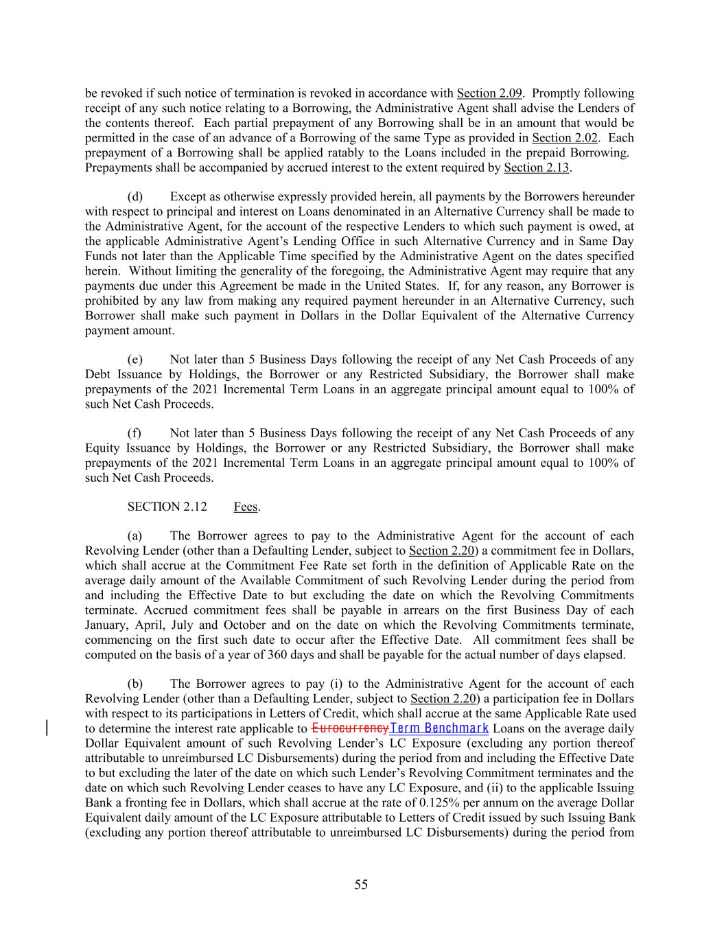 be revoked if such notice of termination is revoked in accordance with Section 2.09. Promptly following receipt of any such notice relating to a Borrowing, the Administrative Agent shall advise the Lenders of the contents thereof. Each partial prepayment of any Borrowing shall be in an amount that would be permitted in the case of an advance of a Borrowing of the same Type as provided in Section 2.02. Each prepayment of a Borrowing shall be applied ratably to the Loans included in the prepaid Borrowing. Prepayments shall be accompanied by accrued interest to the extent required by Section 2.13. (d) Except as otherwise expressly provided herein, all payments by the Borrowers hereunder with respect to principal and interest on Loans denominated in an Alternative Currency shall be made to the Administrative Agent, for the account of the respective Lenders to which such payment is owed, at the applicable Administrative Agent’s Lending Office in such Alternative Currency and in Same Day Funds not later than the Applicable Time specified by the Administrative Agent on the dates specified herein. Without limiting the generality of the foregoing, the Administrative Agent may require that any payments due under this Agreement be made in the United States. If, for any reason, any Borrower is prohibited by any law from making any required payment hereunder in an Alternative Currency, such Borrower shall make such payment in Dollars in the Dollar Equivalent of the Alternative Currency payment amount. (e) Not later than 5 Business Days following the receipt of any Net Cash Proceeds of any Debt Issuance by Holdings, the Borrower or any Restricted Subsidiary, the Borrower shall make prepayments of the 2021 Incremental Term Loans in an aggregate principal amount equal to 100% of such Net Cash Proceeds. (f) Not later than 5 Business Days following the receipt of any Net Cash Proceeds of any Equity Issuance by Holdings, the Borrower or any Restricted Subsidiary, the Borrower shall make prepayments of the 2021 Incremental Term Loans in an aggregate principal amount equal to 100% of such Net Cash Proceeds. SECTION 2.12 Fees. (a) The Borrower agrees to pay to the Administrative Agent for the account of each Revolving Lender (other than a Defaulting Lender, subject to Section 2.20) a commitment fee in Dollars, which shall accrue at the Commitment Fee Rate set forth in the definition of Applicable Rate on the average daily amount of the Available Commitment of such Revolving Lender during the period from and including the Effective Date to but excluding the date on which the Revolving Commitments terminate. Accrued commitment fees shall be payable in arrears on the first Business Day of each January, April, July and October and on the date on which the Revolving Commitments terminate, commencing on the first such date to occur after the Effective Date. All commitment fees shall be computed on the basis of a year of 360 days and shall be payable for the actual number of days elapsed. (b) The Borrower agrees to pay (i) to the Administrative Agent for the account of each Revolving Lender (other than a Defaulting Lender, subject to Section 2.20) a participation fee in Dollars with respect to its participations in Letters of Credit, which shall accrue at the same Applicable Rate used to determine the interest rate applicable to Eurocur rencyTerm Benchmark Loans on the average daily Dollar Equivalent amount of such Revolving Lender’s LC Exposure (excluding any portion thereof attributable to unreimbursed LC Disbursements) during the period from and including the Effective Date to but excluding the later of the date on which such Lender’s Revolving Commitment terminates and the date on which such Revolving Lender ceases to have any LC Exposure, and (ii) to the applicable Issuing Bank a fronting fee in Dollars, which shall accrue at the rate of 0.125% per annum on the average Dollar Equivalent daily amount of the LC Exposure attributable to Letters of Credit issued by such Issuing Bank (excluding any portion thereof attributable to unreimbursed LC Disbursements) during the period from 55