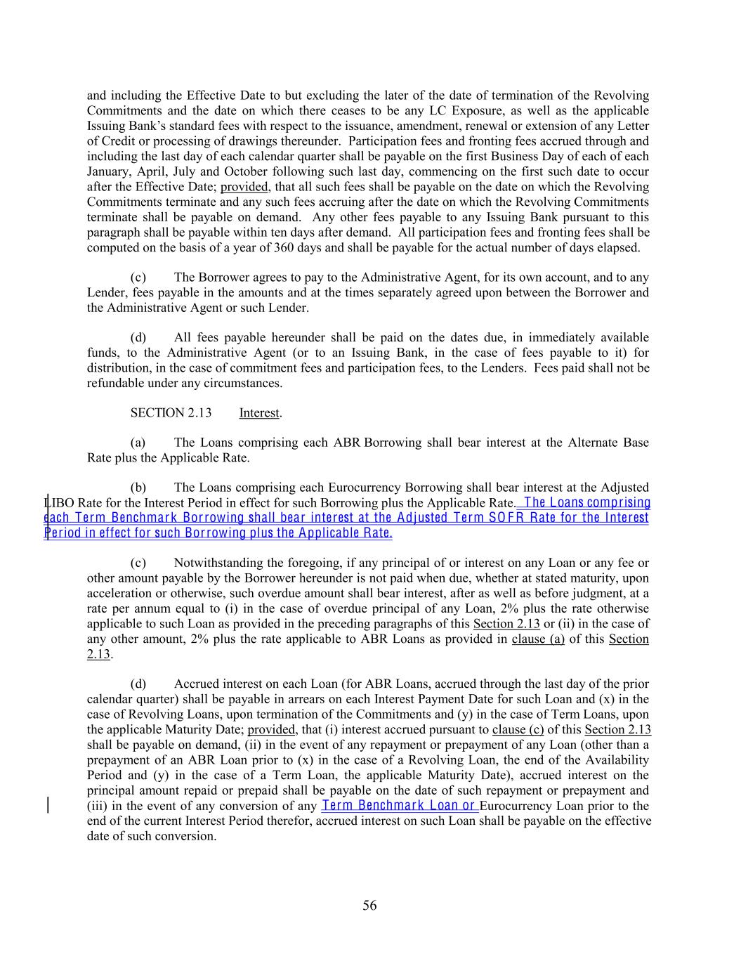 and including the Effective Date to but excluding the later of the date of termination of the Revolving Commitments and the date on which there ceases to be any LC Exposure, as well as the applicable Issuing Bank’s standard fees with respect to the issuance, amendment, renewal or extension of any Letter of Credit or processing of drawings thereunder. Participation fees and fronting fees accrued through and including the last day of each calendar quarter shall be payable on the first Business Day of each of each January, April, July and October following such last day, commencing on the first such date to occur after the Effective Date; provided, that all such fees shall be payable on the date on which the Revolving Commitments terminate and any such fees accruing after the date on which the Revolving Commitments terminate shall be payable on demand. Any other fees payable to any Issuing Bank pursuant to this paragraph shall be payable within ten days after demand. All participation fees and fronting fees shall be computed on the basis of a year of 360 days and shall be payable for the actual number of days elapsed. (c) The Borrower agrees to pay to the Administrative Agent, for its own account, and to any Lender, fees payable in the amounts and at the times separately agreed upon between the Borrower and the Administrative Agent or such Lender. (d) All fees payable hereunder shall be paid on the dates due, in immediately available funds, to the Administrative Agent (or to an Issuing Bank, in the case of fees payable to it) for distribution, in the case of commitment fees and participation fees, to the Lenders. Fees paid shall not be refundable under any circumstances. SECTION 2.13 Interest. (a) The Loans comprising each ABR Borrowing shall bear interest at the Alternate Base Rate plus the Applicable Rate. (b) The Loans comprising each Eurocurrency Borrowing shall bear interest at the Adjusted LIBO Rate for the Interest Period in effect for such Borrowing plus the Applicable Rate. The Loans comprising each Term Benchmark Bor rowing shall bear interest at the Adjusted Term SO F R Rate for the Interest Per iod in effect for such Bor rowing plus the Applicable Rate. (c) Notwithstanding the foregoing, if any principal of or interest on any Loan or any fee or other amount payable by the Borrower hereunder is not paid when due, whether at stated maturity, upon acceleration or otherwise, such overdue amount shall bear interest, after as well as before judgment, at a rate per annum equal to (i) in the case of overdue principal of any Loan, 2% plus the rate otherwise applicable to such Loan as provided in the preceding paragraphs of this Section 2.13 or (ii) in the case of any other amount, 2% plus the rate applicable to ABR Loans as provided in clause (a) of this Section 2.13. (d) Accrued interest on each Loan (for ABR Loans, accrued through the last day of the prior calendar quarter) shall be payable in arrears on each Interest Payment Date for such Loan and (x) in the case of Revolving Loans, upon termination of the Commitments and (y) in the case of Term Loans, upon the applicable Maturity Date; provided, that (i) interest accrued pursuant to clause (c) of this Section 2.13 shall be payable on demand, (ii) in the event of any repayment or prepayment of any Loan (other than a prepayment of an ABR Loan prior to (x) in the case of a Revolving Loan, the end of the Availability Period and (y) in the case of a Term Loan, the applicable Maturity Date), accrued interest on the principal amount repaid or prepaid shall be payable on the date of such repayment or prepayment and (iii) in the event of any conversion of any Term Benchmark Loan or Eurocurrency Loan prior to the end of the current Interest Period therefor, accrued interest on such Loan shall be payable on the effective date of such conversion. 56