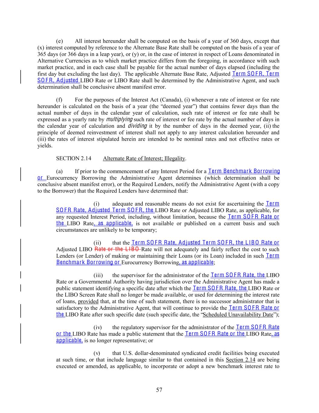 (e) All interest hereunder shall be computed on the basis of a year of 360 days, except that (x) interest computed by reference to the Alternate Base Rate shall be computed on the basis of a year of 365 days (or 366 days in a leap year), or (y) or, in the case of interest in respect of Loans denominated in Alternative Currencies as to which market practice differs from the foregoing, in accordance with such market practice, and in each case shall be payable for the actual number of days elapsed (including the first day but excluding the last day). The applicable Alternate Base Rate, Adjusted Term SO F R , Term SO F R , Adjusted LIBO Rate or LIBO Rate shall be determined by the Administrative Agent, and such determination shall be conclusive absent manifest error. (f) For the purposes of the Interest Act (Canada), (i) whenever a rate of interest or fee rate hereunder is calculated on the basis of a year (the “deemed year”) that contains fewer days than the actual number of days in the calendar year of calculation, such rate of interest or fee rate shall be expressed as a yearly rate by multiplying such rate of interest or fee rate by the actual number of days in the calendar year of calculation and dividing it by the number of days in the deemed year, (ii) the principle of deemed reinvestment of interest shall not apply to any interest calculation hereunder and (iii) the rates of interest stipulated herein are intended to be nominal rates and not effective rates or yields. SECTION 2.14 Alternate Rate of Interest; Illegality. (a) If prior to the commencement of any Interest Period for a Term Benchmark Bor rowing or Eurocurrency Borrowing the Administrative Agent determines (which determination shall be conclusive absent manifest error), or the Required Lenders, notify the Administrative Agent (with a copy to the Borrower) that the Required Lenders have determined that: (i) adequate and reasonable means do not exist for ascertaining the Term SO F R Rate, Adjusted Term SO F R , the LIBO Rate or Adjusted LIBO Rate, as applicable, for any requested Interest Period, including, without limitation, because the Term SO F R Rate or the LIBO Rate, as applicable, is not available or published on a current basis and such circumstances are unlikely to be temporary; (ii) that the Term SO F R Rate, Adjusted Term SO F R , the L IB O Rate or Adjusted LIBO Rate or the L IB O Rate will not adequately and fairly reflect the cost to such Lenders (or Lender) of making or maintaining their Loans (or its Loan) included in such Term Benchmark Bor rowing or Eurocurrency Borrowing, as applicable; (iii) the supervisor for the administrator of the Term SO F R Rate, the LIBO Rate or a Governmental Authority having jurisdiction over the Administrative Agent has made a public statement identifying a specific date after which the Term SO F R Rate, the LIBO Rate or the LIBO Screen Rate shall no longer be made available, or used for determining the interest rate of loans, provided that, at the time of such statement, there is no successor administrator that is satisfactory to the Administrative Agent, that will continue to provide the Term SO F R Rate or the LIBO Rate after such specific date (such specific date, the “Scheduled Unavailability Date”); (iv) the regulatory supervisor for the administrator of the Term SO F R Rate or the LIBO Rate has made a public statement that the Term SO F R Rate or the LIBO Rate, as applicable, is no longer representative; or (v) that U.S. dollar-denominated syndicated credit facilities being executed at such time, or that include language similar to that contained in this Section 2.14 are being executed or amended, as applicable, to incorporate or adopt a new benchmark interest rate to 57