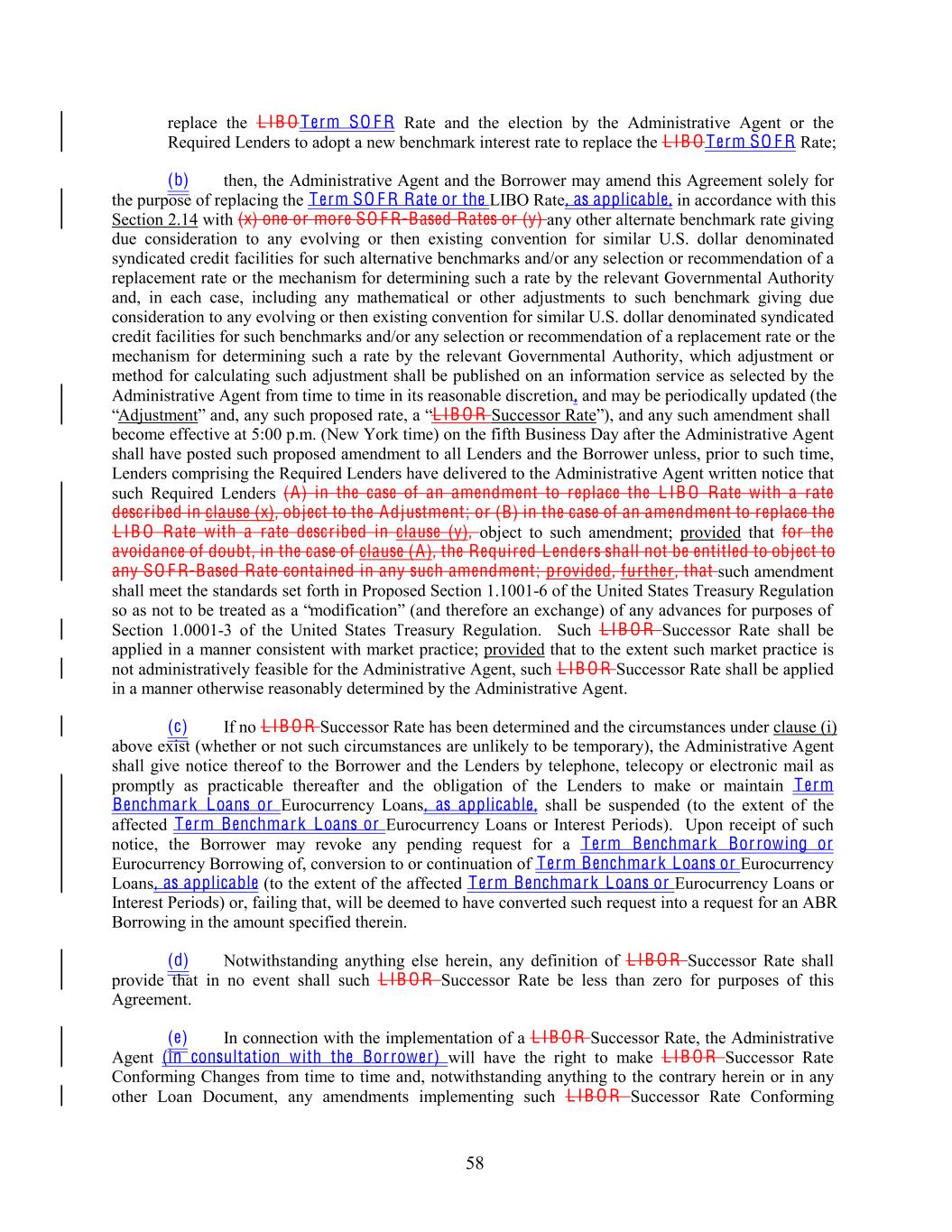 replace the L IB O Term SO F R Rate and the election by the Administrative Agent or the Required Lenders to adopt a new benchmark interest rate to replace the L IB O Term SO F R Rate; (b) then, the Administrative Agent and the Borrower may amend this Agreement solely for the purpose of replacing the Term SO F R Rate or the LIBO Rate, as applicable, in accordance with this Section 2.14 with (x) one or more SO F R-Based Rates or (y) any other alternate benchmark rate giving due consideration to any evolving or then existing convention for similar U.S. dollar denominated syndicated credit facilities for such alternative benchmarks and/or any selection or recommendation of a replacement rate or the mechanism for determining such a rate by the relevant Governmental Authority and, in each case, including any mathematical or other adjustments to such benchmark giving due consideration to any evolving or then existing convention for similar U.S. dollar denominated syndicated credit facilities for such benchmarks and/or any selection or recommendation of a replacement rate or the mechanism for determining such a rate by the relevant Governmental Authority, which adjustment or method for calculating such adjustment shall be published on an information service as selected by the Administrative Agent from time to time in its reasonable discretion, and may be periodically updated (the “Adjustment” and, any such proposed rate, a “L IB O R Successor Rate”), and any such amendment shall become effective at 5:00 p.m. (New York time) on the fifth Business Day after the Administrative Agent shall have posted such proposed amendment to all Lenders and the Borrower unless, prior to such time, Lenders comprising the Required Lenders have delivered to the Administrative Agent written notice that such Required Lenders (A) in the case of an amendment to replace the L IB O Rate with a rate descr ibed in clause (x), object to the Adjustment; or (B) in the case of an amendment to replace the L IB O Rate with a rate descr ibed in clause (y), object to such amendment; provided that for the avoidance of doubt, in the case of clause (A), the Required Lenders shall not be entitled to object to any SO F R-Based Rate contained in any such amendment; provided, further , that such amendment shall meet the standards set forth in Proposed Section 1.1001-6 of the United States Treasury Regulation so as not to be treated as a “modification” (and therefore an exchange) of any advances for purposes of Section 1.0001-3 of the United States Treasury Regulation. Such L IB O R Successor Rate shall be applied in a manner consistent with market practice; provided that to the extent such market practice is not administratively feasible for the Administrative Agent, such L IB O R Successor Rate shall be applied in a manner otherwise reasonably determined by the Administrative Agent. (c) If no L IB O R Successor Rate has been determined and the circumstances under clause (i) above exist (whether or not such circumstances are unlikely to be temporary), the Administrative Agent shall give notice thereof to the Borrower and the Lenders by telephone, telecopy or electronic mail as promptly as practicable thereafter and the obligation of the Lenders to make or maintain Term Benchmark Loans or Eurocurrency Loans, as applicable, shall be suspended (to the extent of the affected Term Benchmark Loans or Eurocurrency Loans or Interest Periods). Upon receipt of such notice, the Borrower may revoke any pending request for a Term Benchmark Bor rowing or Eurocurrency Borrowing of, conversion to or continuation of Term Benchmark Loans or Eurocurrency Loans, as applicable (to the extent of the affected Term Benchmark Loans or Eurocurrency Loans or Interest Periods) or, failing that, will be deemed to have converted such request into a request for an ABR Borrowing in the amount specified therein. (d) Notwithstanding anything else herein, any definition of L IB O R Successor Rate shall provide that in no event shall such L IB O R Successor Rate be less than zero for purposes of this Agreement. (e) In connection with the implementation of a L IB O R Successor Rate, the Administrative Agent (in consultation with the Bor rower) will have the right to make L IB O R Successor Rate Conforming Changes from time to time and, notwithstanding anything to the contrary herein or in any other Loan Document, any amendments implementing such L IB O R Successor Rate Conforming 58