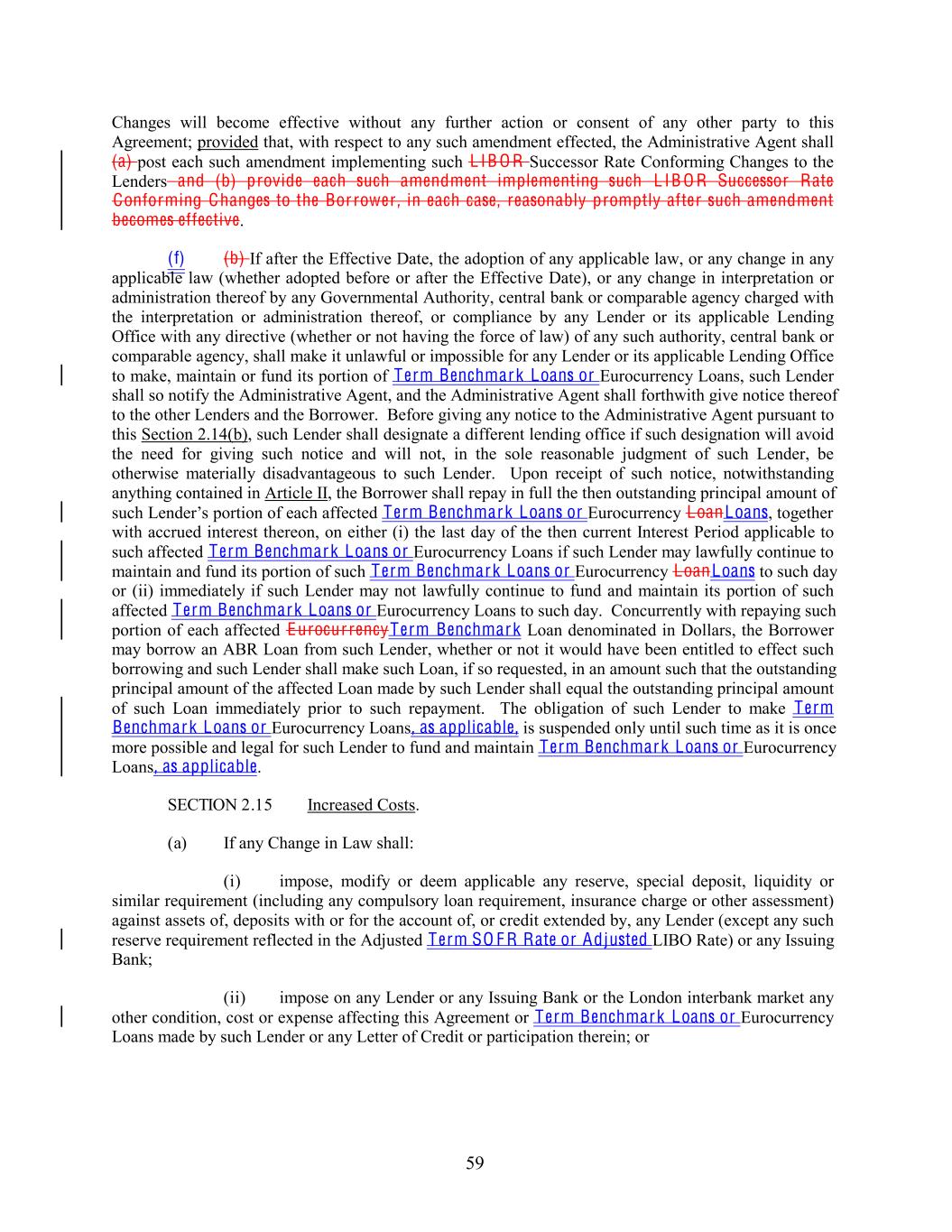 Changes will become effective without any further action or consent of any other party to this Agreement; provided that, with respect to any such amendment effected, the Administrative Agent shall (a) post each such amendment implementing such L IB O R Successor Rate Conforming Changes to the Lenders and (b) provide each such amendment implementing such L IB O R Successor Rate Conforming Changes to the Bor rower , in each case, reasonably promptly after such amendment becomes effective. (f) (b) If after the Effective Date, the adoption of any applicable law, or any change in any applicable law (whether adopted before or after the Effective Date), or any change in interpretation or administration thereof by any Governmental Authority, central bank or comparable agency charged with the interpretation or administration thereof, or compliance by any Lender or its applicable Lending Office with any directive (whether or not having the force of law) of any such authority, central bank or comparable agency, shall make it unlawful or impossible for any Lender or its applicable Lending Office to make, maintain or fund its portion of Term Benchmark Loans or Eurocurrency Loans, such Lender shall so notify the Administrative Agent, and the Administrative Agent shall forthwith give notice thereof to the other Lenders and the Borrower. Before giving any notice to the Administrative Agent pursuant to this Section 2.14(b), such Lender shall designate a different lending office if such designation will avoid the need for giving such notice and will not, in the sole reasonable judgment of such Lender, be otherwise materially disadvantageous to such Lender. Upon receipt of such notice, notwithstanding anything contained in Article II, the Borrower shall repay in full the then outstanding principal amount of such Lender’s portion of each affected Term Benchmark Loans or Eurocurrency LoanLoans, together with accrued interest thereon, on either (i) the last day of the then current Interest Period applicable to such affected Term Benchmark Loans or Eurocurrency Loans if such Lender may lawfully continue to maintain and fund its portion of such Term Benchmark Loans or Eurocurrency LoanLoans to such day or (ii) immediately if such Lender may not lawfully continue to fund and maintain its portion of such affected Term Benchmark Loans or Eurocurrency Loans to such day. Concurrently with repaying such portion of each affected Eurocur rencyTerm Benchmark Loan denominated in Dollars, the Borrower may borrow an ABR Loan from such Lender, whether or not it would have been entitled to effect such borrowing and such Lender shall make such Loan, if so requested, in an amount such that the outstanding principal amount of the affected Loan made by such Lender shall equal the outstanding principal amount of such Loan immediately prior to such repayment. The obligation of such Lender to make Term Benchmark Loans or Eurocurrency Loans, as applicable, is suspended only until such time as it is once more possible and legal for such Lender to fund and maintain Term Benchmark Loans or Eurocurrency Loans, as applicable. SECTION 2.15 Increased Costs. (a) If any Change in Law shall: (i) impose, modify or deem applicable any reserve, special deposit, liquidity or similar requirement (including any compulsory loan requirement, insurance charge or other assessment) against assets of, deposits with or for the account of, or credit extended by, any Lender (except any such reserve requirement reflected in the Adjusted Term SO F R Rate or Adjusted LIBO Rate) or any Issuing Bank; (ii) impose on any Lender or any Issuing Bank or the London interbank market any other condition, cost or expense affecting this Agreement or Term Benchmark Loans or Eurocurrency Loans made by such Lender or any Letter of Credit or participation therein; or 59