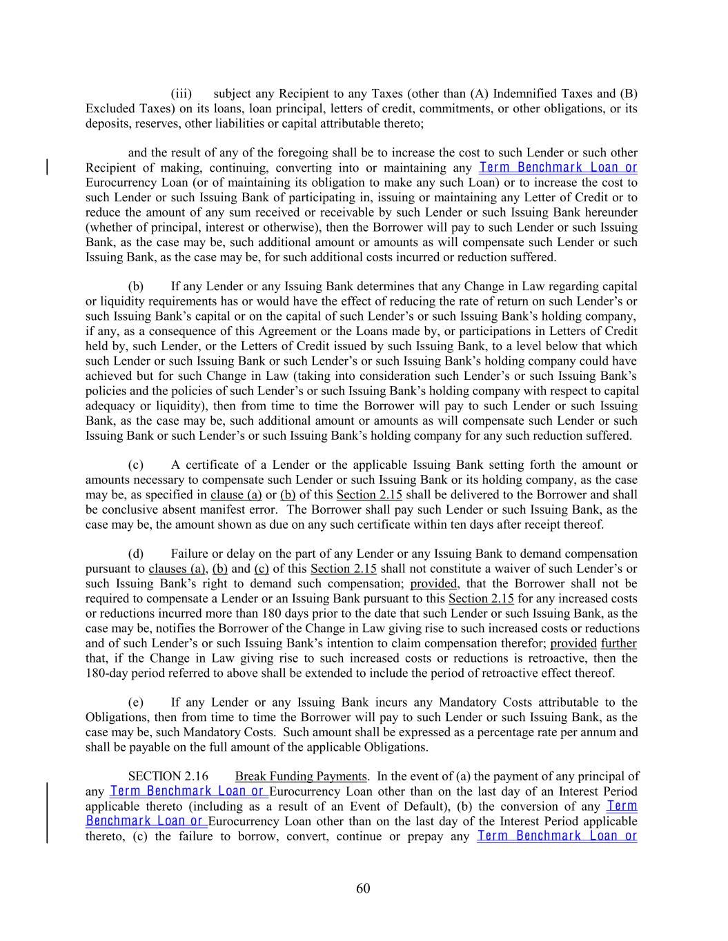 (iii) subject any Recipient to any Taxes (other than (A) Indemnified Taxes and (B) Excluded Taxes) on its loans, loan principal, letters of credit, commitments, or other obligations, or its deposits, reserves, other liabilities or capital attributable thereto; and the result of any of the foregoing shall be to increase the cost to such Lender or such other Recipient of making, continuing, converting into or maintaining any Term Benchmark Loan or Eurocurrency Loan (or of maintaining its obligation to make any such Loan) or to increase the cost to such Lender or such Issuing Bank of participating in, issuing or maintaining any Letter of Credit or to reduce the amount of any sum received or receivable by such Lender or such Issuing Bank hereunder (whether of principal, interest or otherwise), then the Borrower will pay to such Lender or such Issuing Bank, as the case may be, such additional amount or amounts as will compensate such Lender or such Issuing Bank, as the case may be, for such additional costs incurred or reduction suffered. (b) If any Lender or any Issuing Bank determines that any Change in Law regarding capital or liquidity requirements has or would have the effect of reducing the rate of return on such Lender’s or such Issuing Bank’s capital or on the capital of such Lender’s or such Issuing Bank’s holding company, if any, as a consequence of this Agreement or the Loans made by, or participations in Letters of Credit held by, such Lender, or the Letters of Credit issued by such Issuing Bank, to a level below that which such Lender or such Issuing Bank or such Lender’s or such Issuing Bank’s holding company could have achieved but for such Change in Law (taking into consideration such Lender’s or such Issuing Bank’s policies and the policies of such Lender’s or such Issuing Bank’s holding company with respect to capital adequacy or liquidity), then from time to time the Borrower will pay to such Lender or such Issuing Bank, as the case may be, such additional amount or amounts as will compensate such Lender or such Issuing Bank or such Lender’s or such Issuing Bank’s holding company for any such reduction suffered. (c) A certificate of a Lender or the applicable Issuing Bank setting forth the amount or amounts necessary to compensate such Lender or such Issuing Bank or its holding company, as the case may be, as specified in clause (a) or (b) of this Section 2.15 shall be delivered to the Borrower and shall be conclusive absent manifest error. The Borrower shall pay such Lender or such Issuing Bank, as the case may be, the amount shown as due on any such certificate within ten days after receipt thereof. (d) Failure or delay on the part of any Lender or any Issuing Bank to demand compensation pursuant to clauses (a), (b) and (c) of this Section 2.15 shall not constitute a waiver of such Lender’s or such Issuing Bank’s right to demand such compensation; provided, that the Borrower shall not be required to compensate a Lender or an Issuing Bank pursuant to this Section 2.15 for any increased costs or reductions incurred more than 180 days prior to the date that such Lender or such Issuing Bank, as the case may be, notifies the Borrower of the Change in Law giving rise to such increased costs or reductions and of such Lender’s or such Issuing Bank’s intention to claim compensation therefor; provided further that, if the Change in Law giving rise to such increased costs or reductions is retroactive, then the 180-day period referred to above shall be extended to include the period of retroactive effect thereof. (e) If any Lender or any Issuing Bank incurs any Mandatory Costs attributable to the Obligations, then from time to time the Borrower will pay to such Lender or such Issuing Bank, as the case may be, such Mandatory Costs. Such amount shall be expressed as a percentage rate per annum and shall be payable on the full amount of the applicable Obligations. SECTION 2.16 Break Funding Payments. In the event of (a) the payment of any principal of any Term Benchmark Loan or Eurocurrency Loan other than on the last day of an Interest Period applicable thereto (including as a result of an Event of Default), (b) the conversion of any Term Benchmark Loan or Eurocurrency Loan other than on the last day of the Interest Period applicable thereto, (c) the failure to borrow, convert, continue or prepay any Term Benchmark Loan or 60