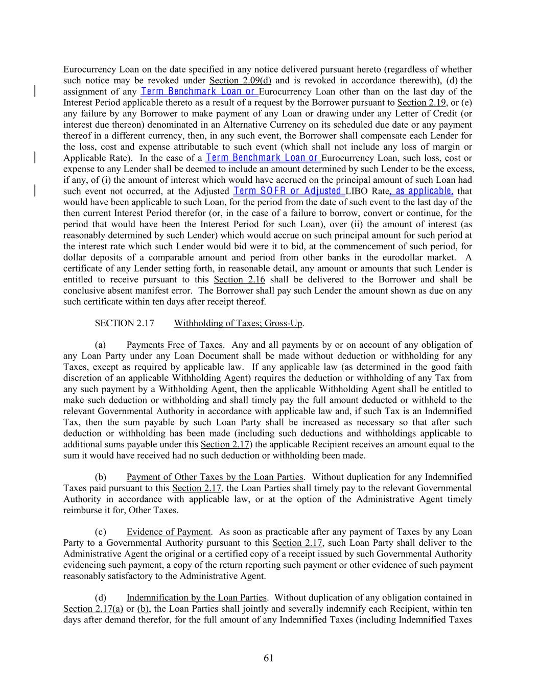 Eurocurrency Loan on the date specified in any notice delivered pursuant hereto (regardless of whether such notice may be revoked under Section 2.09(d) and is revoked in accordance therewith), (d) the assignment of any Term Benchmark Loan or Eurocurrency Loan other than on the last day of the Interest Period applicable thereto as a result of a request by the Borrower pursuant to Section 2.19, or (e) any failure by any Borrower to make payment of any Loan or drawing under any Letter of Credit (or interest due thereon) denominated in an Alternative Currency on its scheduled due date or any payment thereof in a different currency, then, in any such event, the Borrower shall compensate each Lender for the loss, cost and expense attributable to such event (which shall not include any loss of margin or Applicable Rate). In the case of a Term Benchmark Loan or Eurocurrency Loan, such loss, cost or expense to any Lender shall be deemed to include an amount determined by such Lender to be the excess, if any, of (i) the amount of interest which would have accrued on the principal amount of such Loan had such event not occurred, at the Adjusted Term SO F R or Adjusted LIBO Rate, as applicable, that would have been applicable to such Loan, for the period from the date of such event to the last day of the then current Interest Period therefor (or, in the case of a failure to borrow, convert or continue, for the period that would have been the Interest Period for such Loan), over (ii) the amount of interest (as reasonably determined by such Lender) which would accrue on such principal amount for such period at the interest rate which such Lender would bid were it to bid, at the commencement of such period, for dollar deposits of a comparable amount and period from other banks in the eurodollar market. A certificate of any Lender setting forth, in reasonable detail, any amount or amounts that such Lender is entitled to receive pursuant to this Section 2.16 shall be delivered to the Borrower and shall be conclusive absent manifest error. The Borrower shall pay such Lender the amount shown as due on any such certificate within ten days after receipt thereof. SECTION 2.17 Withholding of Taxes; Gross-Up. (a) Payments Free of Taxes. Any and all payments by or on account of any obligation of any Loan Party under any Loan Document shall be made without deduction or withholding for any Taxes, except as required by applicable law. If any applicable law (as determined in the good faith discretion of an applicable Withholding Agent) requires the deduction or withholding of any Tax from any such payment by a Withholding Agent, then the applicable Withholding Agent shall be entitled to make such deduction or withholding and shall timely pay the full amount deducted or withheld to the relevant Governmental Authority in accordance with applicable law and, if such Tax is an Indemnified Tax, then the sum payable by such Loan Party shall be increased as necessary so that after such deduction or withholding has been made (including such deductions and withholdings applicable to additional sums payable under this Section 2.17) the applicable Recipient receives an amount equal to the sum it would have received had no such deduction or withholding been made. (b) Payment of Other Taxes by the Loan Parties. Without duplication for any Indemnified Taxes paid pursuant to this Section 2.17, the Loan Parties shall timely pay to the relevant Governmental Authority in accordance with applicable law, or at the option of the Administrative Agent timely reimburse it for, Other Taxes. (c) Evidence of Payment. As soon as practicable after any payment of Taxes by any Loan Party to a Governmental Authority pursuant to this Section 2.17, such Loan Party shall deliver to the Administrative Agent the original or a certified copy of a receipt issued by such Governmental Authority evidencing such payment, a copy of the return reporting such payment or other evidence of such payment reasonably satisfactory to the Administrative Agent. (d) Indemnification by the Loan Parties. Without duplication of any obligation contained in Section 2.17(a) or (b), the Loan Parties shall jointly and severally indemnify each Recipient, within ten days after demand therefor, for the full amount of any Indemnified Taxes (including Indemnified Taxes 61