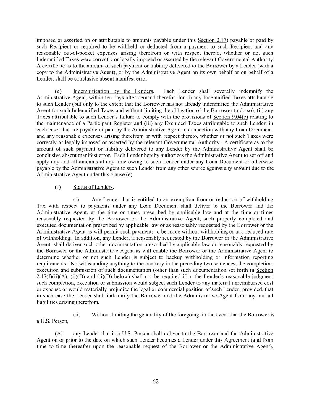 imposed or asserted on or attributable to amounts payable under this Section 2.17) payable or paid by such Recipient or required to be withheld or deducted from a payment to such Recipient and any reasonable out-of-pocket expenses arising therefrom or with respect thereto, whether or not such Indemnified Taxes were correctly or legally imposed or asserted by the relevant Governmental Authority. A certificate as to the amount of such payment or liability delivered to the Borrower by a Lender (with a copy to the Administrative Agent), or by the Administrative Agent on its own behalf or on behalf of a Lender, shall be conclusive absent manifest error. (e) Indemnification by the Lenders. Each Lender shall severally indemnify the Administrative Agent, within ten days after demand therefor, for (i) any Indemnified Taxes attributable to such Lender (but only to the extent that the Borrower has not already indemnified the Administrative Agent for such Indemnified Taxes and without limiting the obligation of the Borrower to do so), (ii) any Taxes attributable to such Lender’s failure to comply with the provisions of Section 9.04(c) relating to the maintenance of a Participant Register and (iii) any Excluded Taxes attributable to such Lender, in each case, that are payable or paid by the Administrative Agent in connection with any Loan Document, and any reasonable expenses arising therefrom or with respect thereto, whether or not such Taxes were correctly or legally imposed or asserted by the relevant Governmental Authority. A certificate as to the amount of such payment or liability delivered to any Lender by the Administrative Agent shall be conclusive absent manifest error. Each Lender hereby authorizes the Administrative Agent to set off and apply any and all amounts at any time owing to such Lender under any Loan Document or otherwise payable by the Administrative Agent to such Lender from any other source against any amount due to the Administrative Agent under this clause (e). (f) Status of Lenders. (i) Any Lender that is entitled to an exemption from or reduction of withholding Tax with respect to payments under any Loan Document shall deliver to the Borrower and the Administrative Agent, at the time or times prescribed by applicable law and at the time or times reasonably requested by the Borrower or the Administrative Agent, such properly completed and executed documentation prescribed by applicable law or as reasonably requested by the Borrower or the Administrative Agent as will permit such payments to be made without withholding or at a reduced rate of withholding. In addition, any Lender, if reasonably requested by the Borrower or the Administrative Agent, shall deliver such other documentation prescribed by applicable law or reasonably requested by the Borrower or the Administrative Agent as will enable the Borrower or the Administrative Agent to determine whether or not such Lender is subject to backup withholding or information reporting requirements. Notwithstanding anything to the contrary in the preceding two sentences, the completion, execution and submission of such documentation (other than such documentation set forth in Section 2.17(f)(ii)(A), (ii)(B) and (ii)(D) below) shall not be required if in the Lender’s reasonable judgment such completion, execution or submission would subject such Lender to any material unreimbursed cost or expense or would materially prejudice the legal or commercial position of such Lender; provided, that in such case the Lender shall indemnify the Borrower and the Administrative Agent from any and all liabilities arising therefrom. (ii) Without limiting the generality of the foregoing, in the event that the Borrower is a U.S. Person, (A) any Lender that is a U.S. Person shall deliver to the Borrower and the Administrative Agent on or prior to the date on which such Lender becomes a Lender under this Agreement (and from time to time thereafter upon the reasonable request of the Borrower or the Administrative Agent), 62