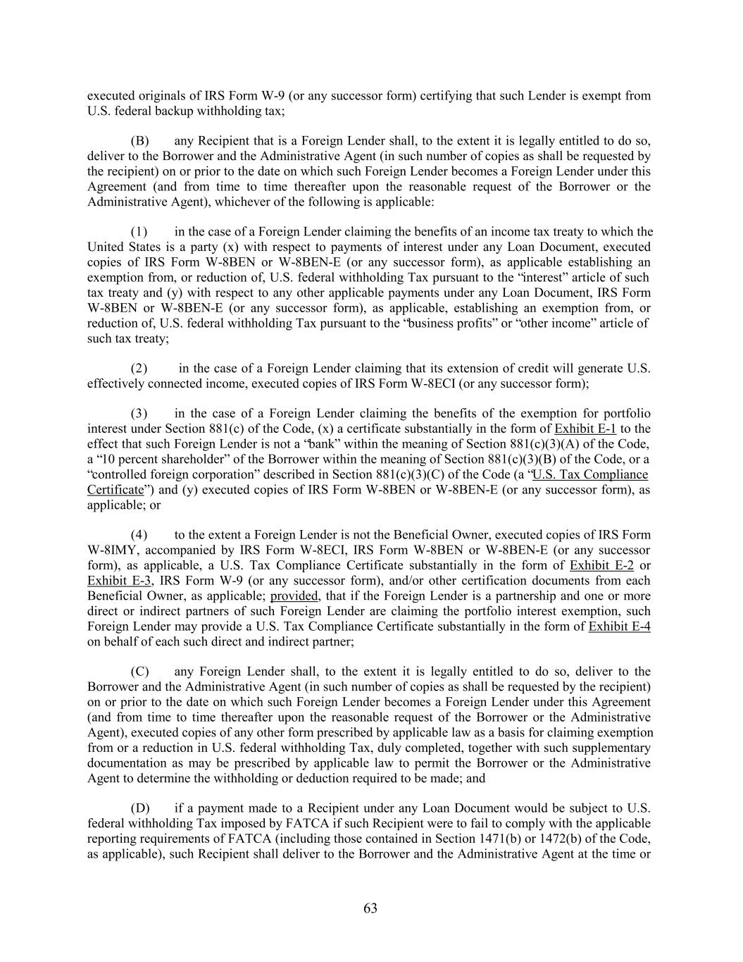 executed originals of IRS Form W-9 (or any successor form) certifying that such Lender is exempt from U.S. federal backup withholding tax; (B) any Recipient that is a Foreign Lender shall, to the extent it is legally entitled to do so, deliver to the Borrower and the Administrative Agent (in such number of copies as shall be requested by the recipient) on or prior to the date on which such Foreign Lender becomes a Foreign Lender under this Agreement (and from time to time thereafter upon the reasonable request of the Borrower or the Administrative Agent), whichever of the following is applicable: (1) in the case of a Foreign Lender claiming the benefits of an income tax treaty to which the United States is a party (x) with respect to payments of interest under any Loan Document, executed copies of IRS Form W-8BEN or W-8BEN-E (or any successor form), as applicable establishing an exemption from, or reduction of, U.S. federal withholding Tax pursuant to the “interest” article of such tax treaty and (y) with respect to any other applicable payments under any Loan Document, IRS Form W-8BEN or W-8BEN-E (or any successor form), as applicable, establishing an exemption from, or reduction of, U.S. federal withholding Tax pursuant to the “business profits” or “other income” article of such tax treaty; (2) in the case of a Foreign Lender claiming that its extension of credit will generate U.S. effectively connected income, executed copies of IRS Form W-8ECI (or any successor form); (3) in the case of a Foreign Lender claiming the benefits of the exemption for portfolio interest under Section 881(c) of the Code, (x) a certificate substantially in the form of Exhibit E-1 to the effect that such Foreign Lender is not a “bank” within the meaning of Section 881(c)(3)(A) of the Code, a “10 percent shareholder” of the Borrower within the meaning of Section 881(c)(3)(B) of the Code, or a “controlled foreign corporation” described in Section 881(c)(3)(C) of the Code (a “U.S. Tax Compliance Certificate”) and (y) executed copies of IRS Form W-8BEN or W-8BEN-E (or any successor form), as applicable; or (4) to the extent a Foreign Lender is not the Beneficial Owner, executed copies of IRS Form W-8IMY, accompanied by IRS Form W-8ECI, IRS Form W-8BEN or W-8BEN-E (or any successor form), as applicable, a U.S. Tax Compliance Certificate substantially in the form of Exhibit E-2 or Exhibit E-3, IRS Form W-9 (or any successor form), and/or other certification documents from each Beneficial Owner, as applicable; provided, that if the Foreign Lender is a partnership and one or more direct or indirect partners of such Foreign Lender are claiming the portfolio interest exemption, such Foreign Lender may provide a U.S. Tax Compliance Certificate substantially in the form of Exhibit E-4 on behalf of each such direct and indirect partner; (C) any Foreign Lender shall, to the extent it is legally entitled to do so, deliver to the Borrower and the Administrative Agent (in such number of copies as shall be requested by the recipient) on or prior to the date on which such Foreign Lender becomes a Foreign Lender under this Agreement (and from time to time thereafter upon the reasonable request of the Borrower or the Administrative Agent), executed copies of any other form prescribed by applicable law as a basis for claiming exemption from or a reduction in U.S. federal withholding Tax, duly completed, together with such supplementary documentation as may be prescribed by applicable law to permit the Borrower or the Administrative Agent to determine the withholding or deduction required to be made; and (D) if a payment made to a Recipient under any Loan Document would be subject to U.S. federal withholding Tax imposed by FATCA if such Recipient were to fail to comply with the applicable reporting requirements of FATCA (including those contained in Section 1471(b) or 1472(b) of the Code, as applicable), such Recipient shall deliver to the Borrower and the Administrative Agent at the time or 63
