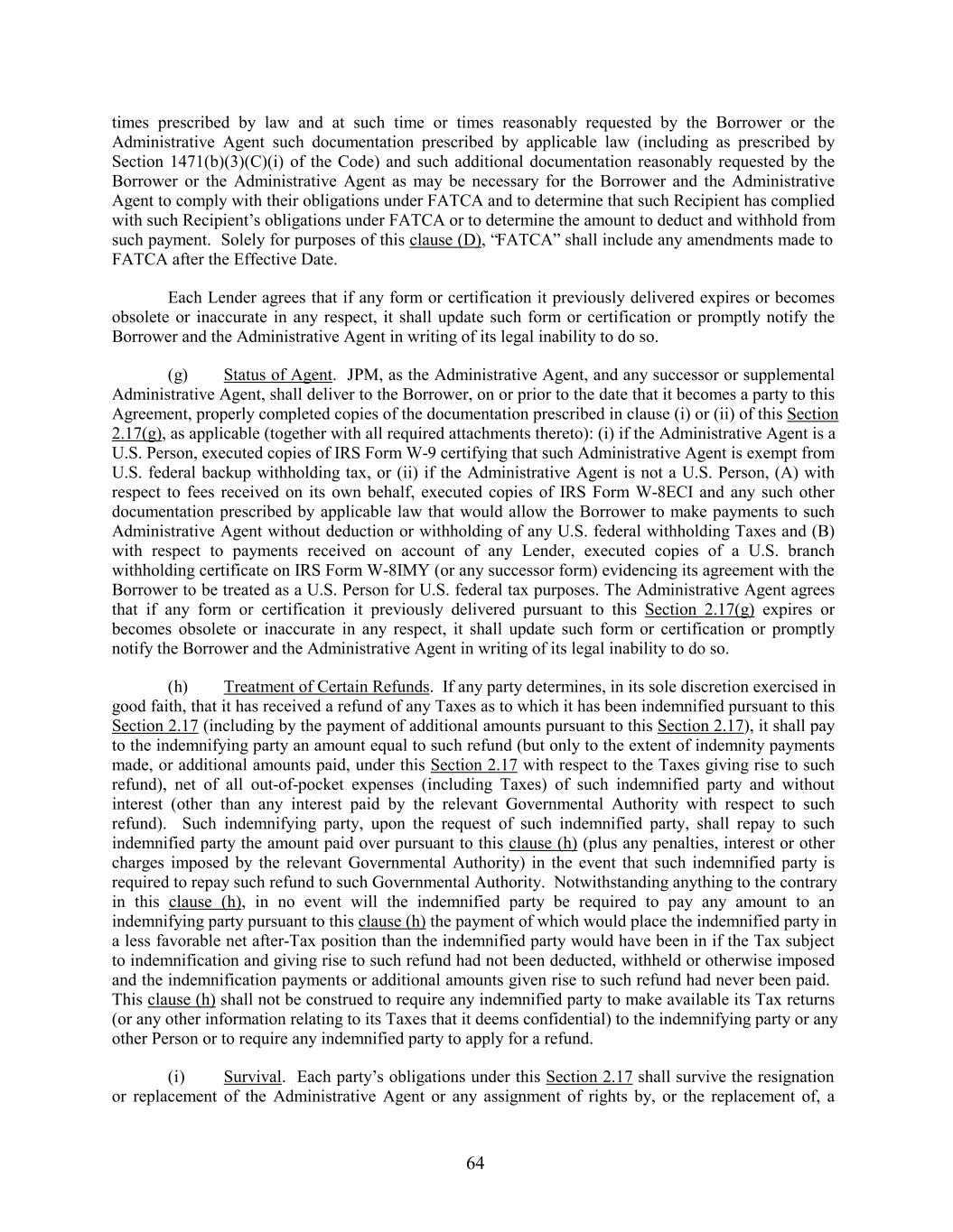 times prescribed by law and at such time or times reasonably requested by the Borrower or the Administrative Agent such documentation prescribed by applicable law (including as prescribed by Section 1471(b)(3)(C)(i) of the Code) and such additional documentation reasonably requested by the Borrower or the Administrative Agent as may be necessary for the Borrower and the Administrative Agent to comply with their obligations under FATCA and to determine that such Recipient has complied with such Recipient’s obligations under FATCA or to determine the amount to deduct and withhold from such payment. Solely for purposes of this clause (D), “FATCA” shall include any amendments made to FATCA after the Effective Date. Each Lender agrees that if any form or certification it previously delivered expires or becomes obsolete or inaccurate in any respect, it shall update such form or certification or promptly notify the Borrower and the Administrative Agent in writing of its legal inability to do so. (g) Status of Agent. JPM, as the Administrative Agent, and any successor or supplemental Administrative Agent, shall deliver to the Borrower, on or prior to the date that it becomes a party to this Agreement, properly completed copies of the documentation prescribed in clause (i) or (ii) of this Section 2.17(g), as applicable (together with all required attachments thereto): (i) if the Administrative Agent is a U.S. Person, executed copies of IRS Form W-9 certifying that such Administrative Agent is exempt from U.S. federal backup withholding tax, or (ii) if the Administrative Agent is not a U.S. Person, (A) with respect to fees received on its own behalf, executed copies of IRS Form W-8ECI and any such other documentation prescribed by applicable law that would allow the Borrower to make payments to such Administrative Agent without deduction or withholding of any U.S. federal withholding Taxes and (B) with respect to payments received on account of any Lender, executed copies of a U.S. branch withholding certificate on IRS Form W-8IMY (or any successor form) evidencing its agreement with the Borrower to be treated as a U.S. Person for U.S. federal tax purposes. The Administrative Agent agrees that if any form or certification it previously delivered pursuant to this Section 2.17(g) expires or becomes obsolete or inaccurate in any respect, it shall update such form or certification or promptly notify the Borrower and the Administrative Agent in writing of its legal inability to do so. (h) Treatment of Certain Refunds. If any party determines, in its sole discretion exercised in good faith, that it has received a refund of any Taxes as to which it has been indemnified pursuant to this Section 2.17 (including by the payment of additional amounts pursuant to this Section 2.17), it shall pay to the indemnifying party an amount equal to such refund (but only to the extent of indemnity payments made, or additional amounts paid, under this Section 2.17 with respect to the Taxes giving rise to such refund), net of all out-of-pocket expenses (including Taxes) of such indemnified party and without interest (other than any interest paid by the relevant Governmental Authority with respect to such refund). Such indemnifying party, upon the request of such indemnified party, shall repay to such indemnified party the amount paid over pursuant to this clause (h) (plus any penalties, interest or other charges imposed by the relevant Governmental Authority) in the event that such indemnified party is required to repay such refund to such Governmental Authority. Notwithstanding anything to the contrary in this clause (h), in no event will the indemnified party be required to pay any amount to an indemnifying party pursuant to this clause (h) the payment of which would place the indemnified party in a less favorable net after-Tax position than the indemnified party would have been in if the Tax subject to indemnification and giving rise to such refund had not been deducted, withheld or otherwise imposed and the indemnification payments or additional amounts given rise to such refund had never been paid. This clause (h) shall not be construed to require any indemnified party to make available its Tax returns (or any other information relating to its Taxes that it deems confidential) to the indemnifying party or any other Person or to require any indemnified party to apply for a refund. (i) Survival. Each party’s obligations under this Section 2.17 shall survive the resignation or replacement of the Administrative Agent or any assignment of rights by, or the replacement of, a 64