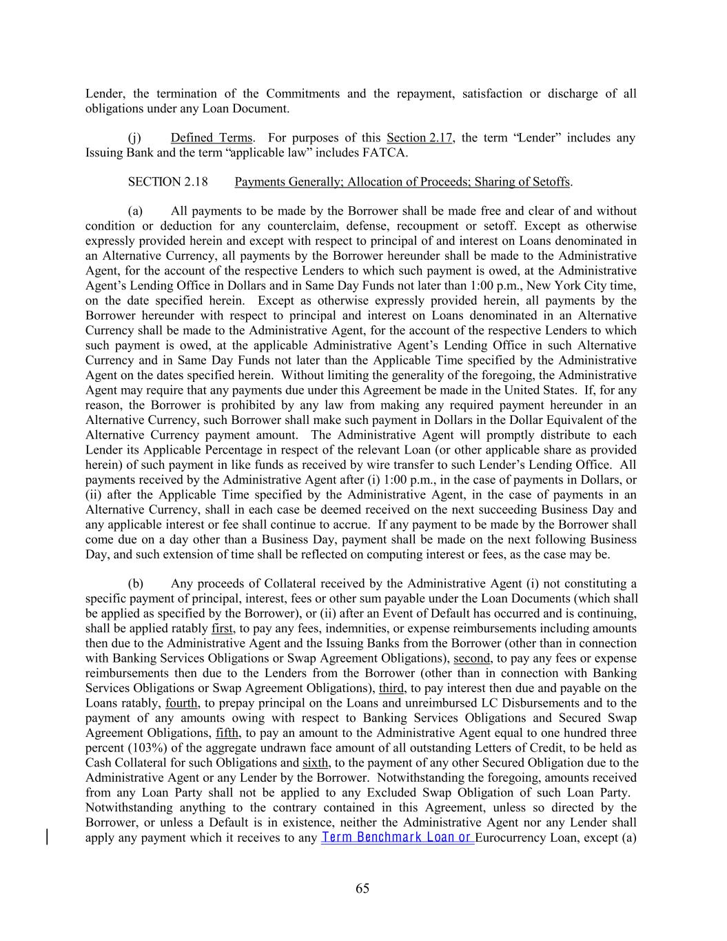 Lender, the termination of the Commitments and the repayment, satisfaction or discharge of all obligations under any Loan Document. (j) Defined Terms. For purposes of this Section 2.17, the term “Lender” includes any Issuing Bank and the term “applicable law” includes FATCA. SECTION 2.18 Payments Generally; Allocation of Proceeds; Sharing of Setoffs. (a) All payments to be made by the Borrower shall be made free and clear of and without condition or deduction for any counterclaim, defense, recoupment or setoff. Except as otherwise expressly provided herein and except with respect to principal of and interest on Loans denominated in an Alternative Currency, all payments by the Borrower hereunder shall be made to the Administrative Agent, for the account of the respective Lenders to which such payment is owed, at the Administrative Agent’s Lending Office in Dollars and in Same Day Funds not later than 1:00 p.m., New York City time, on the date specified herein. Except as otherwise expressly provided herein, all payments by the Borrower hereunder with respect to principal and interest on Loans denominated in an Alternative Currency shall be made to the Administrative Agent, for the account of the respective Lenders to which such payment is owed, at the applicable Administrative Agent’s Lending Office in such Alternative Currency and in Same Day Funds not later than the Applicable Time specified by the Administrative Agent on the dates specified herein. Without limiting the generality of the foregoing, the Administrative Agent may require that any payments due under this Agreement be made in the United States. If, for any reason, the Borrower is prohibited by any law from making any required payment hereunder in an Alternative Currency, such Borrower shall make such payment in Dollars in the Dollar Equivalent of the Alternative Currency payment amount. The Administrative Agent will promptly distribute to each Lender its Applicable Percentage in respect of the relevant Loan (or other applicable share as provided herein) of such payment in like funds as received by wire transfer to such Lender’s Lending Office. All payments received by the Administrative Agent after (i) 1:00 p.m., in the case of payments in Dollars, or (ii) after the Applicable Time specified by the Administrative Agent, in the case of payments in an Alternative Currency, shall in each case be deemed received on the next succeeding Business Day and any applicable interest or fee shall continue to accrue. If any payment to be made by the Borrower shall come due on a day other than a Business Day, payment shall be made on the next following Business Day, and such extension of time shall be reflected on computing interest or fees, as the case may be. (b) Any proceeds of Collateral received by the Administrative Agent (i) not constituting a specific payment of principal, interest, fees or other sum payable under the Loan Documents (which shall be applied as specified by the Borrower), or (ii) after an Event of Default has occurred and is continuing, shall be applied ratably first, to pay any fees, indemnities, or expense reimbursements including amounts then due to the Administrative Agent and the Issuing Banks from the Borrower (other than in connection with Banking Services Obligations or Swap Agreement Obligations), second, to pay any fees or expense reimbursements then due to the Lenders from the Borrower (other than in connection with Banking Services Obligations or Swap Agreement Obligations), third, to pay interest then due and payable on the Loans ratably, fourth, to prepay principal on the Loans and unreimbursed LC Disbursements and to the payment of any amounts owing with respect to Banking Services Obligations and Secured Swap Agreement Obligations, fifth, to pay an amount to the Administrative Agent equal to one hundred three percent (103%) of the aggregate undrawn face amount of all outstanding Letters of Credit, to be held as Cash Collateral for such Obligations and sixth, to the payment of any other Secured Obligation due to the Administrative Agent or any Lender by the Borrower. Notwithstanding the foregoing, amounts received from any Loan Party shall not be applied to any Excluded Swap Obligation of such Loan Party. Notwithstanding anything to the contrary contained in this Agreement, unless so directed by the Borrower, or unless a Default is in existence, neither the Administrative Agent nor any Lender shall apply any payment which it receives to any Term Benchmark Loan or Eurocurrency Loan, except (a) 65