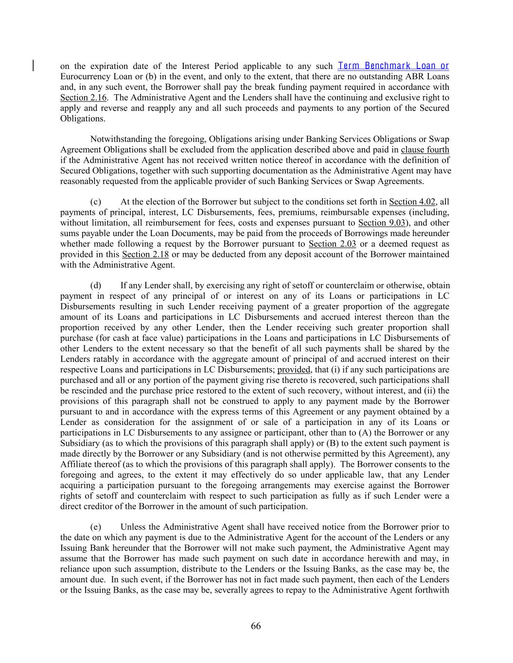 on the expiration date of the Interest Period applicable to any such Term Benchmark Loan or Eurocurrency Loan or (b) in the event, and only to the extent, that there are no outstanding ABR Loans and, in any such event, the Borrower shall pay the break funding payment required in accordance with Section 2.16. The Administrative Agent and the Lenders shall have the continuing and exclusive right to apply and reverse and reapply any and all such proceeds and payments to any portion of the Secured Obligations. Notwithstanding the foregoing, Obligations arising under Banking Services Obligations or Swap Agreement Obligations shall be excluded from the application described above and paid in clause fourth if the Administrative Agent has not received written notice thereof in accordance with the definition of Secured Obligations, together with such supporting documentation as the Administrative Agent may have reasonably requested from the applicable provider of such Banking Services or Swap Agreements. (c) At the election of the Borrower but subject to the conditions set forth in Section 4.02, all payments of principal, interest, LC Disbursements, fees, premiums, reimbursable expenses (including, without limitation, all reimbursement for fees, costs and expenses pursuant to Section 9.03), and other sums payable under the Loan Documents, may be paid from the proceeds of Borrowings made hereunder whether made following a request by the Borrower pursuant to Section 2.03 or a deemed request as provided in this Section 2.18 or may be deducted from any deposit account of the Borrower maintained with the Administrative Agent. (d) If any Lender shall, by exercising any right of setoff or counterclaim or otherwise, obtain payment in respect of any principal of or interest on any of its Loans or participations in LC Disbursements resulting in such Lender receiving payment of a greater proportion of the aggregate amount of its Loans and participations in LC Disbursements and accrued interest thereon than the proportion received by any other Lender, then the Lender receiving such greater proportion shall purchase (for cash at face value) participations in the Loans and participations in LC Disbursements of other Lenders to the extent necessary so that the benefit of all such payments shall be shared by the Lenders ratably in accordance with the aggregate amount of principal of and accrued interest on their respective Loans and participations in LC Disbursements; provided, that (i) if any such participations are purchased and all or any portion of the payment giving rise thereto is recovered, such participations shall be rescinded and the purchase price restored to the extent of such recovery, without interest, and (ii) the provisions of this paragraph shall not be construed to apply to any payment made by the Borrower pursuant to and in accordance with the express terms of this Agreement or any payment obtained by a Lender as consideration for the assignment of or sale of a participation in any of its Loans or participations in LC Disbursements to any assignee or participant, other than to (A) the Borrower or any Subsidiary (as to which the provisions of this paragraph shall apply) or (B) to the extent such payment is made directly by the Borrower or any Subsidiary (and is not otherwise permitted by this Agreement), any Affiliate thereof (as to which the provisions of this paragraph shall apply). The Borrower consents to the foregoing and agrees, to the extent it may effectively do so under applicable law, that any Lender acquiring a participation pursuant to the foregoing arrangements may exercise against the Borrower rights of setoff and counterclaim with respect to such participation as fully as if such Lender were a direct creditor of the Borrower in the amount of such participation. (e) Unless the Administrative Agent shall have received notice from the Borrower prior to the date on which any payment is due to the Administrative Agent for the account of the Lenders or any Issuing Bank hereunder that the Borrower will not make such payment, the Administrative Agent may assume that the Borrower has made such payment on such date in accordance herewith and may, in reliance upon such assumption, distribute to the Lenders or the Issuing Banks, as the case may be, the amount due. In such event, if the Borrower has not in fact made such payment, then each of the Lenders or the Issuing Banks, as the case may be, severally agrees to repay to the Administrative Agent forthwith 66