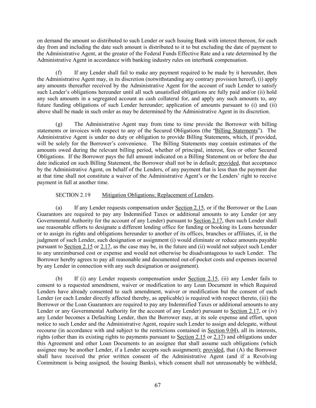 on demand the amount so distributed to such Lender or such Issuing Bank with interest thereon, for each day from and including the date such amount is distributed to it to but excluding the date of payment to the Administrative Agent, at the greater of the Federal Funds Effective Rate and a rate determined by the Administrative Agent in accordance with banking industry rules on interbank compensation. (f) If any Lender shall fail to make any payment required to be made by it hereunder, then the Administrative Agent may, in its discretion (notwithstanding any contrary provision hereof), (i) apply any amounts thereafter received by the Administrative Agent for the account of such Lender to satisfy such Lender’s obligations hereunder until all such unsatisfied obligations are fully paid and/or (ii) hold any such amounts in a segregated account as cash collateral for, and apply any such amounts to, any future funding obligations of such Lender hereunder; application of amounts pursuant to (i) and (ii) above shall be made in such order as may be determined by the Administrative Agent in its discretion. (g) The Administrative Agent may from time to time provide the Borrower with billing statements or invoices with respect to any of the Secured Obligations (the “Billing Statements”). The Administrative Agent is under no duty or obligation to provide Billing Statements, which, if provided, will be solely for the Borrower’s convenience. The Billing Statements may contain estimates of the amounts owed during the relevant billing period, whether of principal, interest, fees or other Secured Obligations. If the Borrower pays the full amount indicated on a Billing Statement on or before the due date indicated on such Billing Statement, the Borrower shall not be in default; provided, that acceptance by the Administrative Agent, on behalf of the Lenders, of any payment that is less than the payment due at that time shall not constitute a waiver of the Administrative Agent’s or the Lenders’ right to receive payment in full at another time. SECTION 2.19 Mitigation Obligations; Replacement of Lenders. (a) If any Lender requests compensation under Section 2.15, or if the Borrower or the Loan Guarantors are required to pay any Indemnified Taxes or additional amounts to any Lender (or any Governmental Authority for the account of any Lender) pursuant to Section 2.17, then such Lender shall use reasonable efforts to designate a different lending office for funding or booking its Loans hereunder or to assign its rights and obligations hereunder to another of its offices, branches or affiliates, if, in the judgment of such Lender, such designation or assignment (i) would eliminate or reduce amounts payable pursuant to Section 2.15 or 2.17, as the case may be, in the future and (ii) would not subject such Lender to any unreimbursed cost or expense and would not otherwise be disadvantageous to such Lender. The Borrower hereby agrees to pay all reasonable and documented out-of-pocket costs and expenses incurred by any Lender in connection with any such designation or assignment). (b) If (i) any Lender requests compensation under Section 2.15, (ii) any Lender fails to consent to a requested amendment, waiver or modification to any Loan Document in which Required Lenders have already consented to such amendment, waiver or modification but the consent of each Lender (or each Lender directly affected thereby, as applicable) is required with respect thereto, (iii) the Borrower or the Loan Guarantors are required to pay any Indemnified Taxes or additional amounts to any Lender or any Governmental Authority for the account of any Lender) pursuant to Section 2.17, or (iv) any Lender becomes a Defaulting Lender, then the Borrower may, at its sole expense and effort, upon notice to such Lender and the Administrative Agent, require such Lender to assign and delegate, without recourse (in accordance with and subject to the restrictions contained in Section 9.04), all its interests, rights (other than its existing rights to payments pursuant to Section 2.15 or 2.17) and obligations under this Agreement and other Loan Documents to an assignee that shall assume such obligations (which assignee may be another Lender, if a Lender accepts such assignment); provided, that (A) the Borrower shall have received the prior written consent of the Administrative Agent (and if a Revolving Commitment is being assigned, the Issuing Banks), which consent shall not unreasonably be withheld, 67