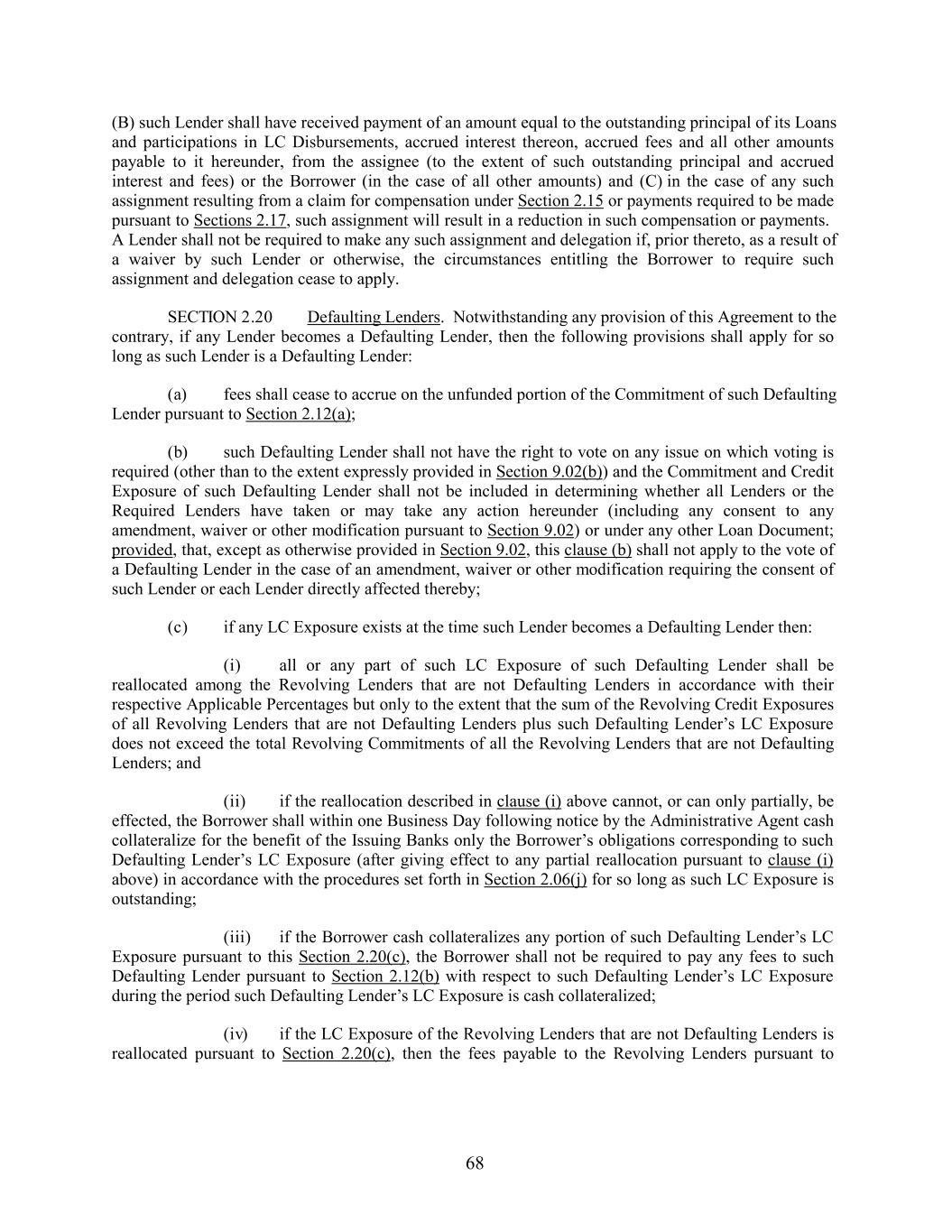 (B) such Lender shall have received payment of an amount equal to the outstanding principal of its Loans and participations in LC Disbursements, accrued interest thereon, accrued fees and all other amounts payable to it hereunder, from the assignee (to the extent of such outstanding principal and accrued interest and fees) or the Borrower (in the case of all other amounts) and (C) in the case of any such assignment resulting from a claim for compensation under Section 2.15 or payments required to be made pursuant to Sections 2.17, such assignment will result in a reduction in such compensation or payments. A Lender shall not be required to make any such assignment and delegation if, prior thereto, as a result of a waiver by such Lender or otherwise, the circumstances entitling the Borrower to require such assignment and delegation cease to apply. SECTION 2.20 Defaulting Lenders. Notwithstanding any provision of this Agreement to the contrary, if any Lender becomes a Defaulting Lender, then the following provisions shall apply for so long as such Lender is a Defaulting Lender: (a) fees shall cease to accrue on the unfunded portion of the Commitment of such Defaulting Lender pursuant to Section 2.12(a); (b) such Defaulting Lender shall not have the right to vote on any issue on which voting is required (other than to the extent expressly provided in Section 9.02(b)) and the Commitment and Credit Exposure of such Defaulting Lender shall not be included in determining whether all Lenders or the Required Lenders have taken or may take any action hereunder (including any consent to any amendment, waiver or other modification pursuant to Section 9.02) or under any other Loan Document; provided, that, except as otherwise provided in Section 9.02, this clause (b) shall not apply to the vote of a Defaulting Lender in the case of an amendment, waiver or other modification requiring the consent of such Lender or each Lender directly affected thereby; (c) if any LC Exposure exists at the time such Lender becomes a Defaulting Lender then: (i) all or any part of such LC Exposure of such Defaulting Lender shall be reallocated among the Revolving Lenders that are not Defaulting Lenders in accordance with their respective Applicable Percentages but only to the extent that the sum of the Revolving Credit Exposures of all Revolving Lenders that are not Defaulting Lenders plus such Defaulting Lender’s LC Exposure does not exceed the total Revolving Commitments of all the Revolving Lenders that are not Defaulting Lenders; and (ii) if the reallocation described in clause (i) above cannot, or can only partially, be effected, the Borrower shall within one Business Day following notice by the Administrative Agent cash collateralize for the benefit of the Issuing Banks only the Borrower’s obligations corresponding to such Defaulting Lender’s LC Exposure (after giving effect to any partial reallocation pursuant to clause (i) above) in accordance with the procedures set forth in Section 2.06(j) for so long as such LC Exposure is outstanding; (iii) if the Borrower cash collateralizes any portion of such Defaulting Lender’s LC Exposure pursuant to this Section 2.20(c), the Borrower shall not be required to pay any fees to such Defaulting Lender pursuant to Section 2.12(b) with respect to such Defaulting Lender’s LC Exposure during the period such Defaulting Lender’s LC Exposure is cash collateralized; (iv) if the LC Exposure of the Revolving Lenders that are not Defaulting Lenders is reallocated pursuant to Section 2.20(c), then the fees payable to the Revolving Lenders pursuant to 68