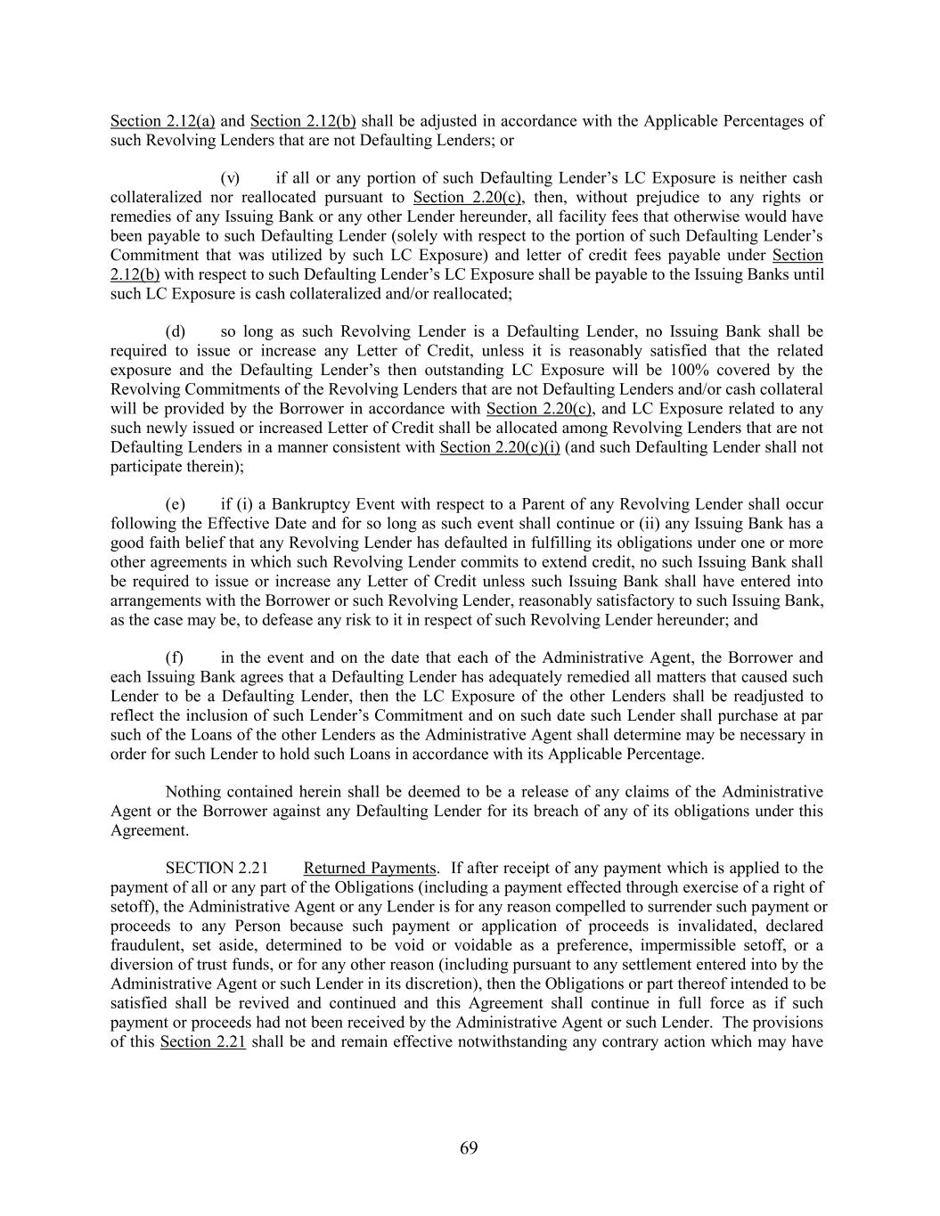 Section 2.12(a) and Section 2.12(b) shall be adjusted in accordance with the Applicable Percentages of such Revolving Lenders that are not Defaulting Lenders; or (v) if all or any portion of such Defaulting Lender’s LC Exposure is neither cash collateralized nor reallocated pursuant to Section 2.20(c), then, without prejudice to any rights or remedies of any Issuing Bank or any other Lender hereunder, all facility fees that otherwise would have been payable to such Defaulting Lender (solely with respect to the portion of such Defaulting Lender’s Commitment that was utilized by such LC Exposure) and letter of credit fees payable under Section 2.12(b) with respect to such Defaulting Lender’s LC Exposure shall be payable to the Issuing Banks until such LC Exposure is cash collateralized and/or reallocated; (d) so long as such Revolving Lender is a Defaulting Lender, no Issuing Bank shall be required to issue or increase any Letter of Credit, unless it is reasonably satisfied that the related exposure and the Defaulting Lender’s then outstanding LC Exposure will be 100% covered by the Revolving Commitments of the Revolving Lenders that are not Defaulting Lenders and/or cash collateral will be provided by the Borrower in accordance with Section 2.20(c), and LC Exposure related to any such newly issued or increased Letter of Credit shall be allocated among Revolving Lenders that are not Defaulting Lenders in a manner consistent with Section 2.20(c)(i) (and such Defaulting Lender shall not participate therein); (e) if (i) a Bankruptcy Event with respect to a Parent of any Revolving Lender shall occur following the Effective Date and for so long as such event shall continue or (ii) any Issuing Bank has a good faith belief that any Revolving Lender has defaulted in fulfilling its obligations under one or more other agreements in which such Revolving Lender commits to extend credit, no such Issuing Bank shall be required to issue or increase any Letter of Credit unless such Issuing Bank shall have entered into arrangements with the Borrower or such Revolving Lender, reasonably satisfactory to such Issuing Bank, as the case may be, to defease any risk to it in respect of such Revolving Lender hereunder; and (f) in the event and on the date that each of the Administrative Agent, the Borrower and each Issuing Bank agrees that a Defaulting Lender has adequately remedied all matters that caused such Lender to be a Defaulting Lender, then the LC Exposure of the other Lenders shall be readjusted to reflect the inclusion of such Lender’s Commitment and on such date such Lender shall purchase at par such of the Loans of the other Lenders as the Administrative Agent shall determine may be necessary in order for such Lender to hold such Loans in accordance with its Applicable Percentage. Nothing contained herein shall be deemed to be a release of any claims of the Administrative Agent or the Borrower against any Defaulting Lender for its breach of any of its obligations under this Agreement. SECTION 2.21 Returned Payments. If after receipt of any payment which is applied to the payment of all or any part of the Obligations (including a payment effected through exercise of a right of setoff), the Administrative Agent or any Lender is for any reason compelled to surrender such payment or proceeds to any Person because such payment or application of proceeds is invalidated, declared fraudulent, set aside, determined to be void or voidable as a preference, impermissible setoff, or a diversion of trust funds, or for any other reason (including pursuant to any settlement entered into by the Administrative Agent or such Lender in its discretion), then the Obligations or part thereof intended to be satisfied shall be revived and continued and this Agreement shall continue in full force as if such payment or proceeds had not been received by the Administrative Agent or such Lender. The provisions of this Section 2.21 shall be and remain effective notwithstanding any contrary action which may have 69