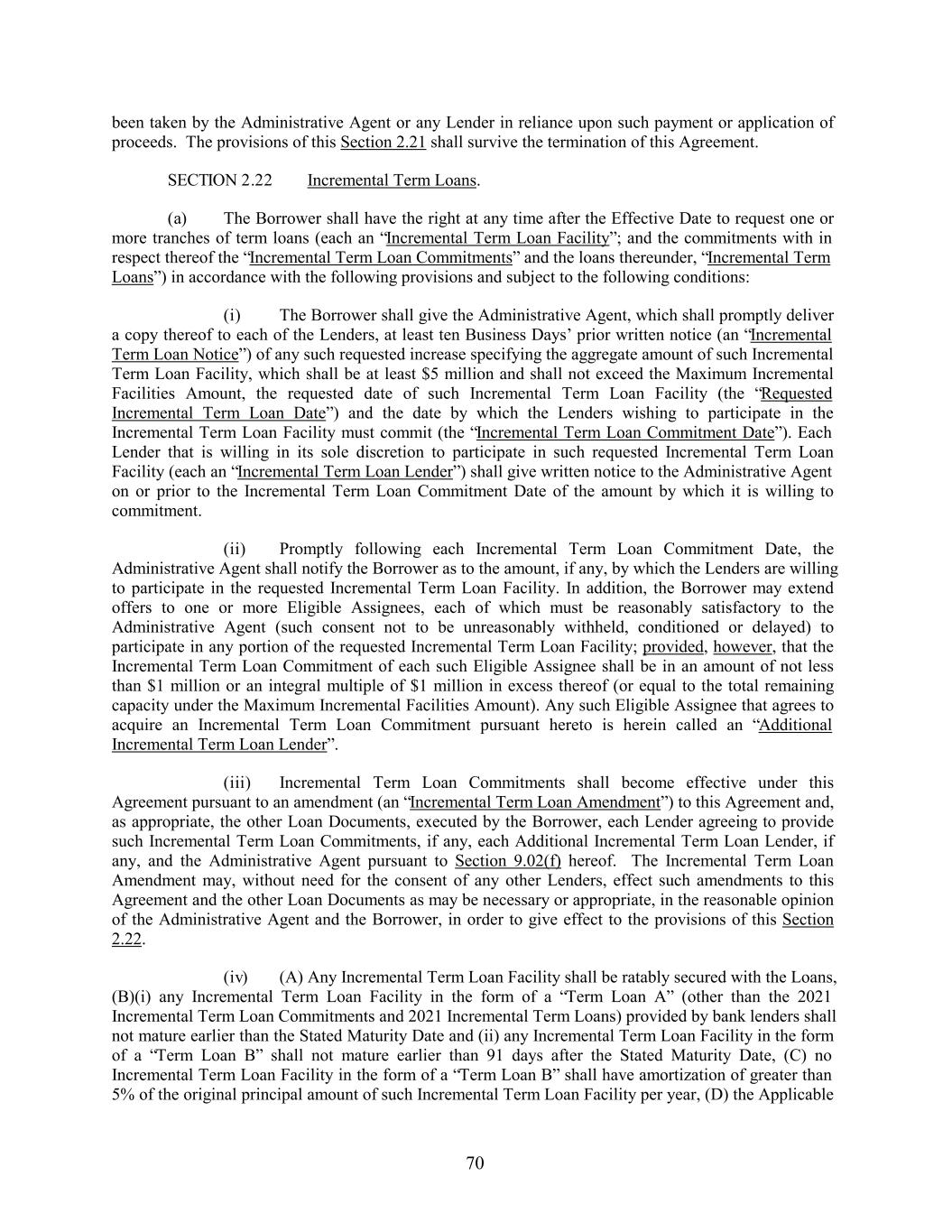 been taken by the Administrative Agent or any Lender in reliance upon such payment or application of proceeds. The provisions of this Section 2.21 shall survive the termination of this Agreement. SECTION 2.22 Incremental Term Loans. (a) The Borrower shall have the right at any time after the Effective Date to request one or more tranches of term loans (each an “Incremental Term Loan Facility”; and the commitments with in respect thereof the “Incremental Term Loan Commitments” and the loans thereunder, “Incremental Term Loans”) in accordance with the following provisions and subject to the following conditions: (i) The Borrower shall give the Administrative Agent, which shall promptly deliver a copy thereof to each of the Lenders, at least ten Business Days’ prior written notice (an “Incremental Term Loan Notice”) of any such requested increase specifying the aggregate amount of such Incremental Term Loan Facility, which shall be at least $5 million and shall not exceed the Maximum Incremental Facilities Amount, the requested date of such Incremental Term Loan Facility (the “Requested Incremental Term Loan Date”) and the date by which the Lenders wishing to participate in the Incremental Term Loan Facility must commit (the “Incremental Term Loan Commitment Date”). Each Lender that is willing in its sole discretion to participate in such requested Incremental Term Loan Facility (each an “Incremental Term Loan Lender”) shall give written notice to the Administrative Agent on or prior to the Incremental Term Loan Commitment Date of the amount by which it is willing to commitment. (ii) Promptly following each Incremental Term Loan Commitment Date, the Administrative Agent shall notify the Borrower as to the amount, if any, by which the Lenders are willing to participate in the requested Incremental Term Loan Facility. In addition, the Borrower may extend offers to one or more Eligible Assignees, each of which must be reasonably satisfactory to the Administrative Agent (such consent not to be unreasonably withheld, conditioned or delayed) to participate in any portion of the requested Incremental Term Loan Facility; provided, however, that the Incremental Term Loan Commitment of each such Eligible Assignee shall be in an amount of not less than $1 million or an integral multiple of $1 million in excess thereof (or equal to the total remaining capacity under the Maximum Incremental Facilities Amount). Any such Eligible Assignee that agrees to acquire an Incremental Term Loan Commitment pursuant hereto is herein called an “Additional Incremental Term Loan Lender”. (iii) Incremental Term Loan Commitments shall become effective under this Agreement pursuant to an amendment (an “Incremental Term Loan Amendment”) to this Agreement and, as appropriate, the other Loan Documents, executed by the Borrower, each Lender agreeing to provide such Incremental Term Loan Commitments, if any, each Additional Incremental Term Loan Lender, if any, and the Administrative Agent pursuant to Section 9.02(f) hereof. The Incremental Term Loan Amendment may, without need for the consent of any other Lenders, effect such amendments to this Agreement and the other Loan Documents as may be necessary or appropriate, in the reasonable opinion of the Administrative Agent and the Borrower, in order to give effect to the provisions of this Section 2.22. (iv) (A) Any Incremental Term Loan Facility shall be ratably secured with the Loans, (B)(i) any Incremental Term Loan Facility in the form of a “Term Loan A” (other than the 2021 Incremental Term Loan Commitments and 2021 Incremental Term Loans) provided by bank lenders shall not mature earlier than the Stated Maturity Date and (ii) any Incremental Term Loan Facility in the form of a “Term Loan B” shall not mature earlier than 91 days after the Stated Maturity Date, (C) no Incremental Term Loan Facility in the form of a “Term Loan B” shall have amortization of greater than 5% of the original principal amount of such Incremental Term Loan Facility per year, (D) the Applicable 70