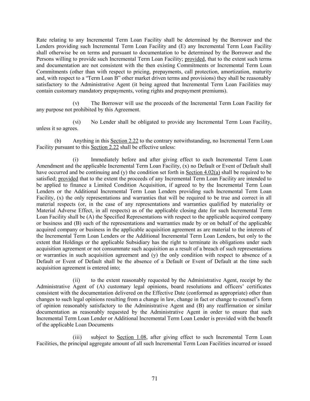 Rate relating to any Incremental Term Loan Facility shall be determined by the Borrower and the Lenders providing such Incremental Term Loan Facility and (E) any Incremental Term Loan Facility shall otherwise be on terms and pursuant to documentation to be determined by the Borrower and the Persons willing to provide such Incremental Term Loan Facility; provided, that to the extent such terms and documentation are not consistent with the then existing Commitments or Incremental Term Loan Commitments (other than with respect to pricing, prepayments, call protection, amortization, maturity and, with respect to a “Term Loan B” other market driven terms and provisions) they shall be reasonably satisfactory to the Administrative Agent (it being agreed that Incremental Term Loan Facilities may contain customary mandatory prepayments, voting rights and prepayment premiums). (v) The Borrower will use the proceeds of the Incremental Term Loan Facility for any purpose not prohibited by this Agreement. (vi) No Lender shall be obligated to provide any Incremental Term Loan Facility, unless it so agrees. (b) Anything in this Section 2.22 to the contrary notwithstanding, no Incremental Term Loan Facility pursuant to this Section 2.22 shall be effective unless: (i) Immediately before and after giving effect to each Incremental Term Loan Amendment and the applicable Incremental Term Loan Facility, (x) no Default or Event of Default shall have occurred and be continuing and (y) the condition set forth in Section 4.02(a) shall be required to be satisfied; provided that to the extent the proceeds of any Incremental Term Loan Facility are intended to be applied to finance a Limited Condition Acquisition, if agreed to by the Incremental Term Loan Lenders or the Additional Incremental Term Loan Lenders providing such Incremental Term Loan Facility, (x) the only representations and warranties that will be required to be true and correct in all material respects (or, in the case of any representations and warranties qualified by materiality or Material Adverse Effect, in all respects) as of the applicable closing date for such Incremental Term Loan Facility shall be (A) the Specified Representations with respect to the applicable acquired company or business and (B) such of the representations and warranties made by or on behalf of the applicable acquired company or business in the applicable acquisition agreement as are material to the interests of the Incremental Term Loan Lenders or the Additional Incremental Term Loan Lenders, but only to the extent that Holdings or the applicable Subsidiary has the right to terminate its obligations under such acquisition agreement or not consummate such acquisition as a result of a breach of such representations or warranties in such acquisition agreement and (y) the only condition with respect to absence of a Default or Event of Default shall be the absence of a Default or Event of Default at the time such acquisition agreement is entered into; (ii) to the extent reasonably requested by the Administrative Agent, receipt by the Administrative Agent of (A) customary legal opinions, board resolutions and officers’ certificates consistent with the documentation delivered on the Effective Date (conformed as appropriate) other than changes to such legal opinions resulting from a change in law, change in fact or change to counsel’s form of opinion reasonably satisfactory to the Administrative Agent and (B) any reaffirmation or similar documentation as reasonably requested by the Administrative Agent in order to ensure that such Incremental Term Loan Lender or Additional Incremental Term Loan Lender is provided with the benefit of the applicable Loan Documents (iii) subject to Section 1.08, after giving effect to such Incremental Term Loan Facilities, the principal aggregate amount of all such Incremental Term Loan Facilities incurred or issued 71