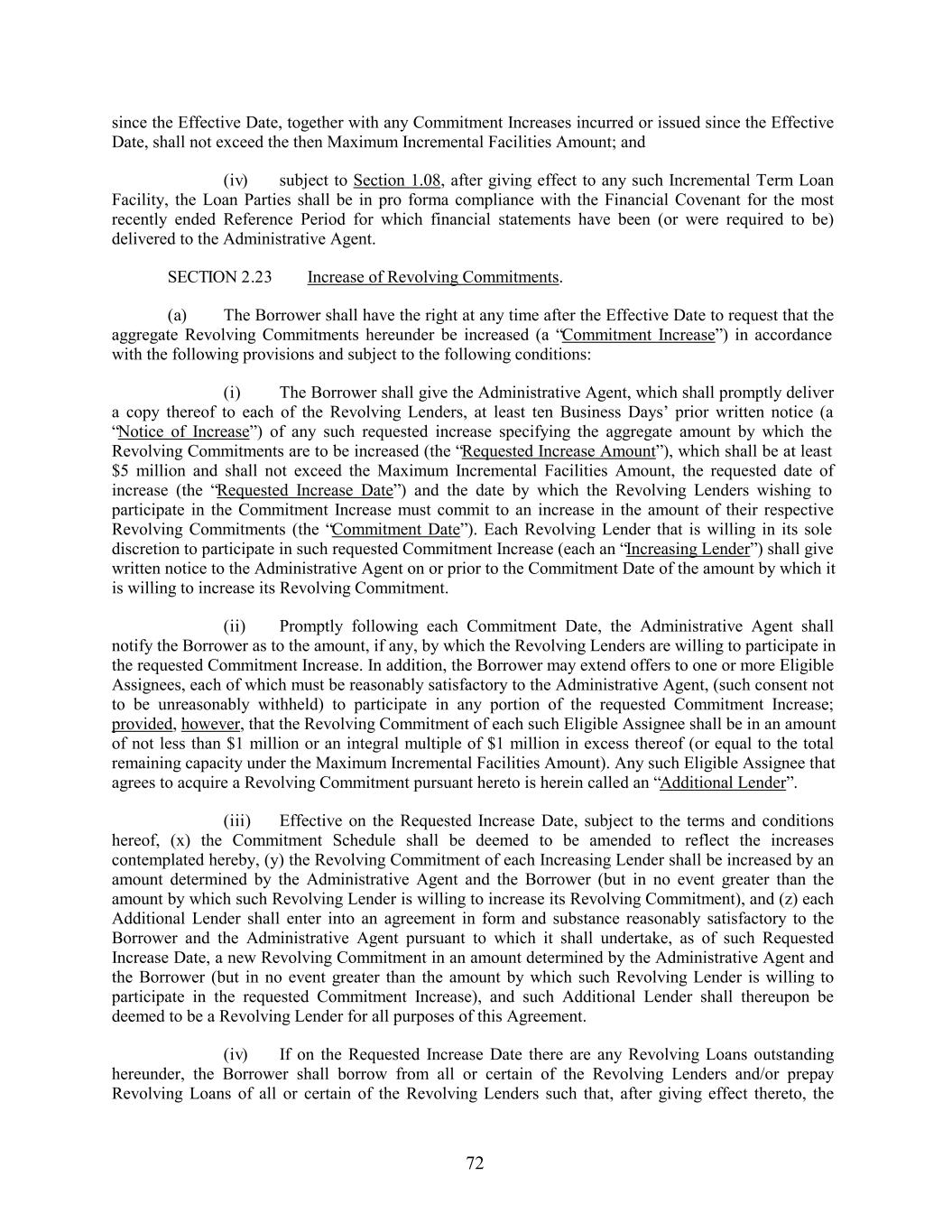 since the Effective Date, together with any Commitment Increases incurred or issued since the Effective Date, shall not exceed the then Maximum Incremental Facilities Amount; and (iv) subject to Section 1.08, after giving effect to any such Incremental Term Loan Facility, the Loan Parties shall be in pro forma compliance with the Financial Covenant for the most recently ended Reference Period for which financial statements have been (or were required to be) delivered to the Administrative Agent. SECTION 2.23 Increase of Revolving Commitments. (a) The Borrower shall have the right at any time after the Effective Date to request that the aggregate Revolving Commitments hereunder be increased (a “Commitment Increase”) in accordance with the following provisions and subject to the following conditions: (i) The Borrower shall give the Administrative Agent, which shall promptly deliver a copy thereof to each of the Revolving Lenders, at least ten Business Days’ prior written notice (a “Notice of Increase”) of any such requested increase specifying the aggregate amount by which the Revolving Commitments are to be increased (the “Requested Increase Amount”), which shall be at least $5 million and shall not exceed the Maximum Incremental Facilities Amount, the requested date of increase (the “Requested Increase Date”) and the date by which the Revolving Lenders wishing to participate in the Commitment Increase must commit to an increase in the amount of their respective Revolving Commitments (the “Commitment Date”). Each Revolving Lender that is willing in its sole discretion to participate in such requested Commitment Increase (each an “Increasing Lender”) shall give written notice to the Administrative Agent on or prior to the Commitment Date of the amount by which it is willing to increase its Revolving Commitment. (ii) Promptly following each Commitment Date, the Administrative Agent shall notify the Borrower as to the amount, if any, by which the Revolving Lenders are willing to participate in the requested Commitment Increase. In addition, the Borrower may extend offers to one or more Eligible Assignees, each of which must be reasonably satisfactory to the Administrative Agent, (such consent not to be unreasonably withheld) to participate in any portion of the requested Commitment Increase; provided, however, that the Revolving Commitment of each such Eligible Assignee shall be in an amount of not less than $1 million or an integral multiple of $1 million in excess thereof (or equal to the total remaining capacity under the Maximum Incremental Facilities Amount). Any such Eligible Assignee that agrees to acquire a Revolving Commitment pursuant hereto is herein called an “Additional Lender”. (iii) Effective on the Requested Increase Date, subject to the terms and conditions hereof, (x) the Commitment Schedule shall be deemed to be amended to reflect the increases contemplated hereby, (y) the Revolving Commitment of each Increasing Lender shall be increased by an amount determined by the Administrative Agent and the Borrower (but in no event greater than the amount by which such Revolving Lender is willing to increase its Revolving Commitment), and (z) each Additional Lender shall enter into an agreement in form and substance reasonably satisfactory to the Borrower and the Administrative Agent pursuant to which it shall undertake, as of such Requested Increase Date, a new Revolving Commitment in an amount determined by the Administrative Agent and the Borrower (but in no event greater than the amount by which such Revolving Lender is willing to participate in the requested Commitment Increase), and such Additional Lender shall thereupon be deemed to be a Revolving Lender for all purposes of this Agreement. (iv) If on the Requested Increase Date there are any Revolving Loans outstanding hereunder, the Borrower shall borrow from all or certain of the Revolving Lenders and/or prepay Revolving Loans of all or certain of the Revolving Lenders such that, after giving effect thereto, the 72
