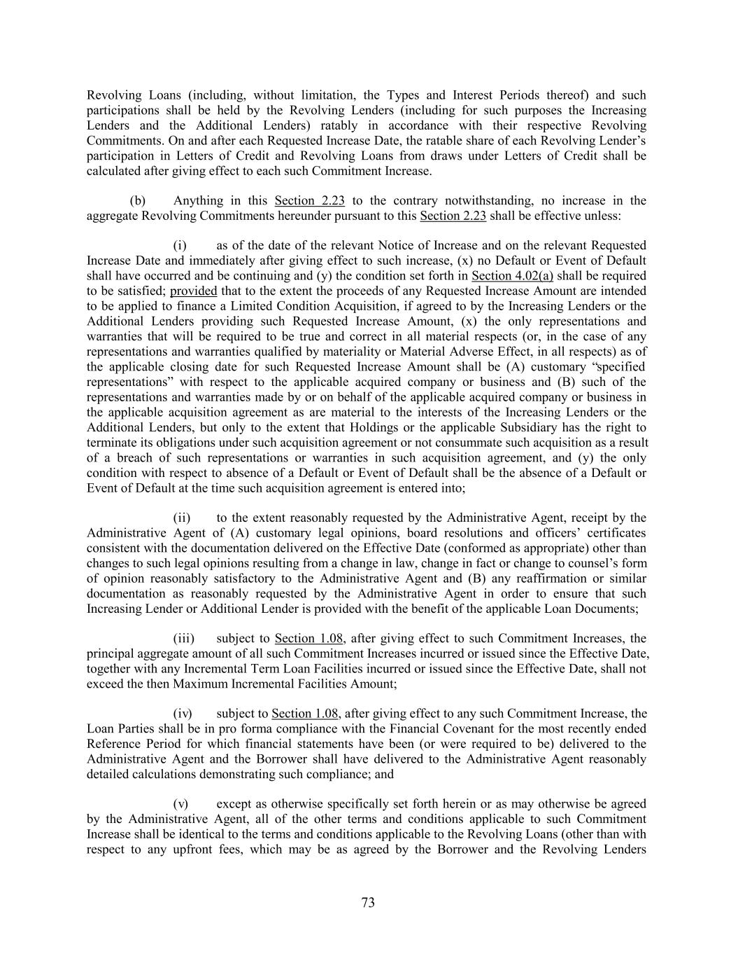 Revolving Loans (including, without limitation, the Types and Interest Periods thereof) and such participations shall be held by the Revolving Lenders (including for such purposes the Increasing Lenders and the Additional Lenders) ratably in accordance with their respective Revolving Commitments. On and after each Requested Increase Date, the ratable share of each Revolving Lender’s participation in Letters of Credit and Revolving Loans from draws under Letters of Credit shall be calculated after giving effect to each such Commitment Increase. (b) Anything in this Section 2.23 to the contrary notwithstanding, no increase in the aggregate Revolving Commitments hereunder pursuant to this Section 2.23 shall be effective unless: (i) as of the date of the relevant Notice of Increase and on the relevant Requested Increase Date and immediately after giving effect to such increase, (x) no Default or Event of Default shall have occurred and be continuing and (y) the condition set forth in Section 4.02(a) shall be required to be satisfied; provided that to the extent the proceeds of any Requested Increase Amount are intended to be applied to finance a Limited Condition Acquisition, if agreed to by the Increasing Lenders or the Additional Lenders providing such Requested Increase Amount, (x) the only representations and warranties that will be required to be true and correct in all material respects (or, in the case of any representations and warranties qualified by materiality or Material Adverse Effect, in all respects) as of the applicable closing date for such Requested Increase Amount shall be (A) customary “specified representations” with respect to the applicable acquired company or business and (B) such of the representations and warranties made by or on behalf of the applicable acquired company or business in the applicable acquisition agreement as are material to the interests of the Increasing Lenders or the Additional Lenders, but only to the extent that Holdings or the applicable Subsidiary has the right to terminate its obligations under such acquisition agreement or not consummate such acquisition as a result of a breach of such representations or warranties in such acquisition agreement, and (y) the only condition with respect to absence of a Default or Event of Default shall be the absence of a Default or Event of Default at the time such acquisition agreement is entered into; (ii) to the extent reasonably requested by the Administrative Agent, receipt by the Administrative Agent of (A) customary legal opinions, board resolutions and officers’ certificates consistent with the documentation delivered on the Effective Date (conformed as appropriate) other than changes to such legal opinions resulting from a change in law, change in fact or change to counsel’s form of opinion reasonably satisfactory to the Administrative Agent and (B) any reaffirmation or similar documentation as reasonably requested by the Administrative Agent in order to ensure that such Increasing Lender or Additional Lender is provided with the benefit of the applicable Loan Documents; (iii) subject to Section 1.08, after giving effect to such Commitment Increases, the principal aggregate amount of all such Commitment Increases incurred or issued since the Effective Date, together with any Incremental Term Loan Facilities incurred or issued since the Effective Date, shall not exceed the then Maximum Incremental Facilities Amount; (iv) subject to Section 1.08, after giving effect to any such Commitment Increase, the Loan Parties shall be in pro forma compliance with the Financial Covenant for the most recently ended Reference Period for which financial statements have been (or were required to be) delivered to the Administrative Agent and the Borrower shall have delivered to the Administrative Agent reasonably detailed calculations demonstrating such compliance; and (v) except as otherwise specifically set forth herein or as may otherwise be agreed by the Administrative Agent, all of the other terms and conditions applicable to such Commitment Increase shall be identical to the terms and conditions applicable to the Revolving Loans (other than with respect to any upfront fees, which may be as agreed by the Borrower and the Revolving Lenders 73