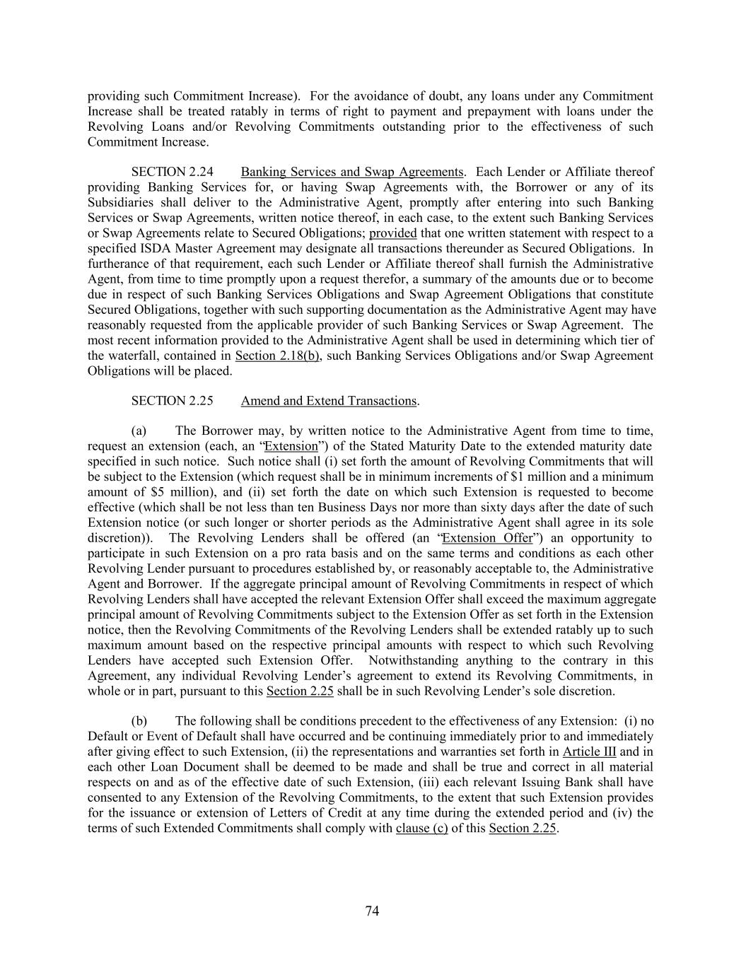 providing such Commitment Increase). For the avoidance of doubt, any loans under any Commitment Increase shall be treated ratably in terms of right to payment and prepayment with loans under the Revolving Loans and/or Revolving Commitments outstanding prior to the effectiveness of such Commitment Increase. SECTION 2.24 Banking Services and Swap Agreements. Each Lender or Affiliate thereof providing Banking Services for, or having Swap Agreements with, the Borrower or any of its Subsidiaries shall deliver to the Administrative Agent, promptly after entering into such Banking Services or Swap Agreements, written notice thereof, in each case, to the extent such Banking Services or Swap Agreements relate to Secured Obligations; provided that one written statement with respect to a specified ISDA Master Agreement may designate all transactions thereunder as Secured Obligations. In furtherance of that requirement, each such Lender or Affiliate thereof shall furnish the Administrative Agent, from time to time promptly upon a request therefor, a summary of the amounts due or to become due in respect of such Banking Services Obligations and Swap Agreement Obligations that constitute Secured Obligations, together with such supporting documentation as the Administrative Agent may have reasonably requested from the applicable provider of such Banking Services or Swap Agreement. The most recent information provided to the Administrative Agent shall be used in determining which tier of the waterfall, contained in Section 2.18(b), such Banking Services Obligations and/or Swap Agreement Obligations will be placed. SECTION 2.25 Amend and Extend Transactions. (a) The Borrower may, by written notice to the Administrative Agent from time to time, request an extension (each, an “Extension”) of the Stated Maturity Date to the extended maturity date specified in such notice. Such notice shall (i) set forth the amount of Revolving Commitments that will be subject to the Extension (which request shall be in minimum increments of $1 million and a minimum amount of $5 million), and (ii) set forth the date on which such Extension is requested to become effective (which shall be not less than ten Business Days nor more than sixty days after the date of such Extension notice (or such longer or shorter periods as the Administrative Agent shall agree in its sole discretion)). The Revolving Lenders shall be offered (an “Extension Offer”) an opportunity to participate in such Extension on a pro rata basis and on the same terms and conditions as each other Revolving Lender pursuant to procedures established by, or reasonably acceptable to, the Administrative Agent and Borrower. If the aggregate principal amount of Revolving Commitments in respect of which Revolving Lenders shall have accepted the relevant Extension Offer shall exceed the maximum aggregate principal amount of Revolving Commitments subject to the Extension Offer as set forth in the Extension notice, then the Revolving Commitments of the Revolving Lenders shall be extended ratably up to such maximum amount based on the respective principal amounts with respect to which such Revolving Lenders have accepted such Extension Offer. Notwithstanding anything to the contrary in this Agreement, any individual Revolving Lender’s agreement to extend its Revolving Commitments, in whole or in part, pursuant to this Section 2.25 shall be in such Revolving Lender’s sole discretion. (b) The following shall be conditions precedent to the effectiveness of any Extension: (i) no Default or Event of Default shall have occurred and be continuing immediately prior to and immediately after giving effect to such Extension, (ii) the representations and warranties set forth in Article III and in each other Loan Document shall be deemed to be made and shall be true and correct in all material respects on and as of the effective date of such Extension, (iii) each relevant Issuing Bank shall have consented to any Extension of the Revolving Commitments, to the extent that such Extension provides for the issuance or extension of Letters of Credit at any time during the extended period and (iv) the terms of such Extended Commitments shall comply with clause (c) of this Section 2.25. 74