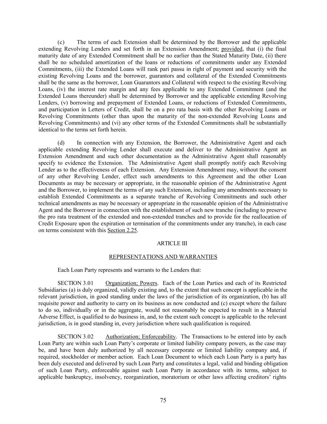 (c) The terms of each Extension shall be determined by the Borrower and the applicable extending Revolving Lenders and set forth in an Extension Amendment; provided, that (i) the final maturity date of any Extended Commitment shall be no earlier than the Stated Maturity Date, (ii) there shall be no scheduled amortization of the loans or reductions of commitments under any Extended Commitments, (iii) the Extended Loans will rank pari passu in right of payment and security with the existing Revolving Loans and the borrower, guarantors and collateral of the Extended Commitments shall be the same as the borrower, Loan Guarantors and Collateral with respect to the existing Revolving Loans, (iv) the interest rate margin and any fees applicable to any Extended Commitment (and the Extended Loans thereunder) shall be determined by Borrower and the applicable extending Revolving Lenders, (v) borrowing and prepayment of Extended Loans, or reductions of Extended Commitments, and participation in Letters of Credit, shall be on a pro rata basis with the other Revolving Loans or Revolving Commitments (other than upon the maturity of the non-extended Revolving Loans and Revolving Commitments) and (vi) any other terms of the Extended Commitments shall be substantially identical to the terms set forth herein. (d) In connection with any Extension, the Borrower, the Administrative Agent and each applicable extending Revolving Lender shall execute and deliver to the Administrative Agent an Extension Amendment and such other documentation as the Administrative Agent shall reasonably specify to evidence the Extension. The Administrative Agent shall promptly notify each Revolving Lender as to the effectiveness of each Extension. Any Extension Amendment may, without the consent of any other Revolving Lender, effect such amendments to this Agreement and the other Loan Documents as may be necessary or appropriate, in the reasonable opinion of the Administrative Agent and the Borrower, to implement the terms of any such Extension, including any amendments necessary to establish Extended Commitments as a separate tranche of Revolving Commitments and such other technical amendments as may be necessary or appropriate in the reasonable opinion of the Administrative Agent and the Borrower in connection with the establishment of such new tranche (including to preserve the pro rata treatment of the extended and non-extended tranches and to provide for the reallocation of Credit Exposure upon the expiration or termination of the commitments under any tranche), in each case on terms consistent with this Section 2.25. ARTICLE III REPRESENTATIONS AND WARRANTIES Each Loan Party represents and warrants to the Lenders that: SECTION 3.01 Organization; Powers. Each of the Loan Parties and each of its Restricted Subsidiaries (a) is duly organized, validly existing and, to the extent that such concept is applicable in the relevant jurisdiction, in good standing under the laws of the jurisdiction of its organization, (b) has all requisite power and authority to carry on its business as now conducted and (c) except where the failure to do so, individually or in the aggregate, would not reasonably be expected to result in a Material Adverse Effect, is qualified to do business in, and, to the extent such concept is applicable to the relevant jurisdiction, is in good standing in, every jurisdiction where such qualification is required. SECTION 3.02 Authorization; Enforceability. The Transactions to be entered into by each Loan Party are within such Loan Party’s corporate or limited liability company powers, as the case may be, and have been duly authorized by all necessary corporate or limited liability company and, if required, stockholder or member action. Each Loan Document to which each Loan Party is a party has been duly executed and delivered by such Loan Party and constitutes a legal, valid and binding obligation of such Loan Party, enforceable against such Loan Party in accordance with its terms, subject to applicable bankruptcy, insolvency, reorganization, moratorium or other laws affecting creditors’ rights 75