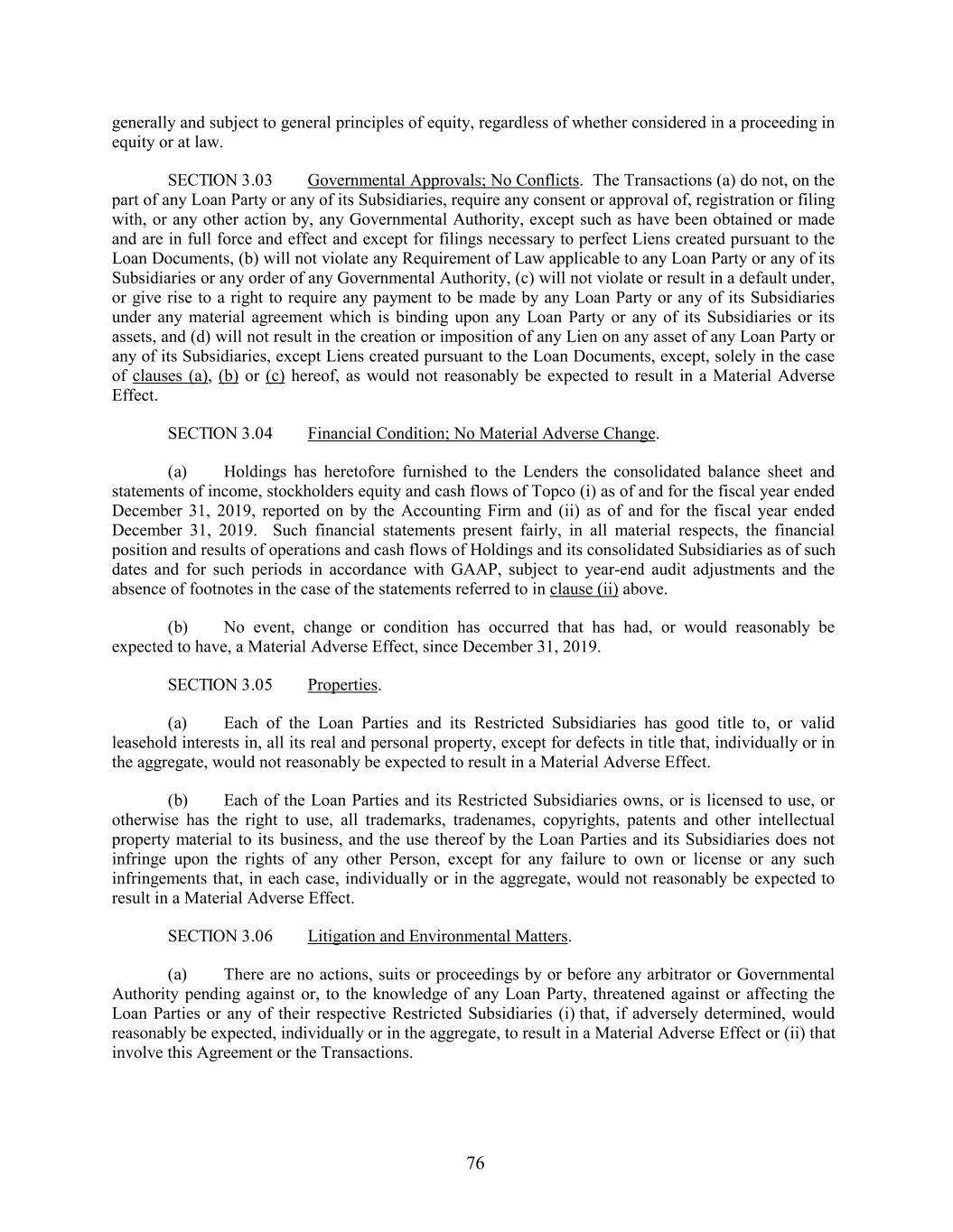 generally and subject to general principles of equity, regardless of whether considered in a proceeding in equity or at law. SECTION 3.03 Governmental Approvals; No Conflicts. The Transactions (a) do not, on the part of any Loan Party or any of its Subsidiaries, require any consent or approval of, registration or filing with, or any other action by, any Governmental Authority, except such as have been obtained or made and are in full force and effect and except for filings necessary to perfect Liens created pursuant to the Loan Documents, (b) will not violate any Requirement of Law applicable to any Loan Party or any of its Subsidiaries or any order of any Governmental Authority, (c) will not violate or result in a default under, or give rise to a right to require any payment to be made by any Loan Party or any of its Subsidiaries under any material agreement which is binding upon any Loan Party or any of its Subsidiaries or its assets, and (d) will not result in the creation or imposition of any Lien on any asset of any Loan Party or any of its Subsidiaries, except Liens created pursuant to the Loan Documents, except, solely in the case of clauses (a), (b) or (c) hereof, as would not reasonably be expected to result in a Material Adverse Effect. SECTION 3.04 Financial Condition; No Material Adverse Change. (a) Holdings has heretofore furnished to the Lenders the consolidated balance sheet and statements of income, stockholders equity and cash flows of Topco (i) as of and for the fiscal year ended December 31, 2019, reported on by the Accounting Firm and (ii) as of and for the fiscal year ended December 31, 2019. Such financial statements present fairly, in all material respects, the financial position and results of operations and cash flows of Holdings and its consolidated Subsidiaries as of such dates and for such periods in accordance with GAAP, subject to year-end audit adjustments and the absence of footnotes in the case of the statements referred to in clause (ii) above. (b) No event, change or condition has occurred that has had, or would reasonably be expected to have, a Material Adverse Effect, since December 31, 2019. SECTION 3.05 Properties. (a) Each of the Loan Parties and its Restricted Subsidiaries has good title to, or valid leasehold interests in, all its real and personal property, except for defects in title that, individually or in the aggregate, would not reasonably be expected to result in a Material Adverse Effect. (b) Each of the Loan Parties and its Restricted Subsidiaries owns, or is licensed to use, or otherwise has the right to use, all trademarks, tradenames, copyrights, patents and other intellectual property material to its business, and the use thereof by the Loan Parties and its Subsidiaries does not infringe upon the rights of any other Person, except for any failure to own or license or any such infringements that, in each case, individually or in the aggregate, would not reasonably be expected to result in a Material Adverse Effect. SECTION 3.06 Litigation and Environmental Matters. (a) There are no actions, suits or proceedings by or before any arbitrator or Governmental Authority pending against or, to the knowledge of any Loan Party, threatened against or affecting the Loan Parties or any of their respective Restricted Subsidiaries (i) that, if adversely determined, would reasonably be expected, individually or in the aggregate, to result in a Material Adverse Effect or (ii) that involve this Agreement or the Transactions. 76