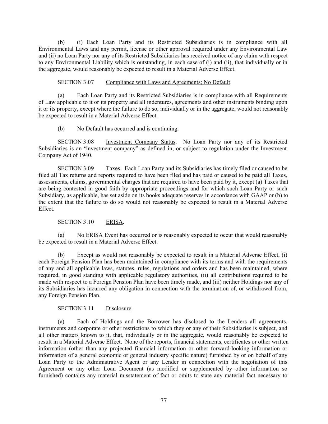 (b) (i) Each Loan Party and its Restricted Subsidiaries is in compliance with all Environmental Laws and any permit, license or other approval required under any Environmental Law and (ii) no Loan Party nor any of its Restricted Subsidiaries has received notice of any claim with respect to any Environmental Liability which is outstanding, in each case of (i) and (ii), that individually or in the aggregate, would reasonably be expected to result in a Material Adverse Effect. SECTION 3.07 Compliance with Laws and Agreements; No Default. (a) Each Loan Party and its Restricted Subsidiaries is in compliance with all Requirements of Law applicable to it or its property and all indentures, agreements and other instruments binding upon it or its property, except where the failure to do so, individually or in the aggregate, would not reasonably be expected to result in a Material Adverse Effect. (b) No Default has occurred and is continuing. SECTION 3.08 Investment Company Status. No Loan Party nor any of its Restricted Subsidiaries is an “investment company” as defined in, or subject to regulation under the Investment Company Act of 1940. SECTION 3.09 Taxes. Each Loan Party and its Subsidiaries has timely filed or caused to be filed all Tax returns and reports required to have been filed and has paid or caused to be paid all Taxes, assessments, claims, governmental charges that are required to have been paid by it, except (a) Taxes that are being contested in good faith by appropriate proceedings and for which such Loan Party or such Subsidiary, as applicable, has set aside on its books adequate reserves in accordance with GAAP or (b) to the extent that the failure to do so would not reasonably be expected to result in a Material Adverse Effect. SECTION 3.10 ERISA. (a) No ERISA Event has occurred or is reasonably expected to occur that would reasonably be expected to result in a Material Adverse Effect. (b) Except as would not reasonably be expected to result in a Material Adverse Effect, (i) each Foreign Pension Plan has been maintained in compliance with its terms and with the requirements of any and all applicable laws, statutes, rules, regulations and orders and has been maintained, where required, in good standing with applicable regulatory authorities, (ii) all contributions required to be made with respect to a Foreign Pension Plan have been timely made, and (iii) neither Holdings nor any of its Subsidiaries has incurred any obligation in connection with the termination of, or withdrawal from, any Foreign Pension Plan. SECTION 3.11 Disclosure. (a) Each of Holdings and the Borrower has disclosed to the Lenders all agreements, instruments and corporate or other restrictions to which they or any of their Subsidiaries is subject, and all other matters known to it, that, individually or in the aggregate, would reasonably be expected to result in a Material Adverse Effect. None of the reports, financial statements, certificates or other written information (other than any projected financial information or other forward-looking information or information of a general economic or general industry specific nature) furnished by or on behalf of any Loan Party to the Administrative Agent or any Lender in connection with the negotiation of this Agreement or any other Loan Document (as modified or supplemented by other information so furnished) contains any material misstatement of fact or omits to state any material fact necessary to 77