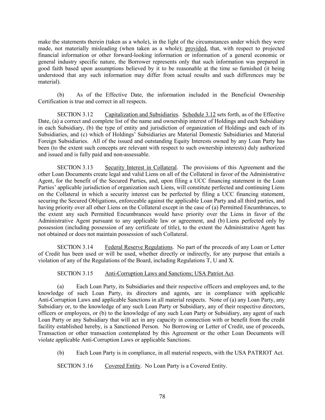 make the statements therein (taken as a whole), in the light of the circumstances under which they were made, not materially misleading (when taken as a whole); provided, that, with respect to projected financial information or other forward-looking information or information of a general economic or general industry specific nature, the Borrower represents only that such information was prepared in good faith based upon assumptions believed by it to be reasonable at the time so furnished (it being understood that any such information may differ from actual results and such differences may be material). (b) As of the Effective Date, the information included in the Beneficial Ownership Certification is true and correct in all respects. SECTION 3.12 Capitalization and Subsidiaries. Schedule 3.12 sets forth, as of the Effective Date, (a) a correct and complete list of the name and ownership interest of Holdings and each Subsidiary in each Subsidiary, (b) the type of entity and jurisdiction of organization of Holdings and each of its Subsidiaries, and (c) which of Holdings’ Subsidiaries are Material Domestic Subsidiaries and Material Foreign Subsidiaries. All of the issued and outstanding Equity Interests owned by any Loan Party has been (to the extent such concepts are relevant with respect to such ownership interests) duly authorized and issued and is fully paid and non-assessable. SECTION 3.13 Security Interest in Collateral. The provisions of this Agreement and the other Loan Documents create legal and valid Liens on all of the Collateral in favor of the Administrative Agent, for the benefit of the Secured Parties, and, upon filing a UCC financing statement in the Loan Parties’ applicable jurisdiction of organization such Liens, will constitute perfected and continuing Liens on the Collateral in which a security interest can be perfected by filing a UCC financing statement, securing the Secured Obligations, enforceable against the applicable Loan Party and all third parties, and having priority over all other Liens on the Collateral except in the case of (a) Permitted Encumbrances, to the extent any such Permitted Encumbrances would have priority over the Liens in favor of the Administrative Agent pursuant to any applicable law or agreement, and (b) Liens perfected only by possession (including possession of any certificate of title), to the extent the Administrative Agent has not obtained or does not maintain possession of such Collateral. SECTION 3.14 Federal Reserve Regulations. No part of the proceeds of any Loan or Letter of Credit has been used or will be used, whether directly or indirectly, for any purpose that entails a violation of any of the Regulations of the Board, including Regulations T, U and X. SECTION 3.15 Anti-Corruption Laws and Sanctions; USA Patriot Act. (a) Each Loan Party, its Subsidiaries and their respective officers and employees and, to the knowledge of such Loan Party, its directors and agents, are in compliance with applicable Anti-Corruption Laws and applicable Sanctions in all material respects. None of (a) any Loan Party, any Subsidiary or, to the knowledge of any such Loan Party or Subsidiary, any of their respective directors, officers or employees, or (b) to the knowledge of any such Loan Party or Subsidiary, any agent of such Loan Party or any Subsidiary that will act in any capacity in connection with or benefit from the credit facility established hereby, is a Sanctioned Person. No Borrowing or Letter of Credit, use of proceeds, Transaction or other transaction contemplated by this Agreement or the other Loan Documents will violate applicable Anti-Corruption Laws or applicable Sanctions. (b) Each Loan Party is in compliance, in all material respects, with the USA PATRIOT Act. SECTION 3.16 Covered Entity. No Loan Party is a Covered Entity. 78