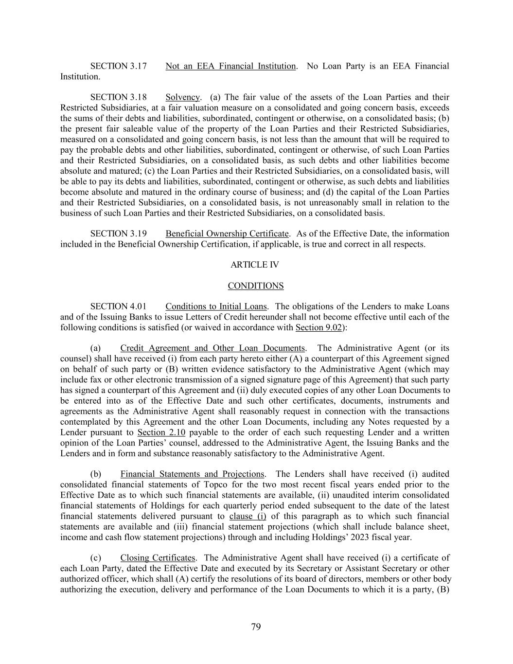 SECTION 3.17 Not an EEA Financial Institution. No Loan Party is an EEA Financial Institution. SECTION 3.18 Solvency. (a) The fair value of the assets of the Loan Parties and their Restricted Subsidiaries, at a fair valuation measure on a consolidated and going concern basis, exceeds the sums of their debts and liabilities, subordinated, contingent or otherwise, on a consolidated basis; (b) the present fair saleable value of the property of the Loan Parties and their Restricted Subsidiaries, measured on a consolidated and going concern basis, is not less than the amount that will be required to pay the probable debts and other liabilities, subordinated, contingent or otherwise, of such Loan Parties and their Restricted Subsidiaries, on a consolidated basis, as such debts and other liabilities become absolute and matured; (c) the Loan Parties and their Restricted Subsidiaries, on a consolidated basis, will be able to pay its debts and liabilities, subordinated, contingent or otherwise, as such debts and liabilities become absolute and matured in the ordinary course of business; and (d) the capital of the Loan Parties and their Restricted Subsidiaries, on a consolidated basis, is not unreasonably small in relation to the business of such Loan Parties and their Restricted Subsidiaries, on a consolidated basis. SECTION 3.19 Beneficial Ownership Certificate. As of the Effective Date, the information included in the Beneficial Ownership Certification, if applicable, is true and correct in all respects. ARTICLE IV CONDITIONS SECTION 4.01 Conditions to Initial Loans. The obligations of the Lenders to make Loans and of the Issuing Banks to issue Letters of Credit hereunder shall not become effective until each of the following conditions is satisfied (or waived in accordance with Section 9.02): (a) Credit Agreement and Other Loan Documents. The Administrative Agent (or its counsel) shall have received (i) from each party hereto either (A) a counterpart of this Agreement signed on behalf of such party or (B) written evidence satisfactory to the Administrative Agent (which may include fax or other electronic transmission of a signed signature page of this Agreement) that such party has signed a counterpart of this Agreement and (ii) duly executed copies of any other Loan Documents to be entered into as of the Effective Date and such other certificates, documents, instruments and agreements as the Administrative Agent shall reasonably request in connection with the transactions contemplated by this Agreement and the other Loan Documents, including any Notes requested by a Lender pursuant to Section 2.10 payable to the order of each such requesting Lender and a written opinion of the Loan Parties’ counsel, addressed to the Administrative Agent, the Issuing Banks and the Lenders and in form and substance reasonably satisfactory to the Administrative Agent. (b) Financial Statements and Projections. The Lenders shall have received (i) audited consolidated financial statements of Topco for the two most recent fiscal years ended prior to the Effective Date as to which such financial statements are available, (ii) unaudited interim consolidated financial statements of Holdings for each quarterly period ended subsequent to the date of the latest financial statements delivered pursuant to clause (i) of this paragraph as to which such financial statements are available and (iii) financial statement projections (which shall include balance sheet, income and cash flow statement projections) through and including Holdings’ 2023 fiscal year. (c) Closing Certificates. The Administrative Agent shall have received (i) a certificate of each Loan Party, dated the Effective Date and executed by its Secretary or Assistant Secretary or other authorized officer, which shall (A) certify the resolutions of its board of directors, members or other body authorizing the execution, delivery and performance of the Loan Documents to which it is a party, (B) 79